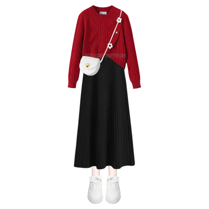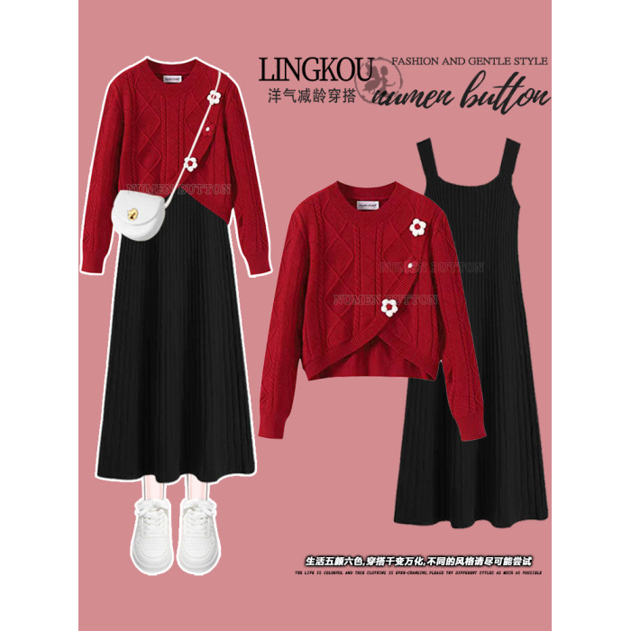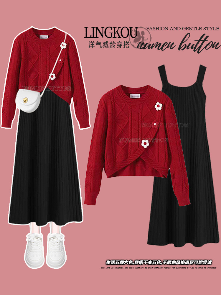 大碼女春秋新年套裝裙胖mm顯瘦遮肉過年聖誕紅色毛衣連衣裙兩件套