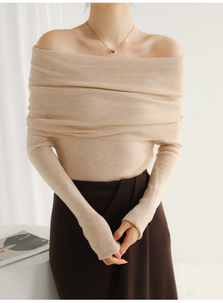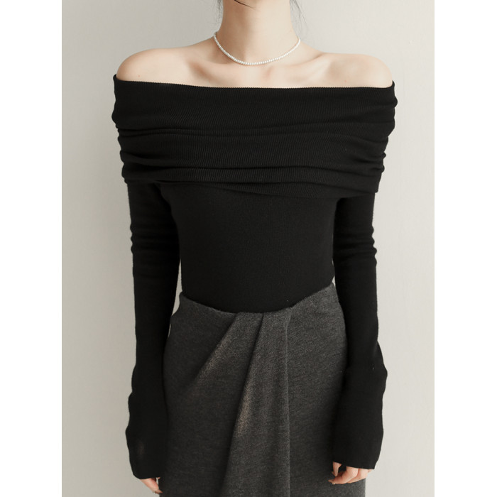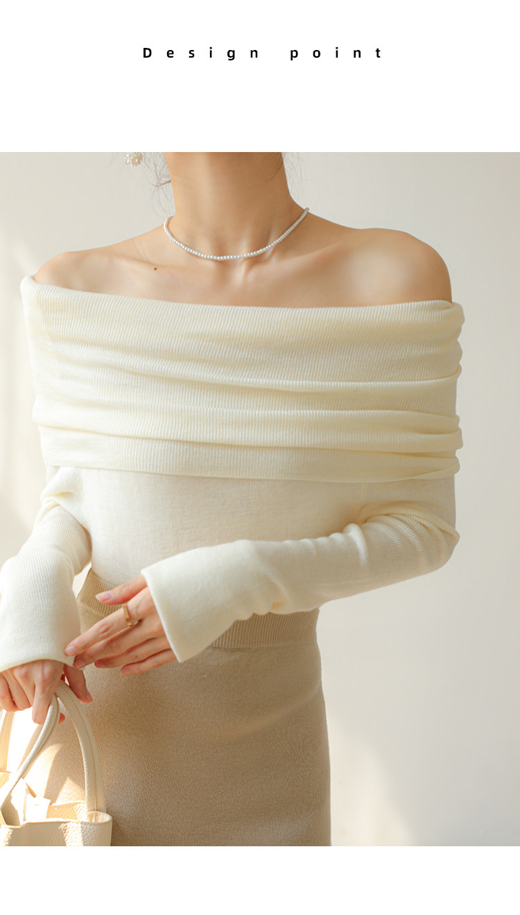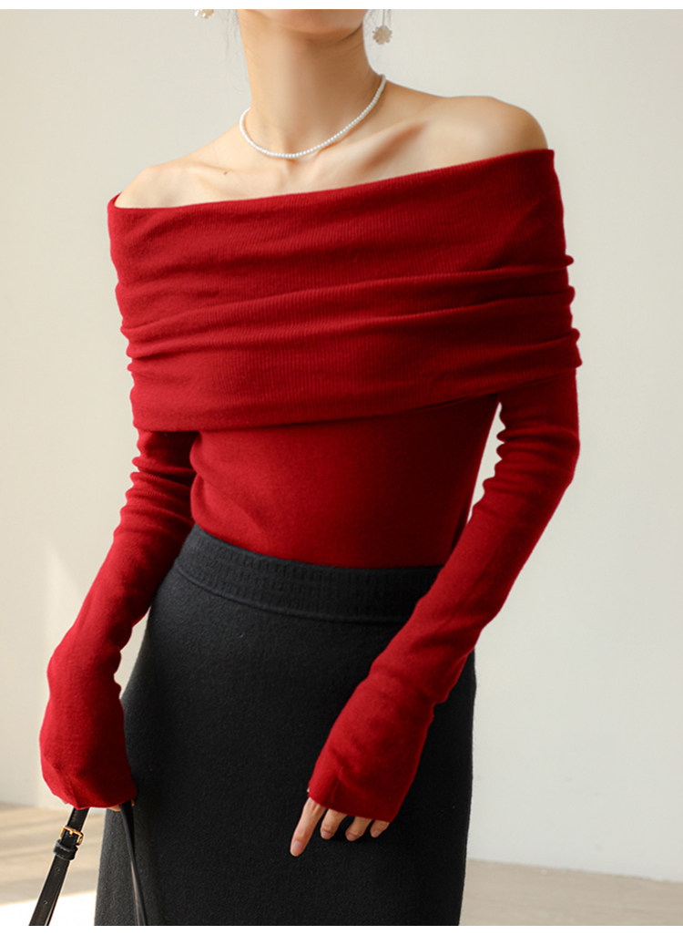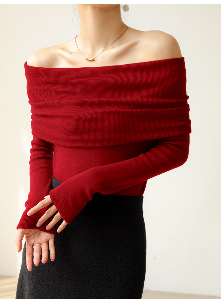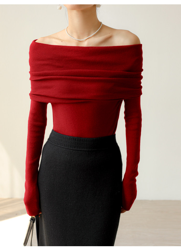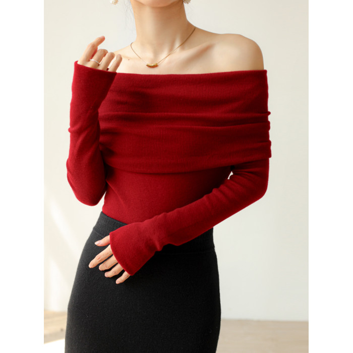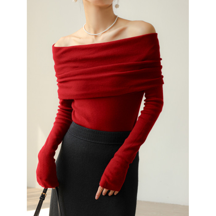 聖誕紅色一字領露肩毛衣女秋冬修身羊毛針織衫設計感內搭外穿上衣