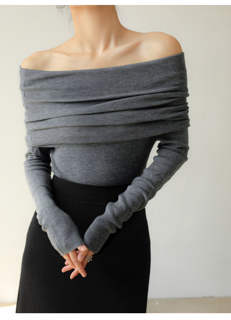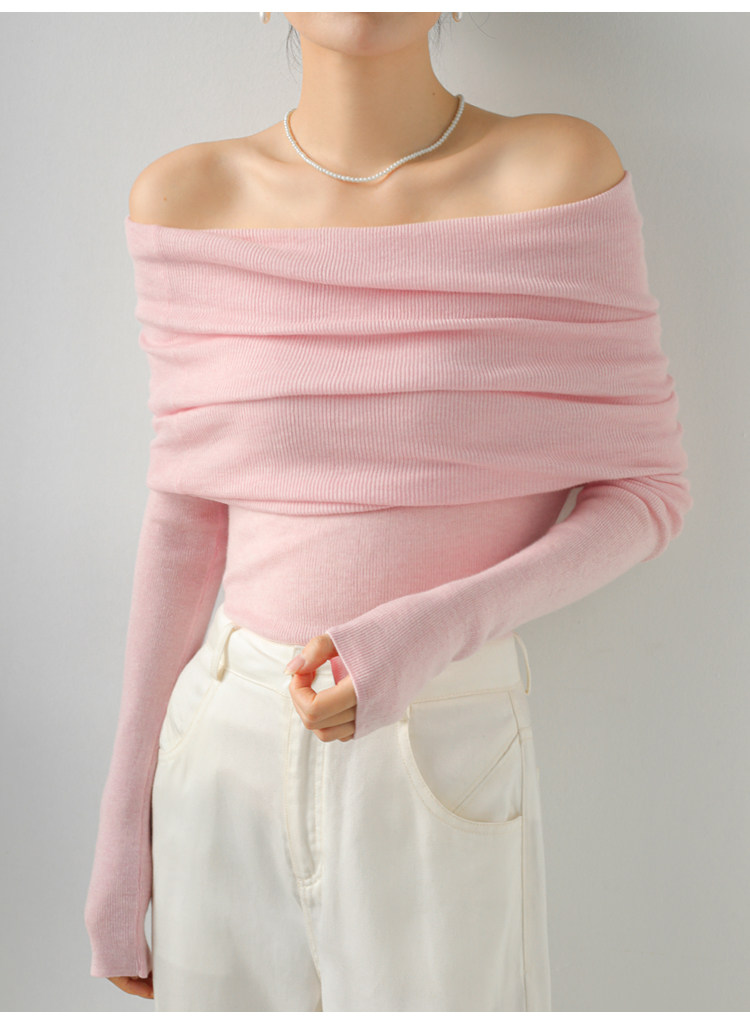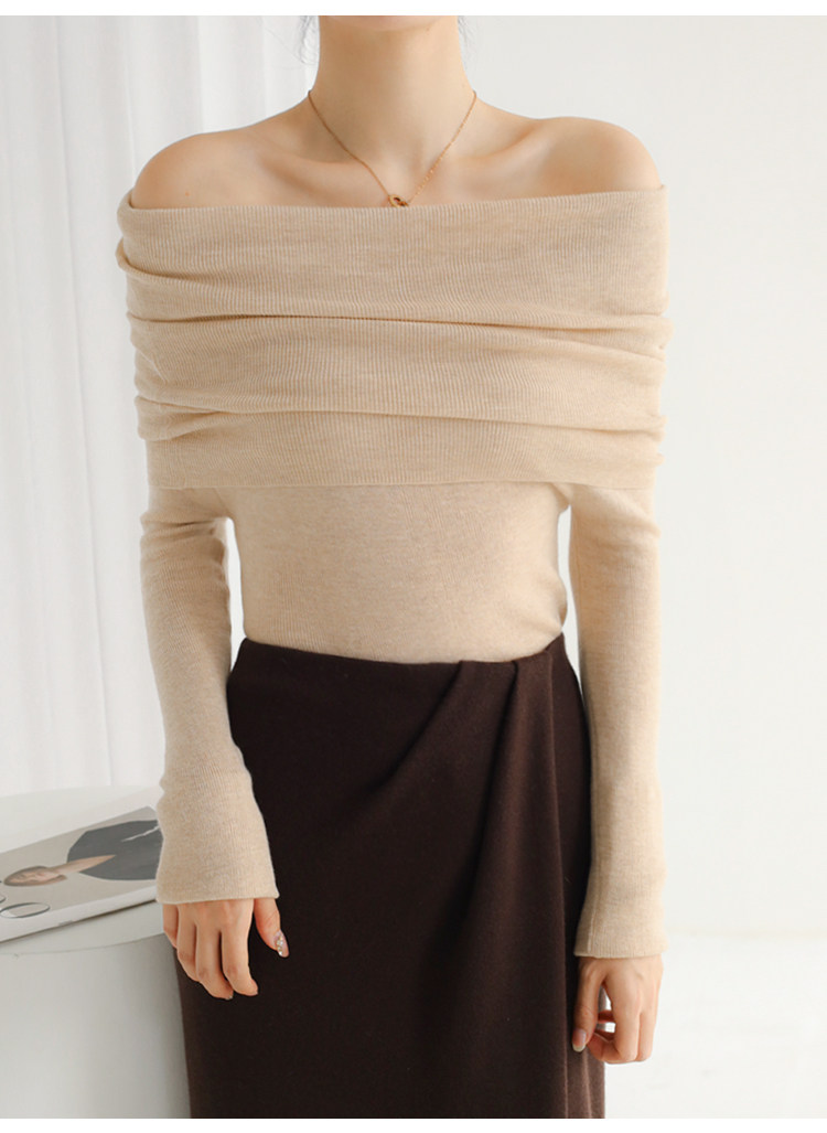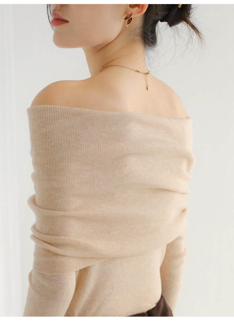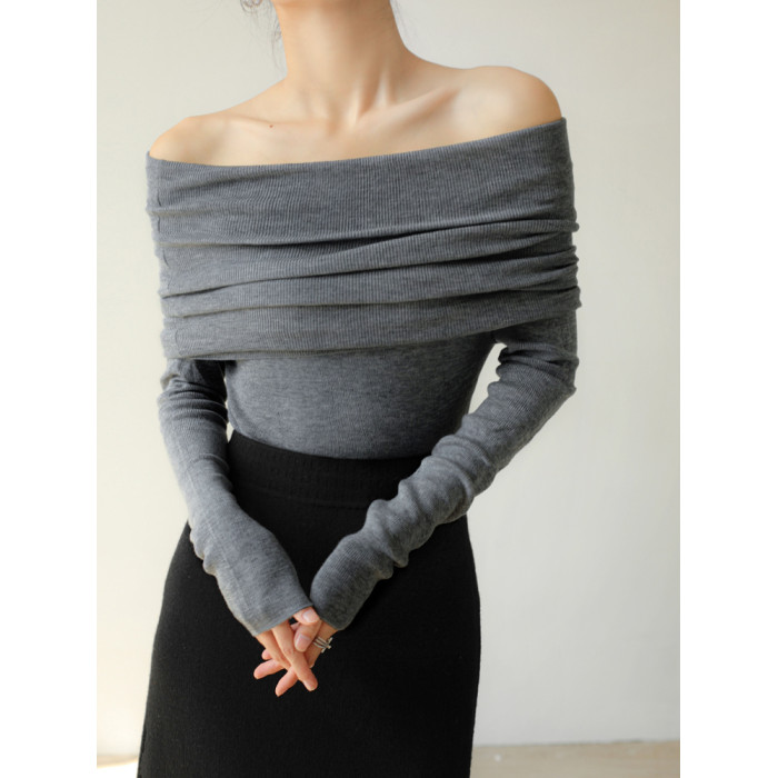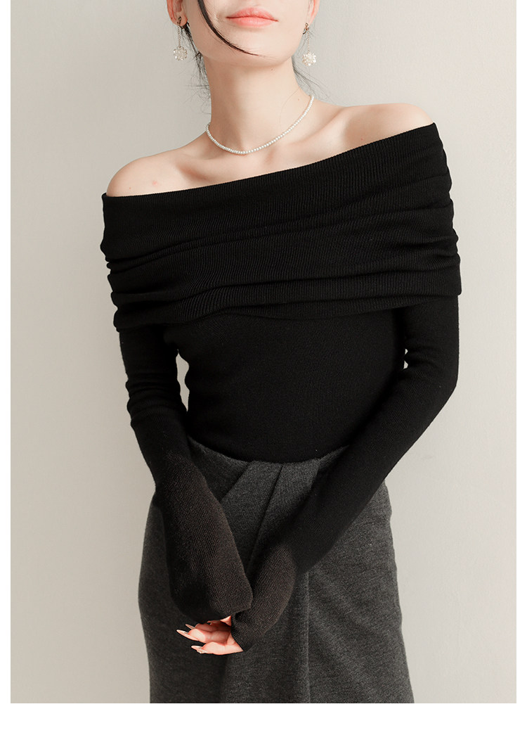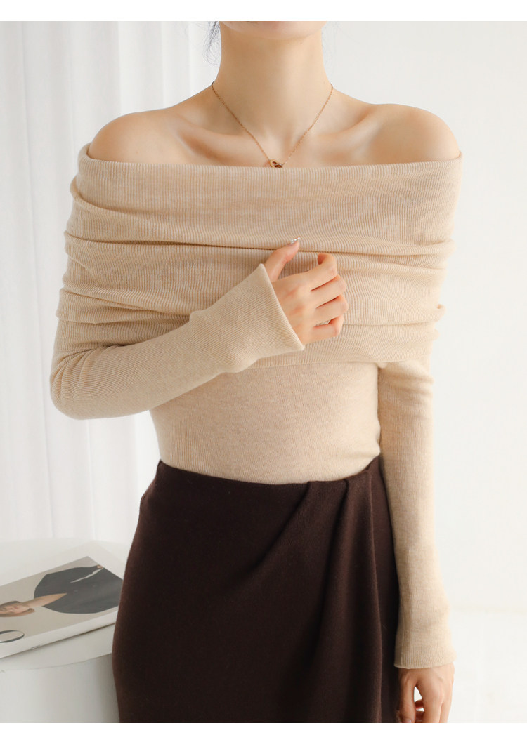 聖誕紅色一字領露肩毛衣女秋冬修身羊毛針織衫設計感內搭外穿上衣
