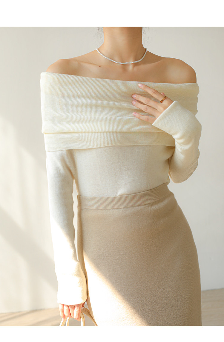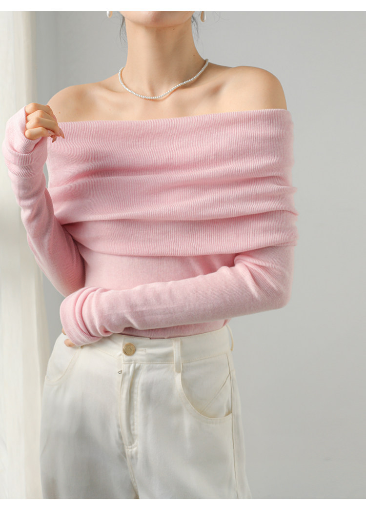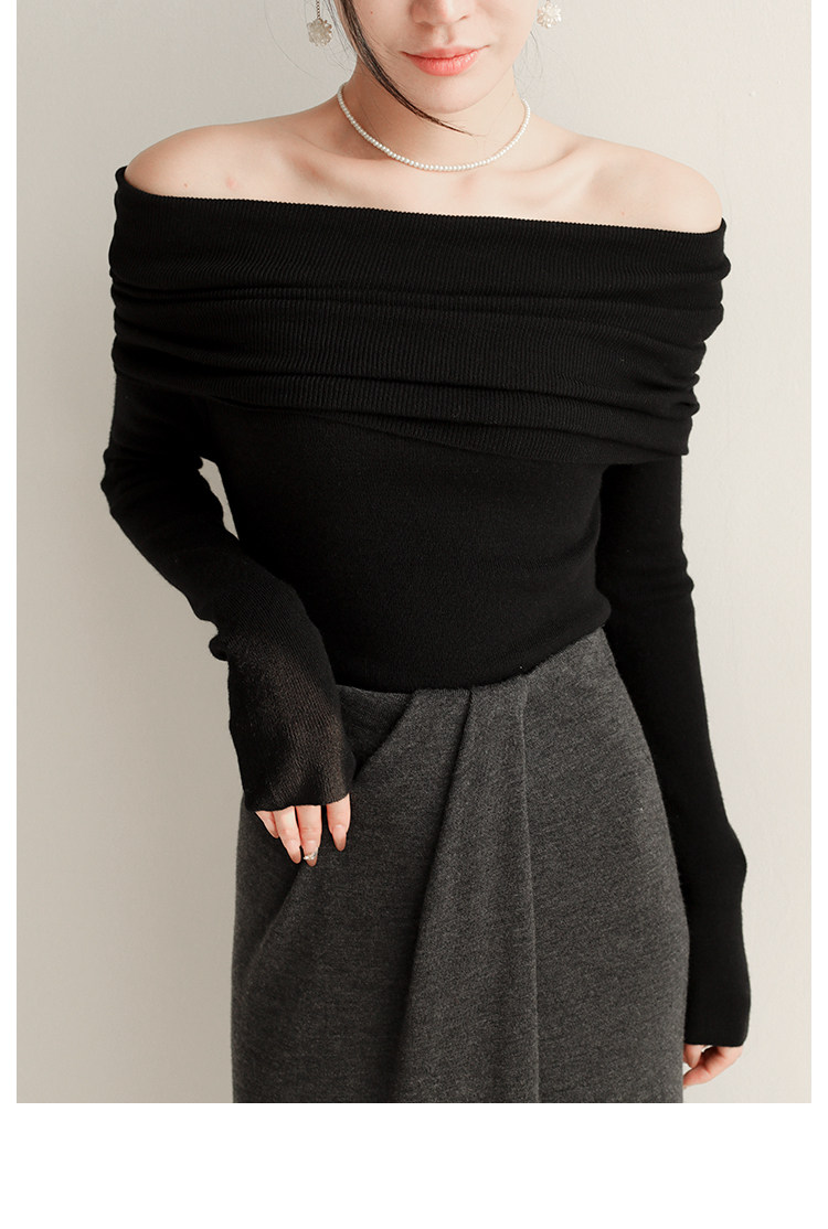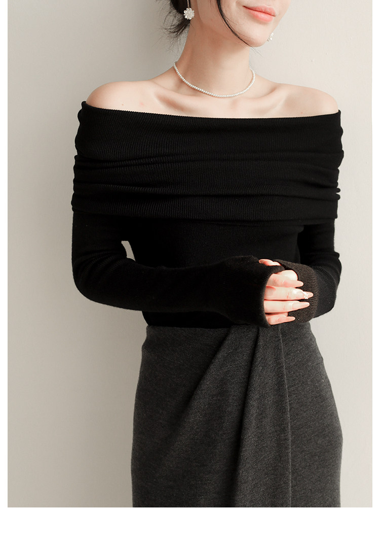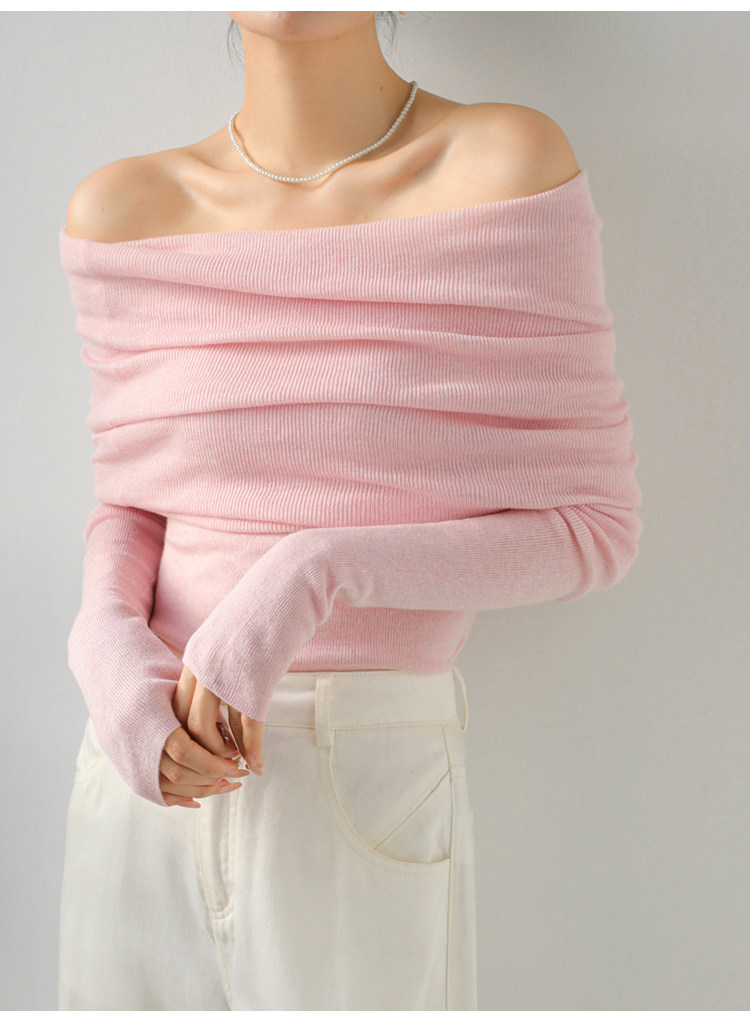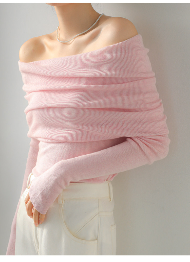 聖誕紅色一字領露肩毛衣女秋冬修身羊毛針織衫設計感內搭外穿上衣