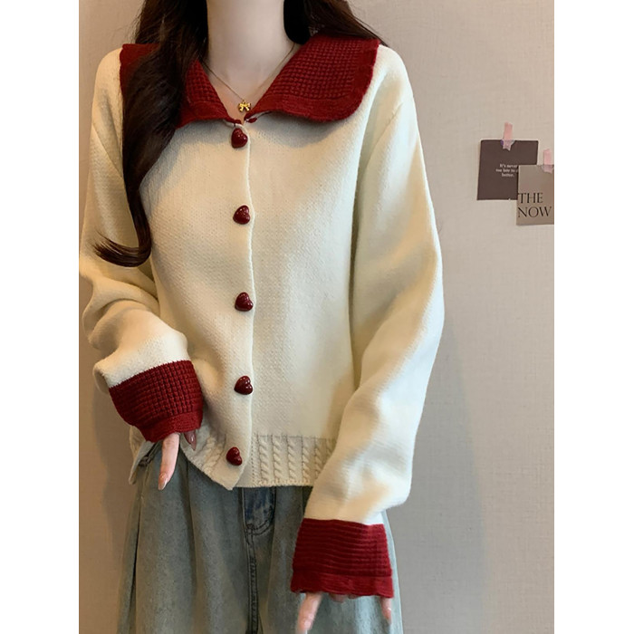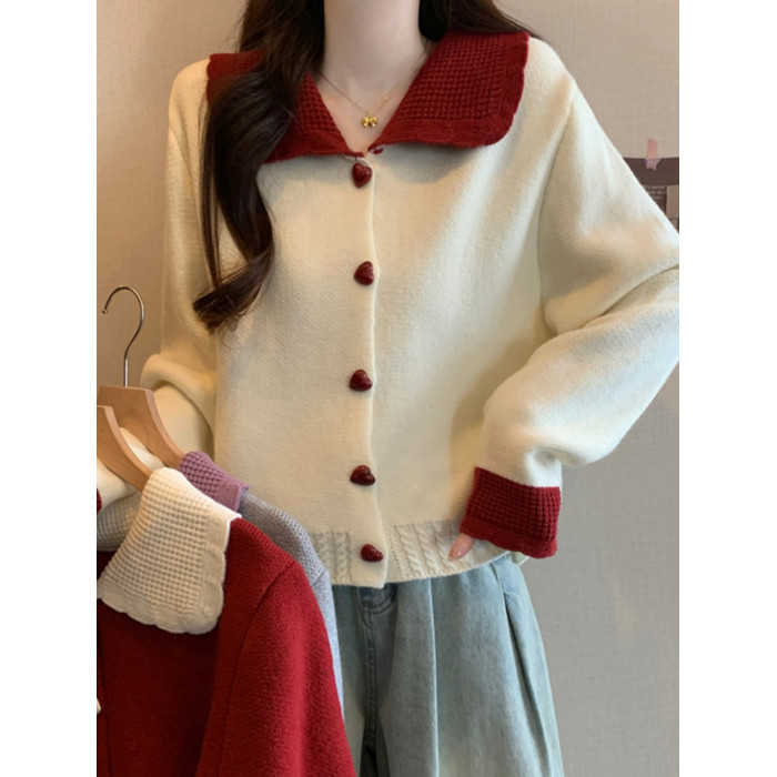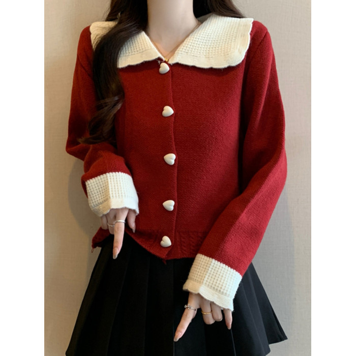 大碼小香風娃娃領聖誕紅色毛衣秋冬新款減齡針織衫胖MM短款上衣女