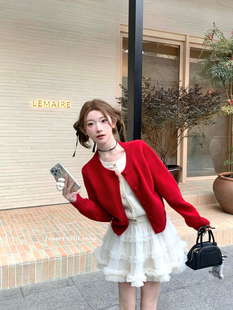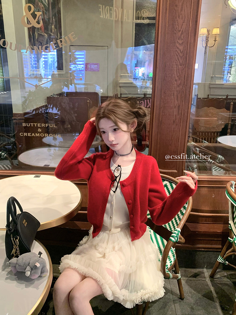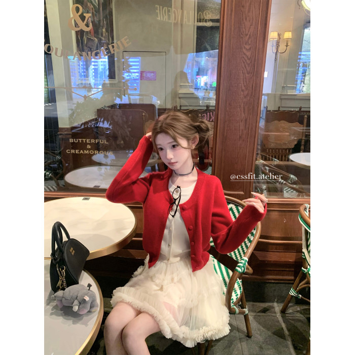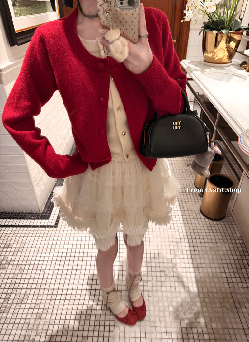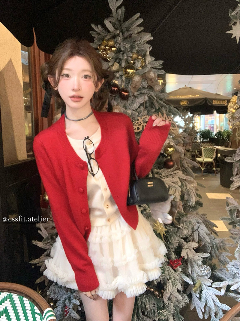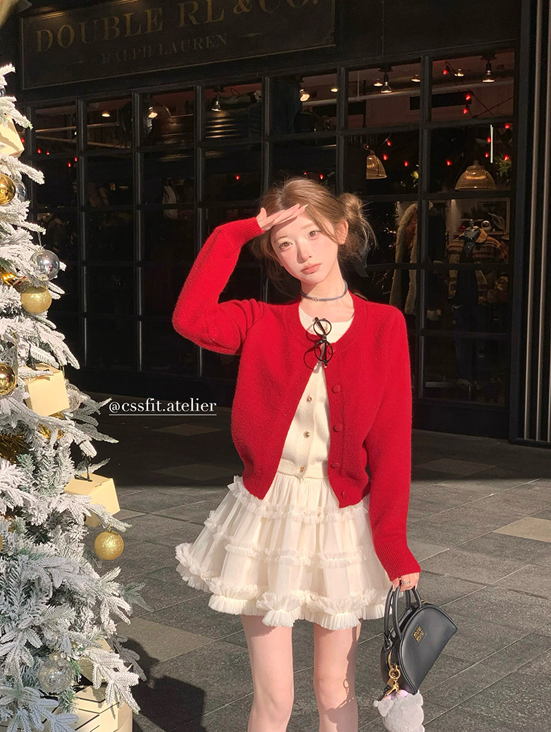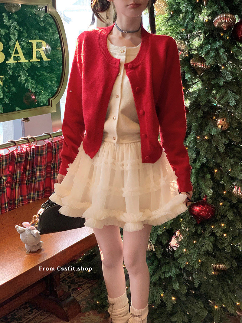 遲繖繖 節日限定番 新年聖誕紅色假兩件曡穿針織開衫白色紗裙短裙
