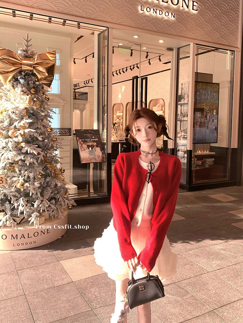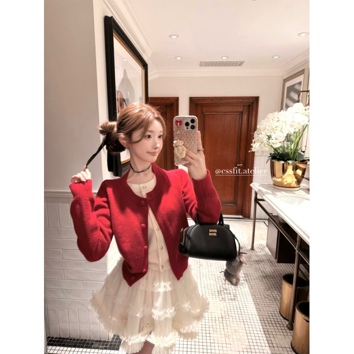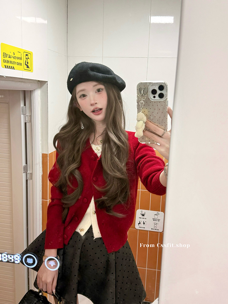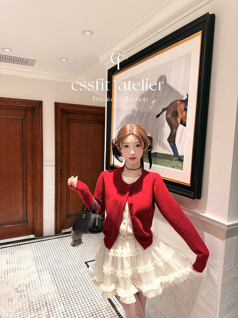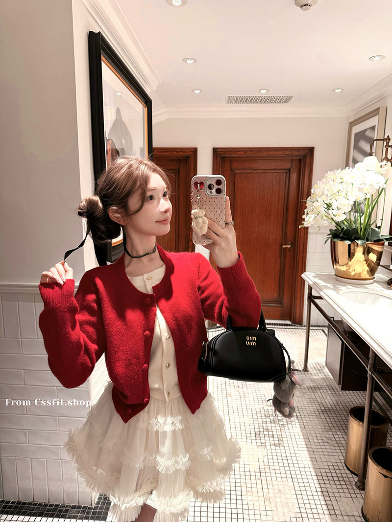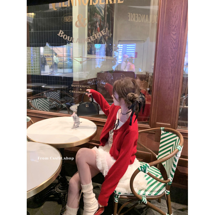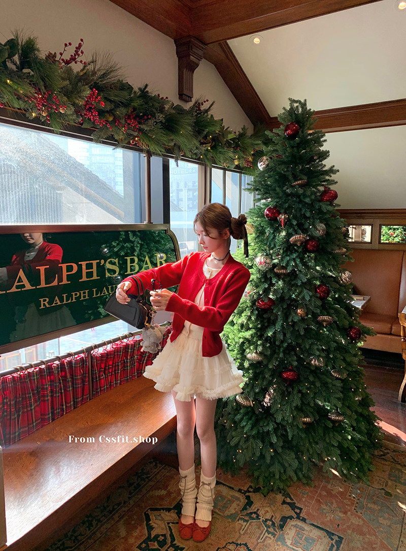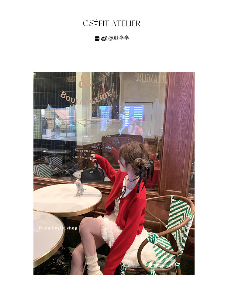 遲繖繖 節日限定番 新年聖誕紅色假兩件曡穿針織開衫白色紗裙短裙