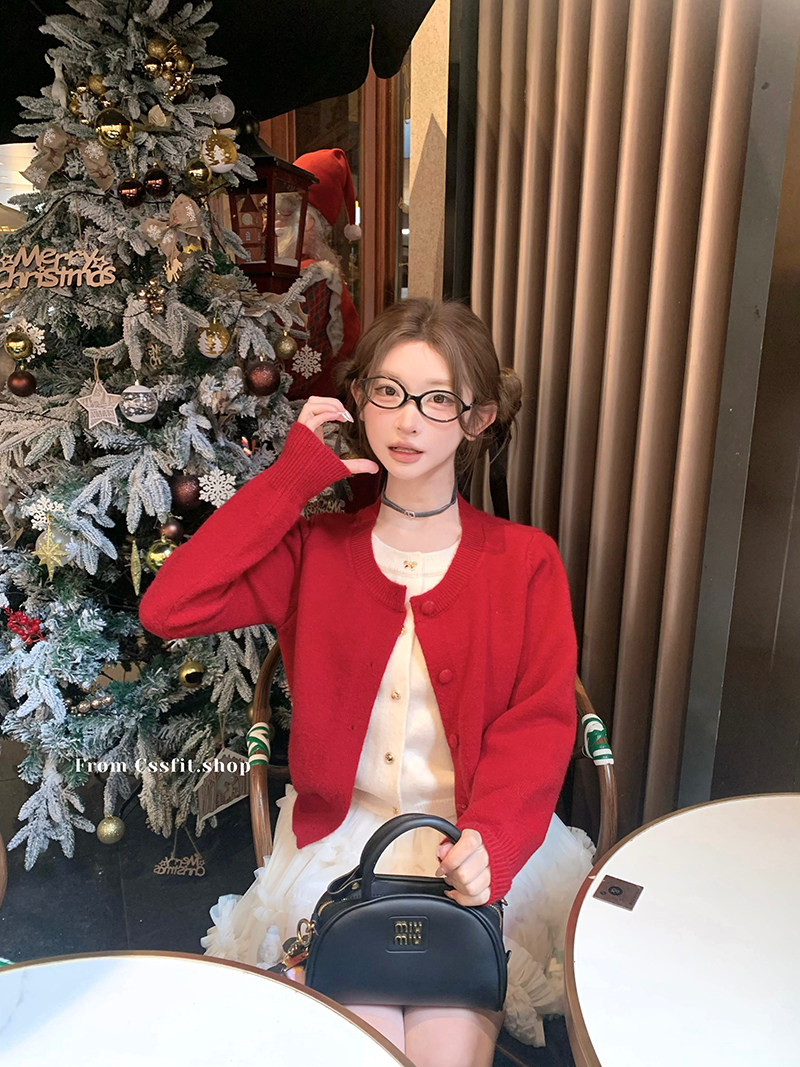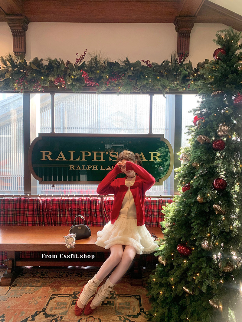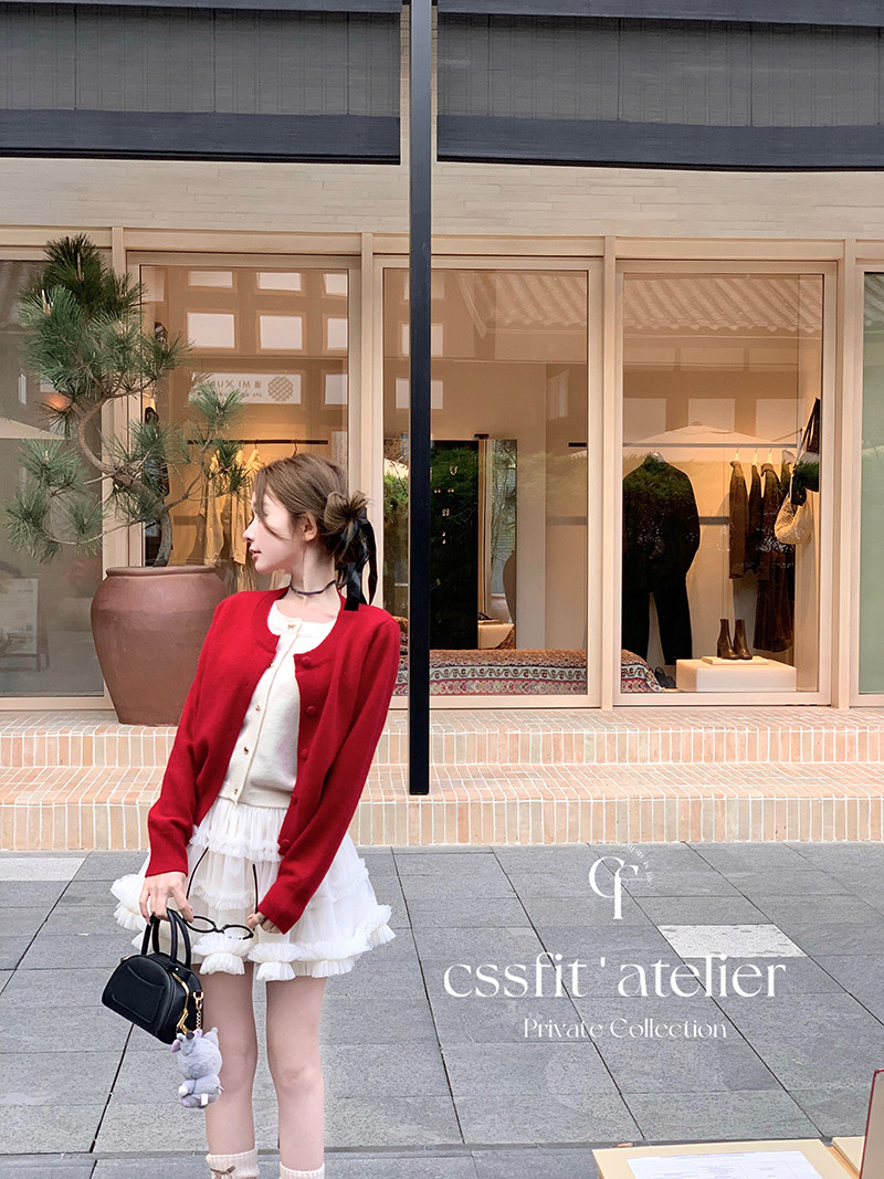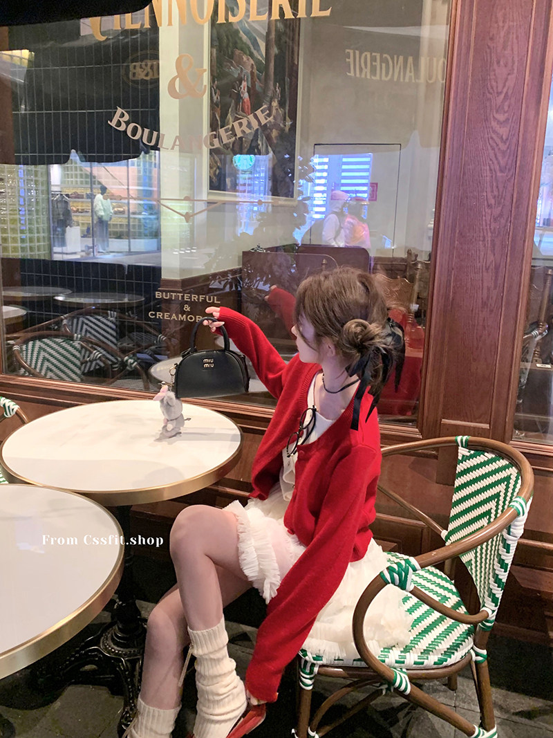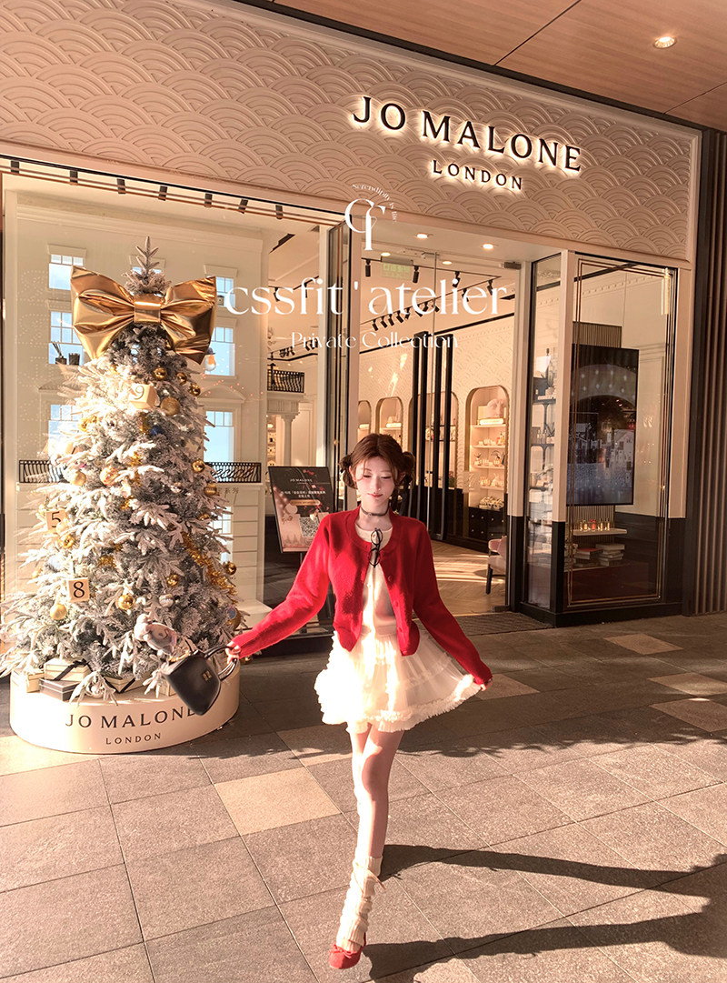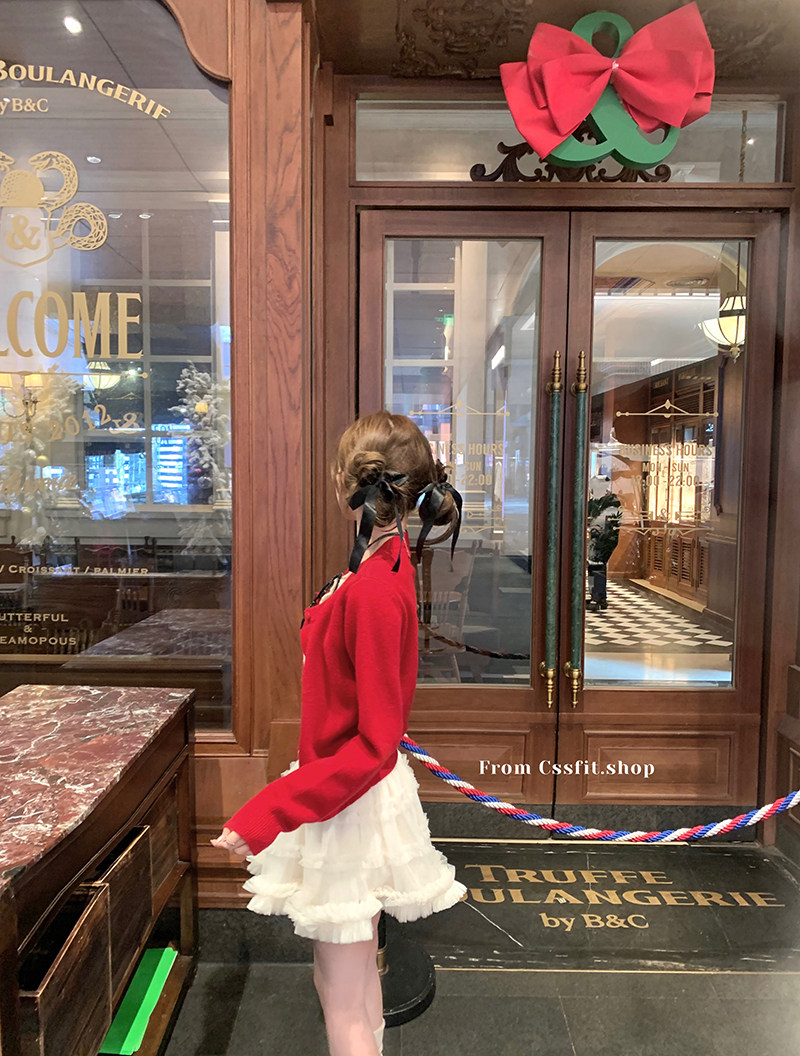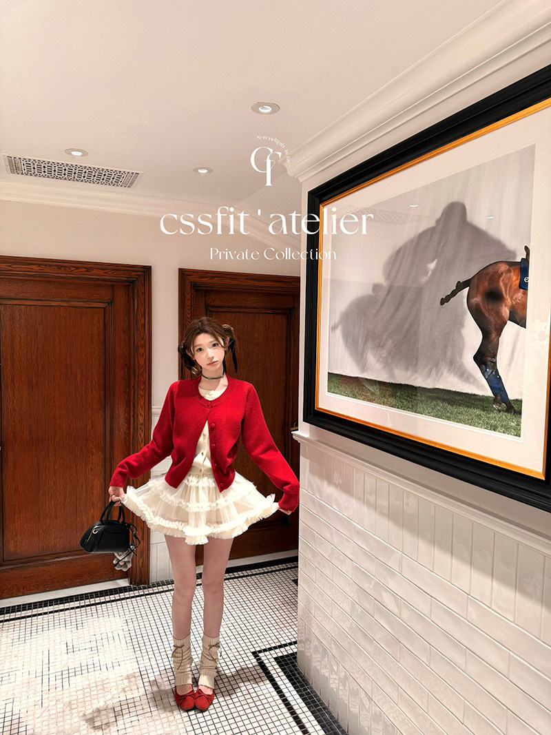 遲繖繖 節日限定番 新年聖誕紅色假兩件曡穿針織開衫白色紗裙短裙