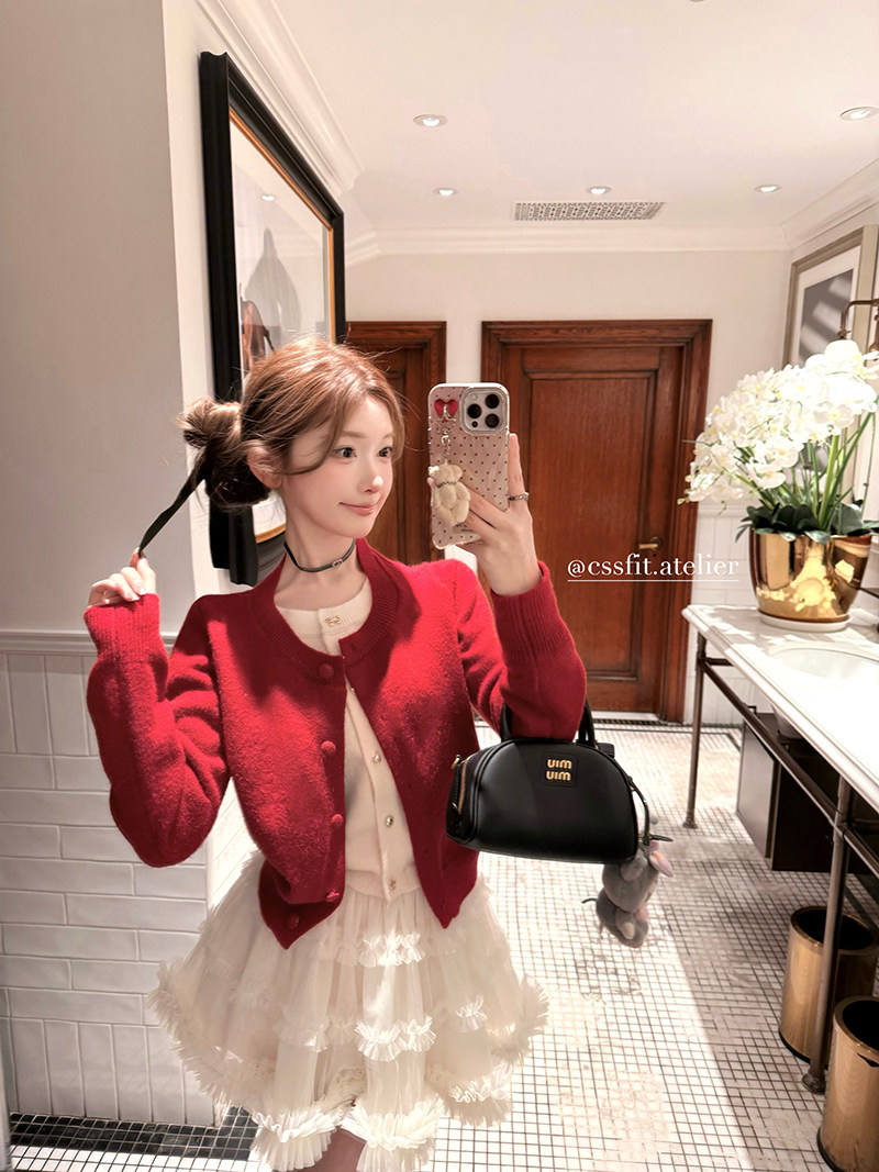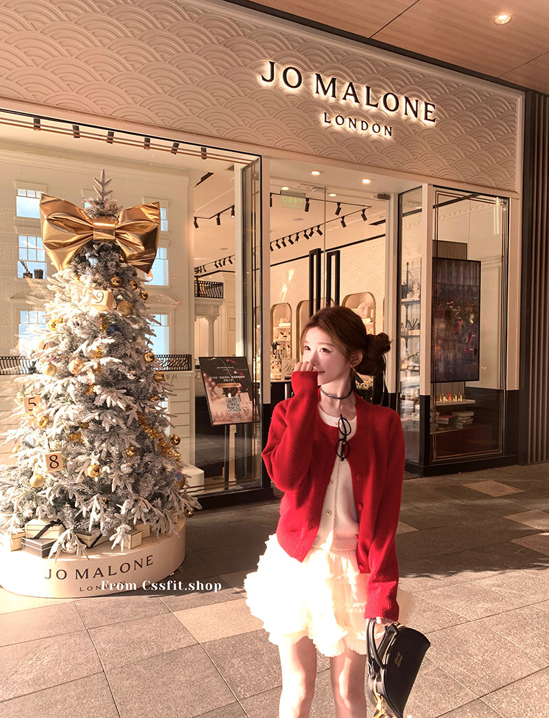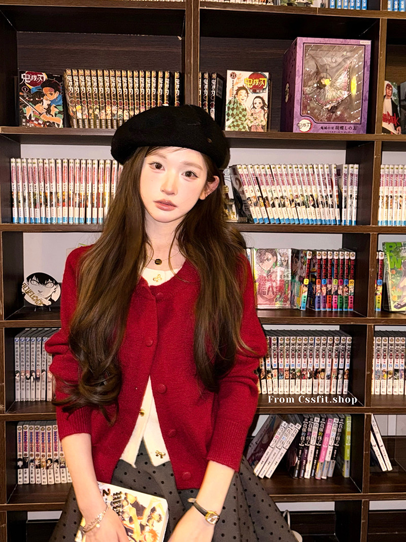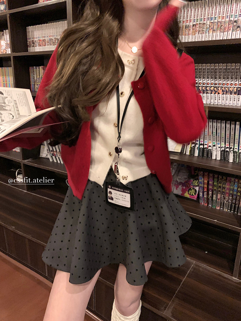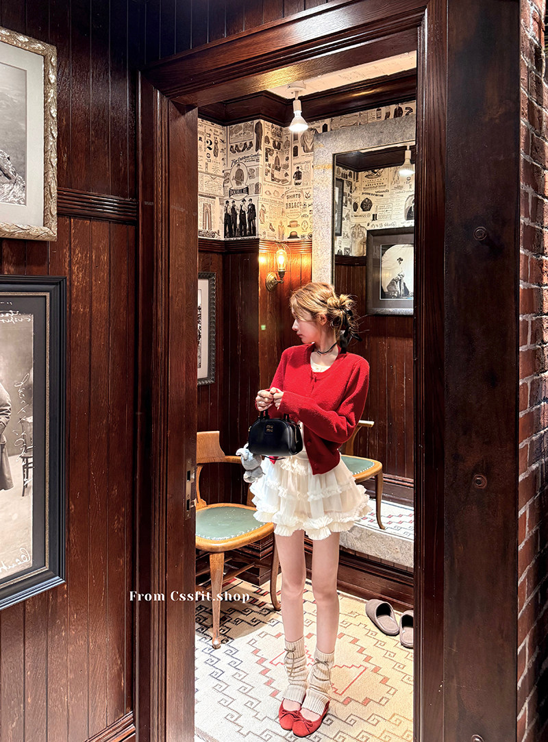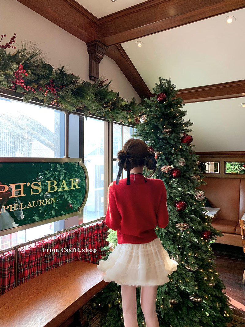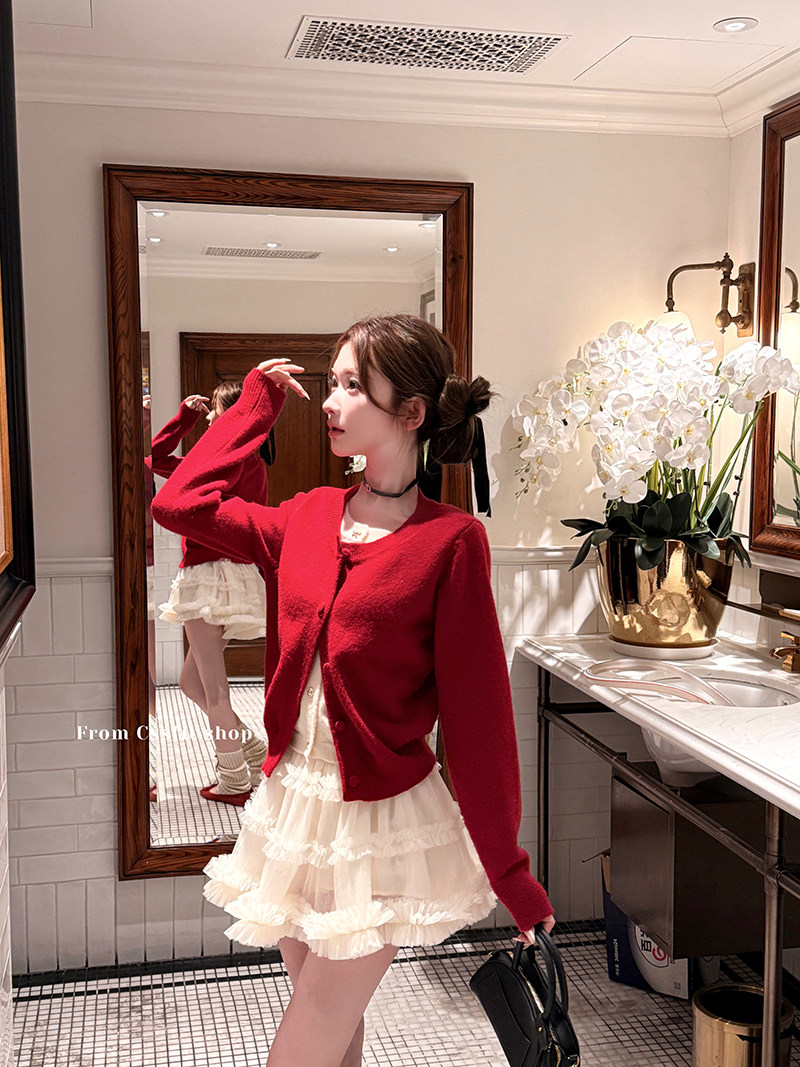 遲繖繖 節日限定番 新年聖誕紅色假兩件曡穿針織開衫白色紗裙短裙