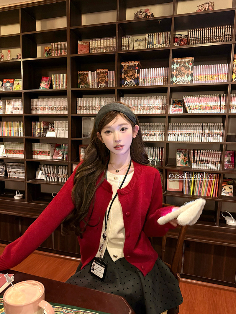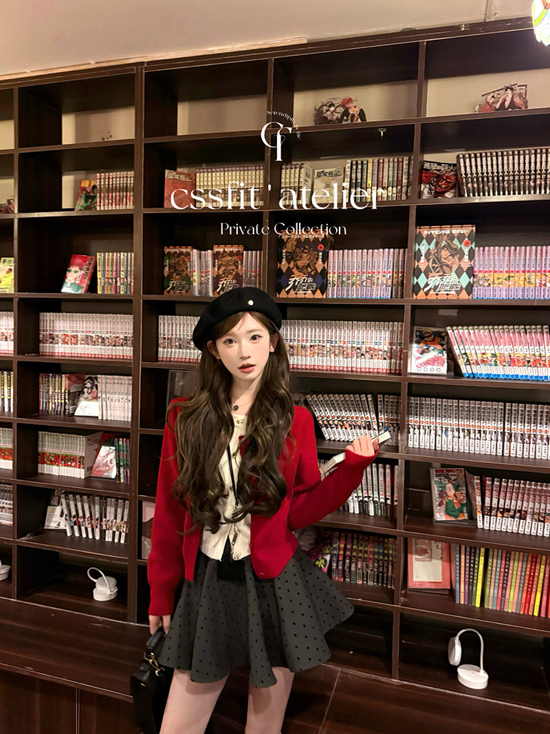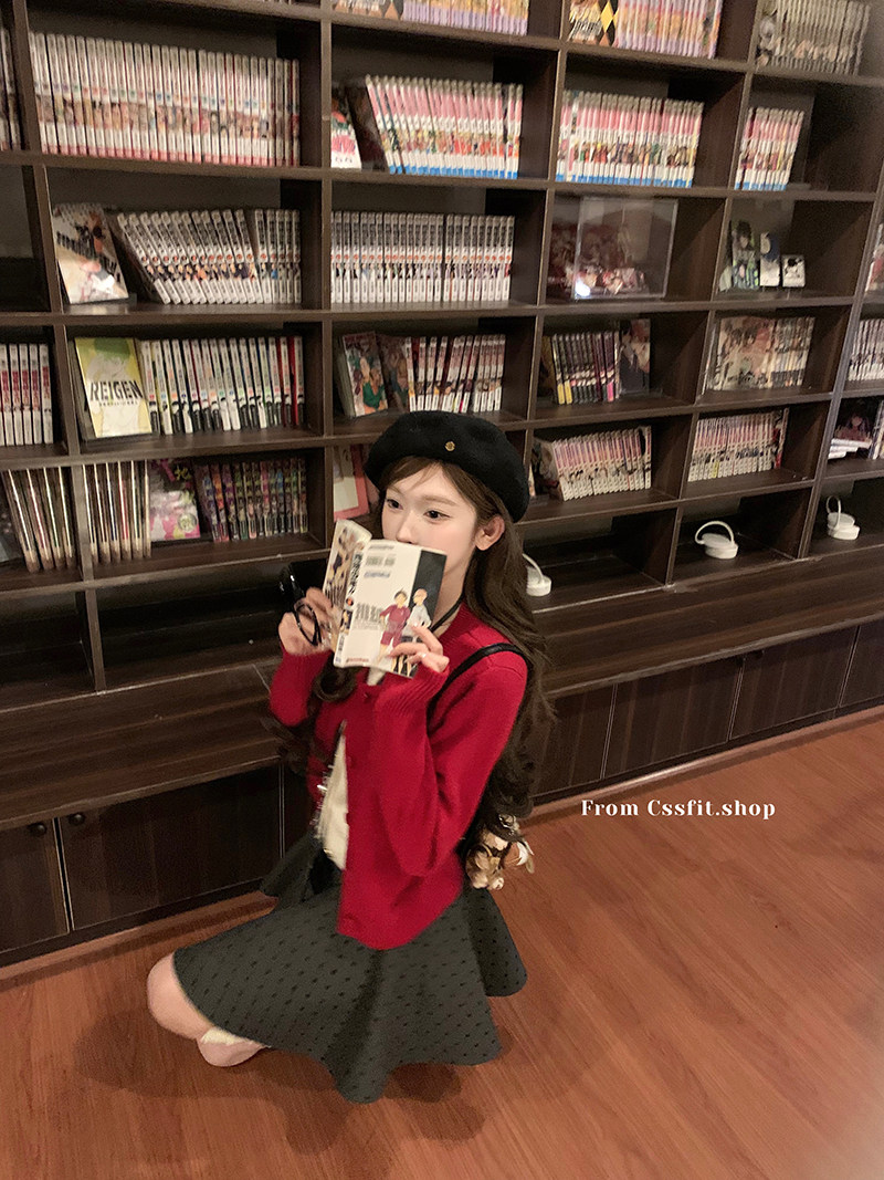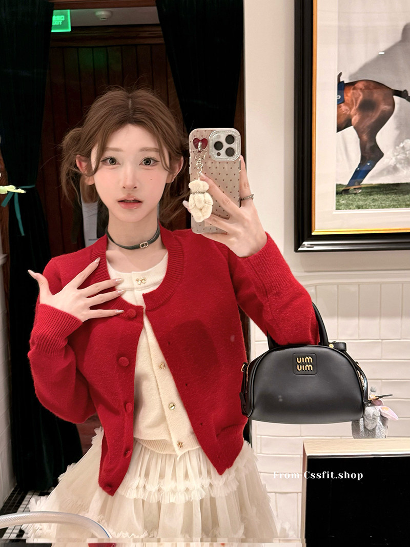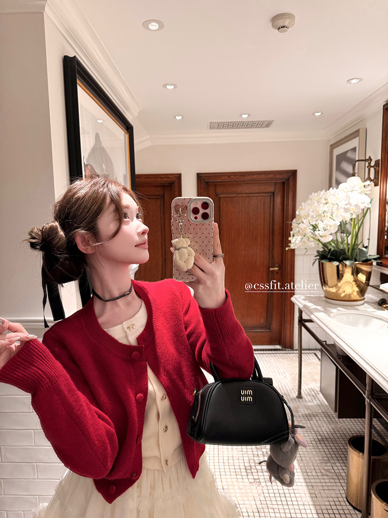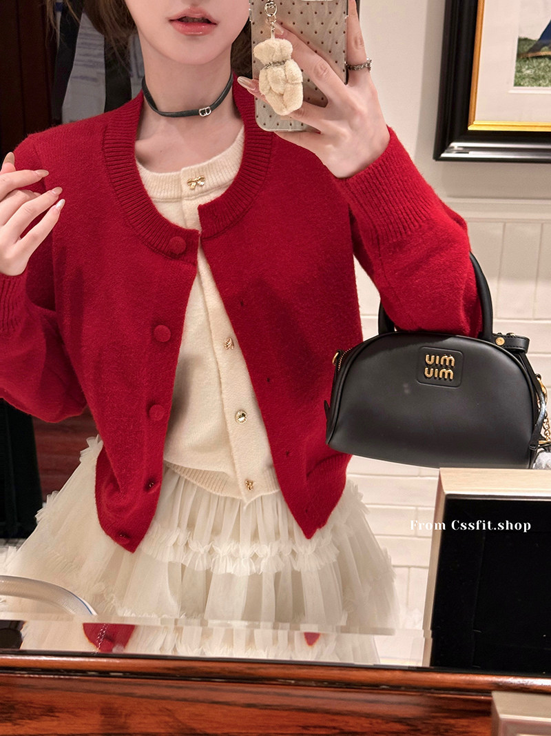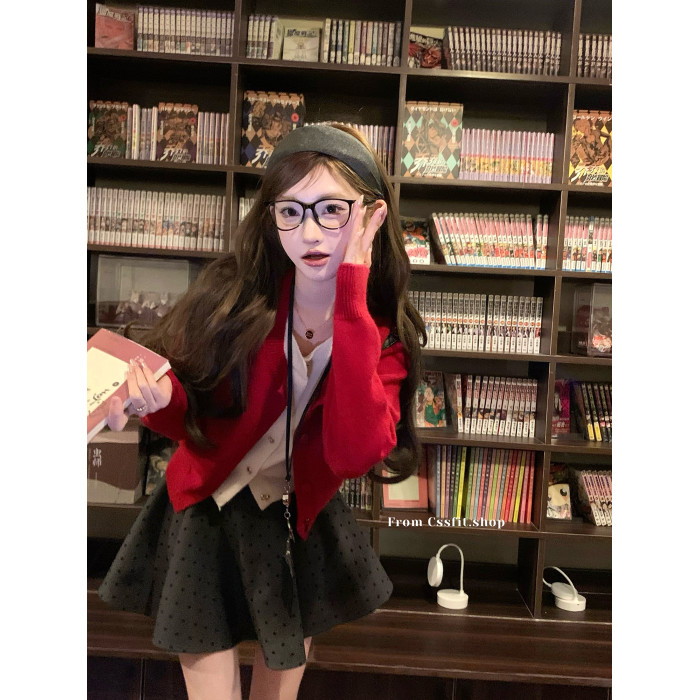 遲繖繖 節日限定番 新年聖誕紅色假兩件曡穿針織開衫白色紗裙短裙