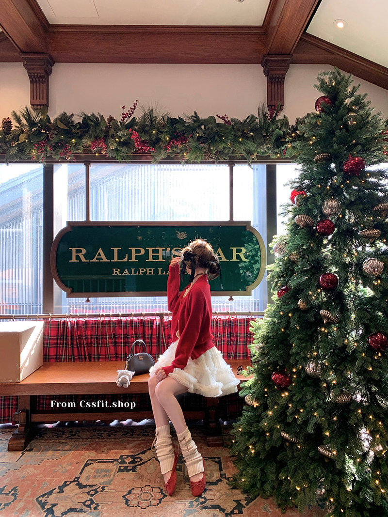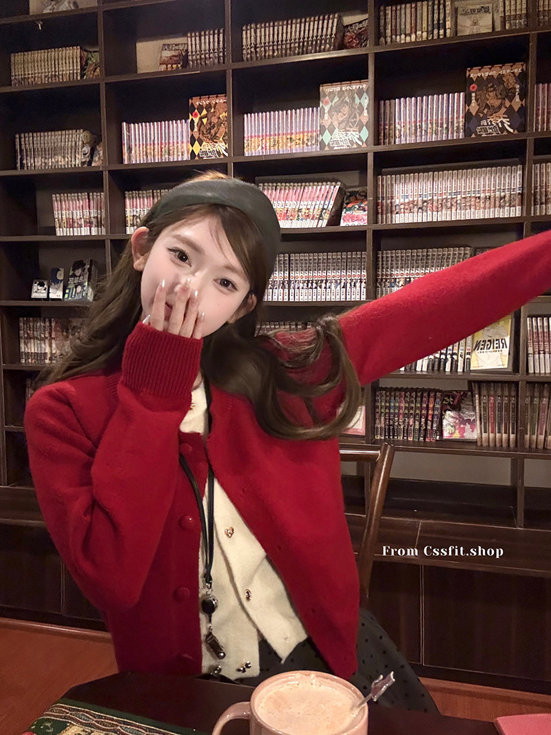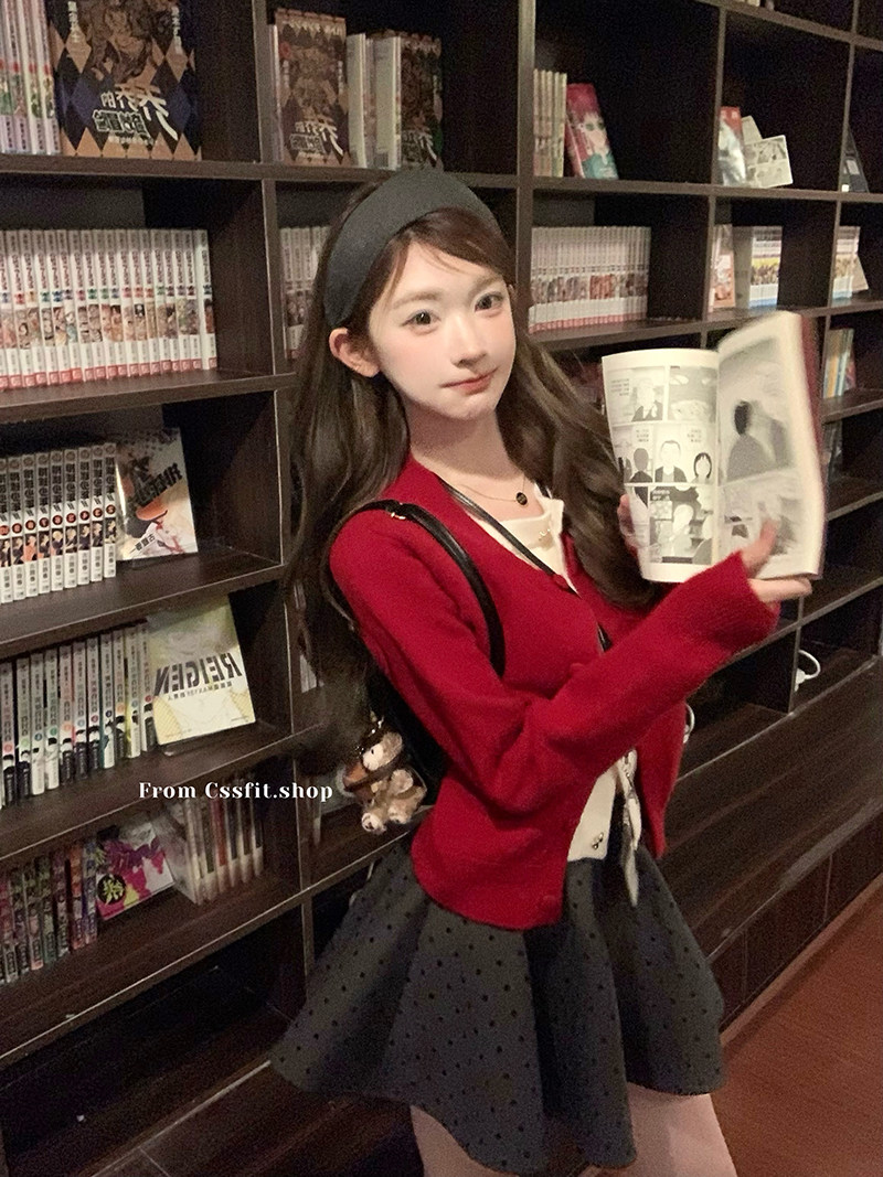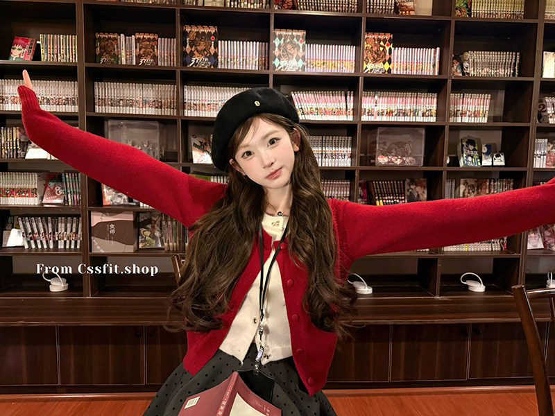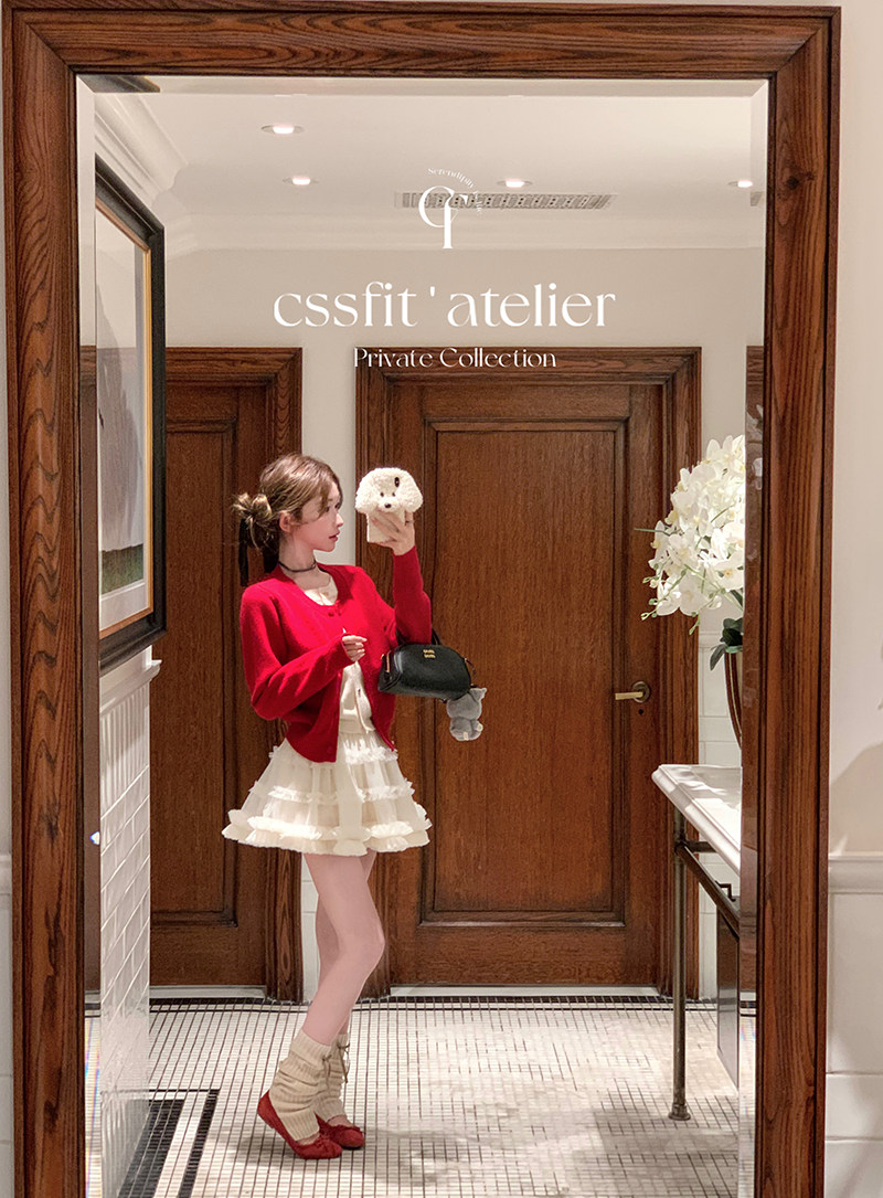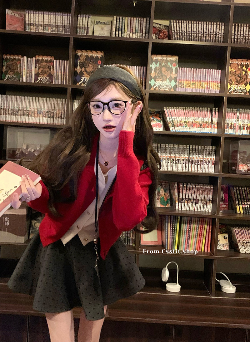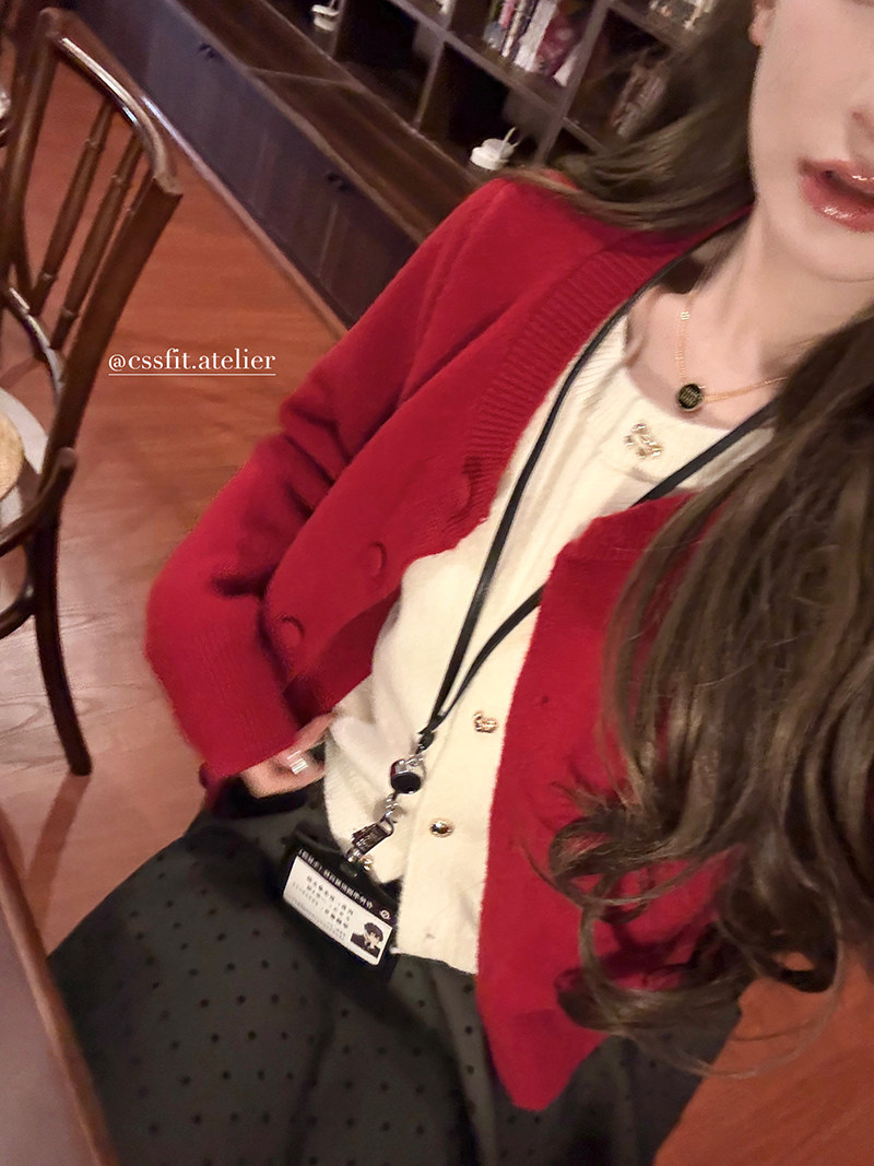 遲繖繖 節日限定番 新年聖誕紅色假兩件曡穿針織開衫白色紗裙短裙