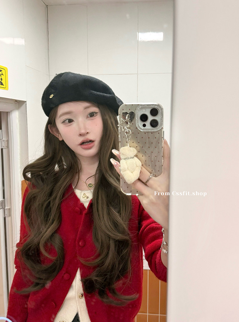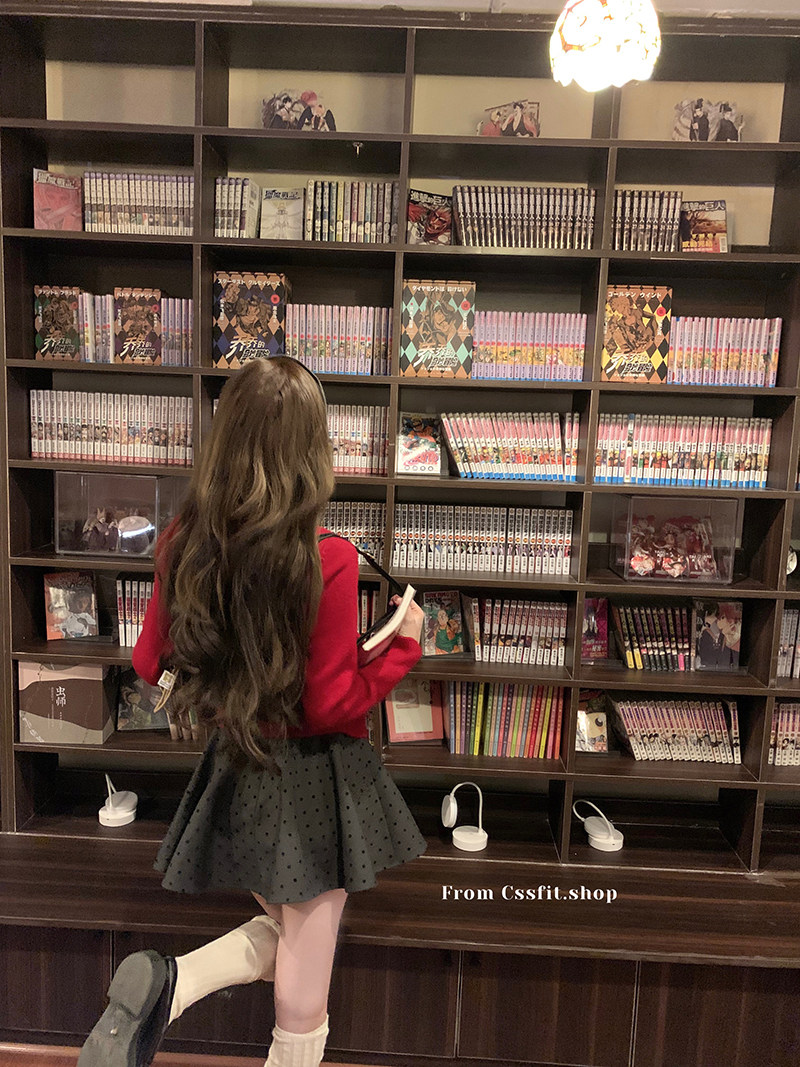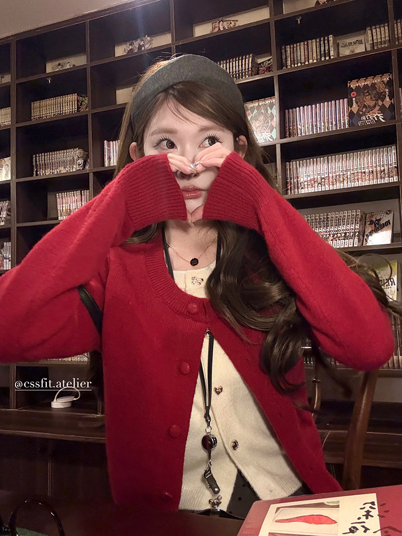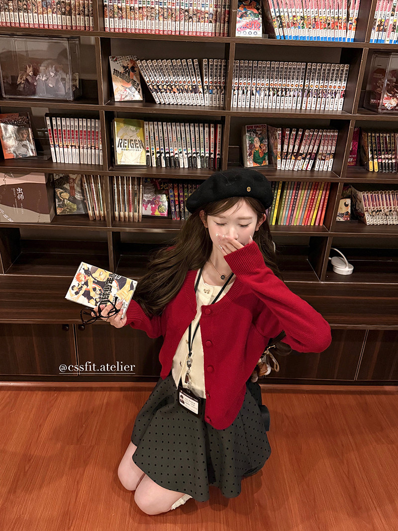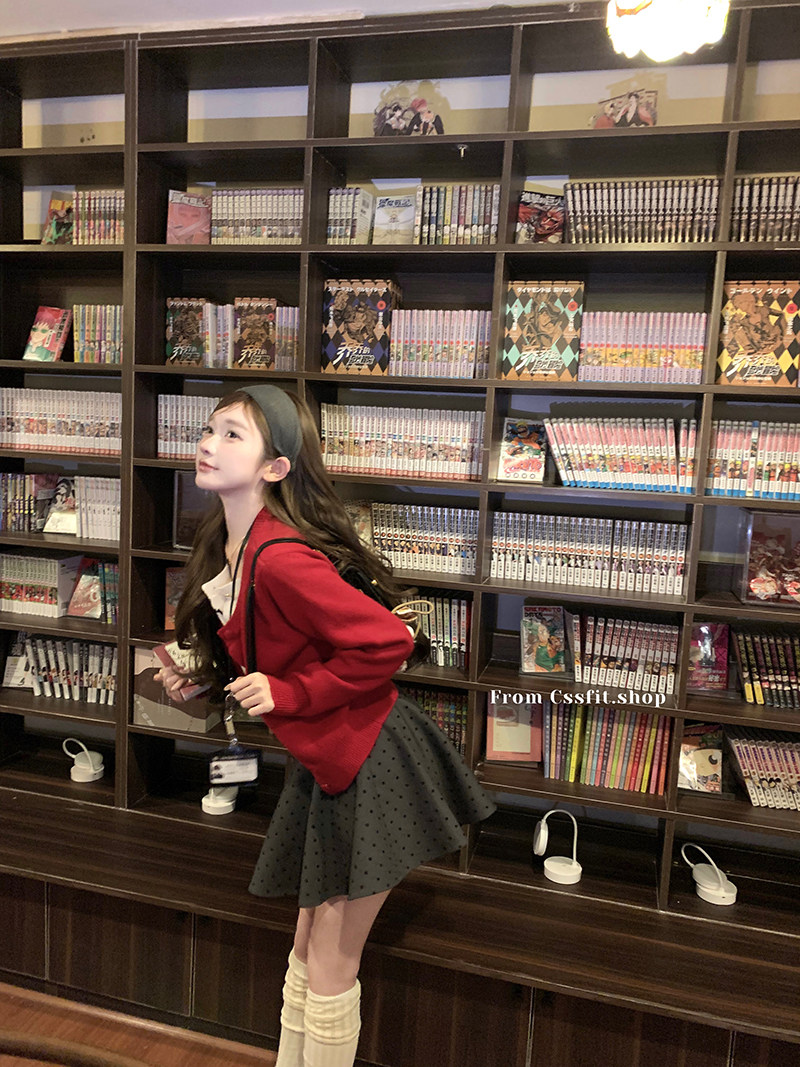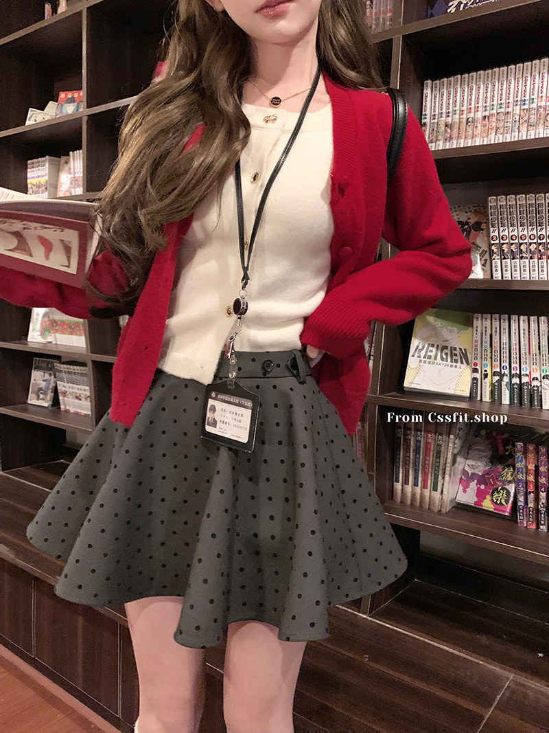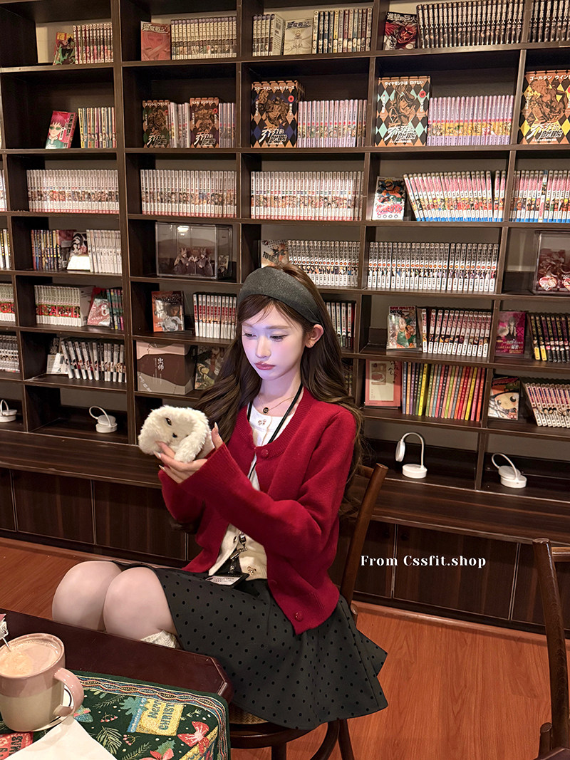 遲繖繖 節日限定番 新年聖誕紅色假兩件曡穿針織開衫白色紗裙短裙