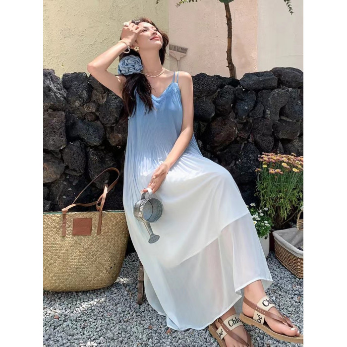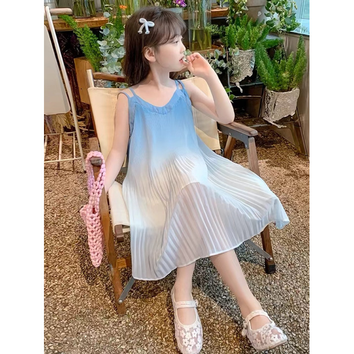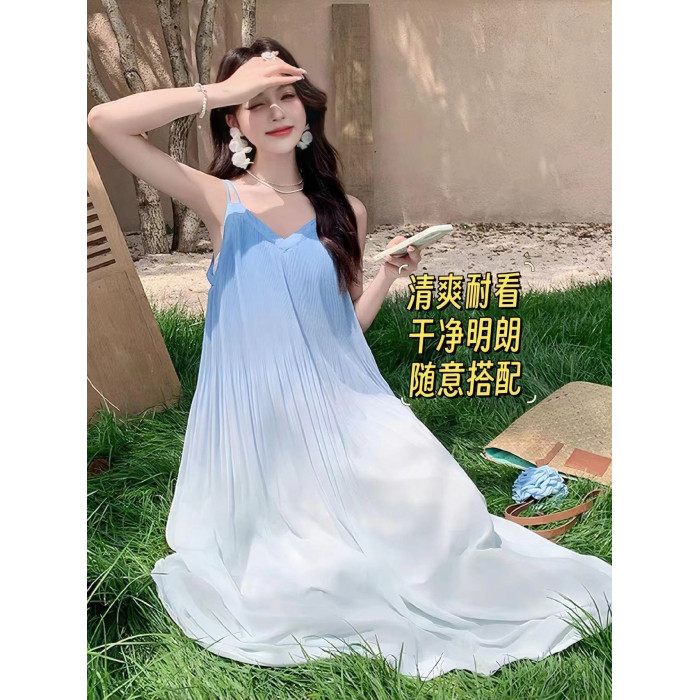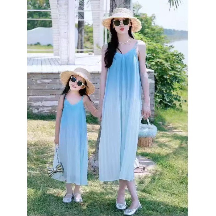法式親子裝漸變母女2025新款夏天海邊度假一家三口母子T恤吊帶裙