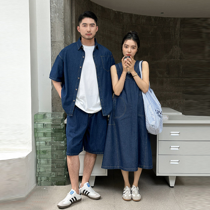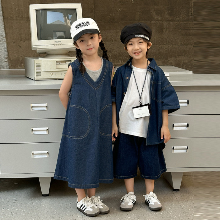 親子裝短袖2025夏季韓版一家三四口薄牛仔襯衫母女裝背心連衣裙潮