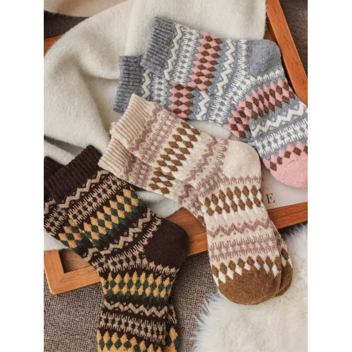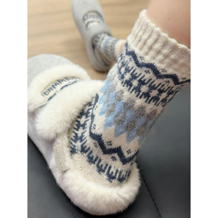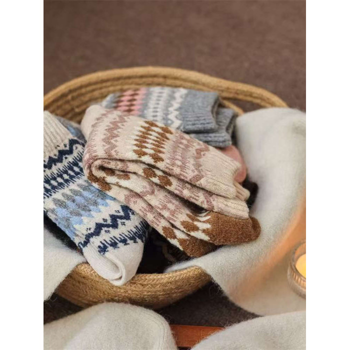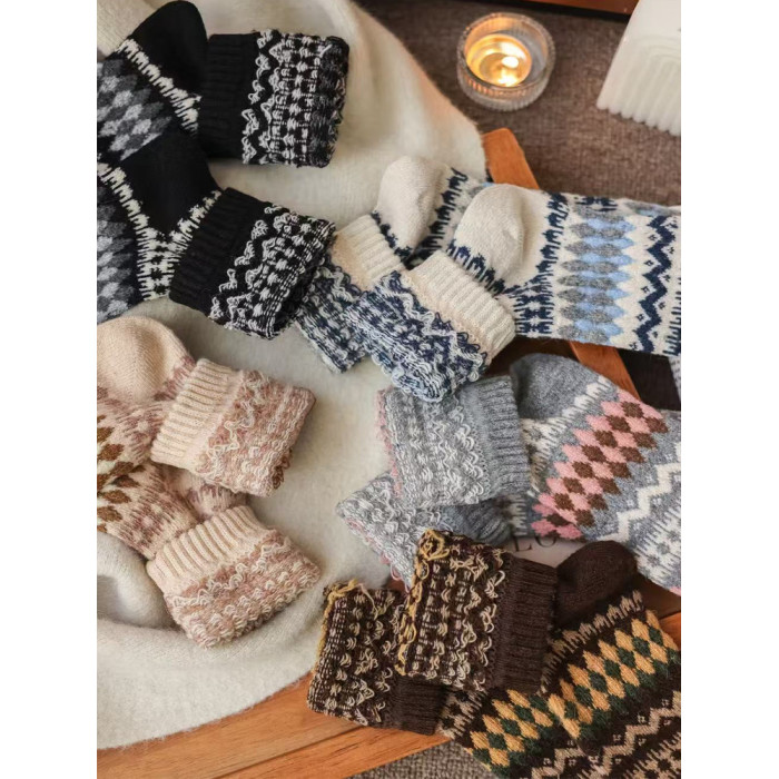 復古費爾島襪子女秋冬季中筒襪羊毛加絨加厚保暖冬天民族風長筒襪