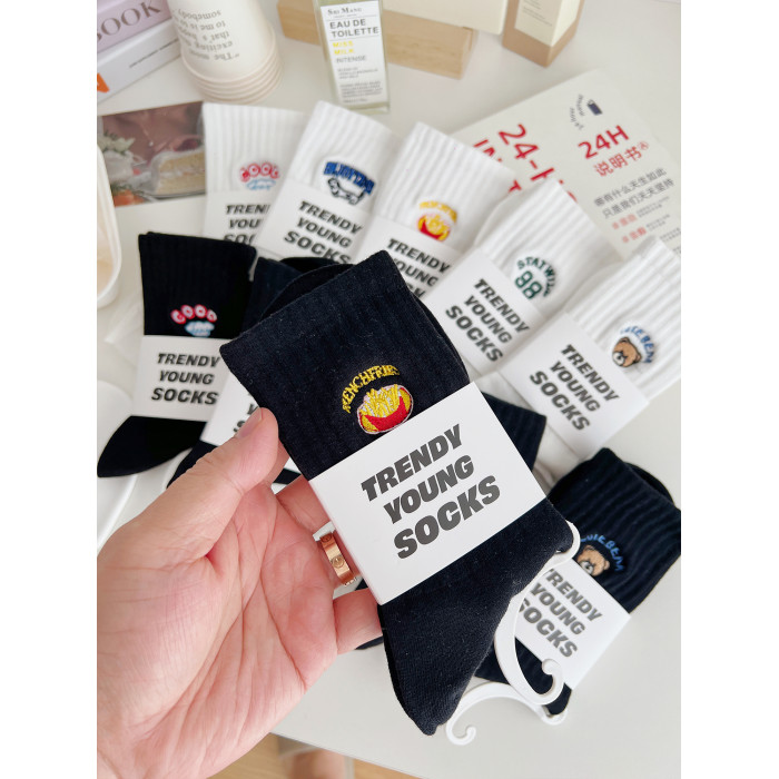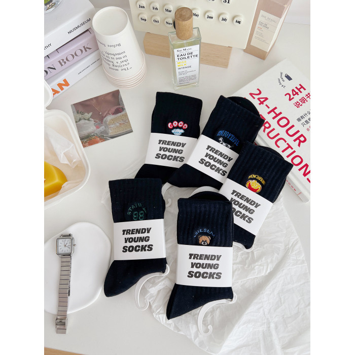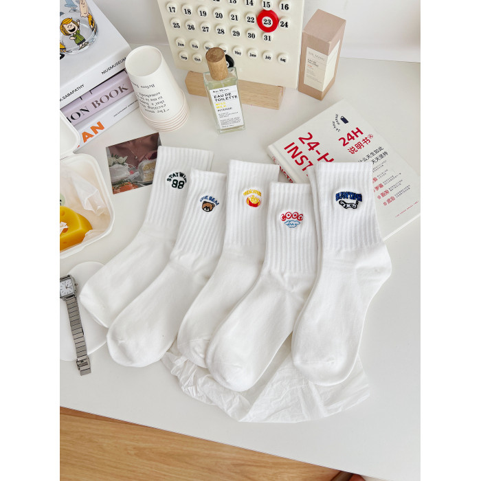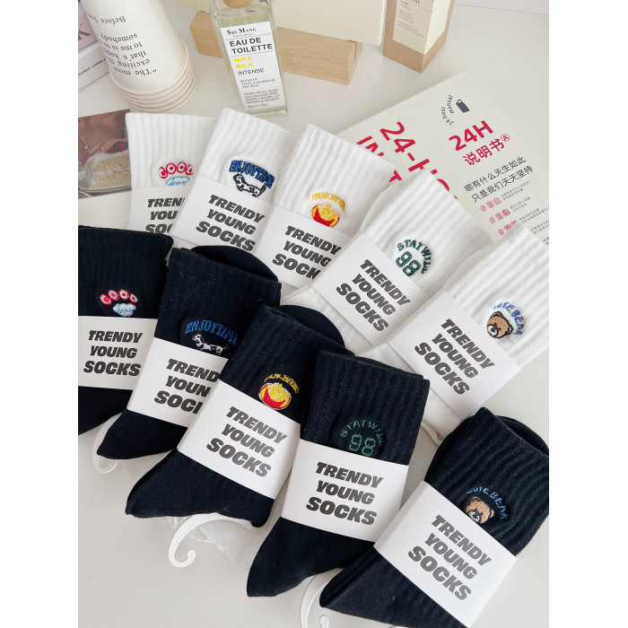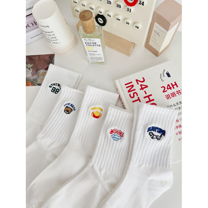 白色運動襪子女純棉中筒襪簡約日系卡通刺綉百搭黑色長襪ins春夏