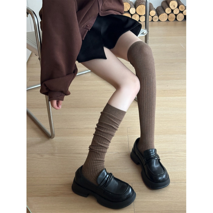 2025春秋長筒過膝堆堆襪女咖啡miu風曡穿竪條顯瘦配靴子的襪子棉