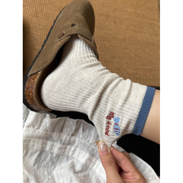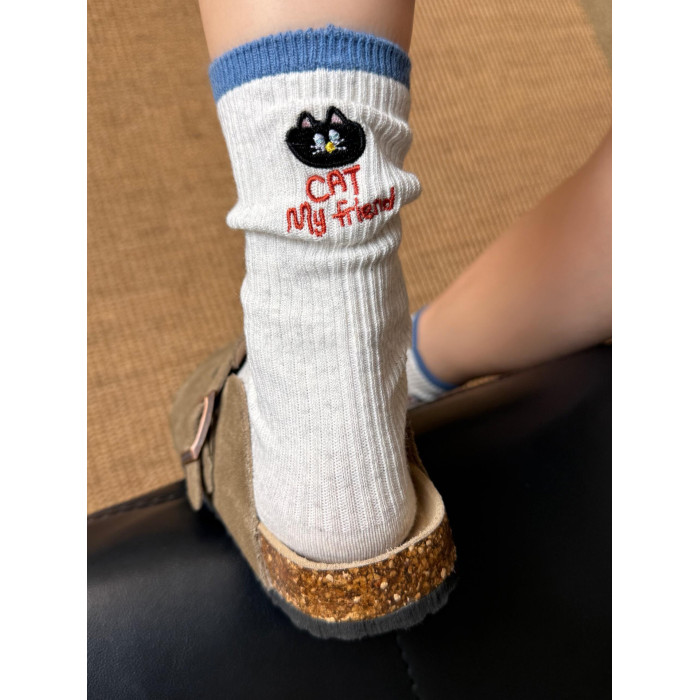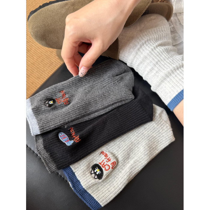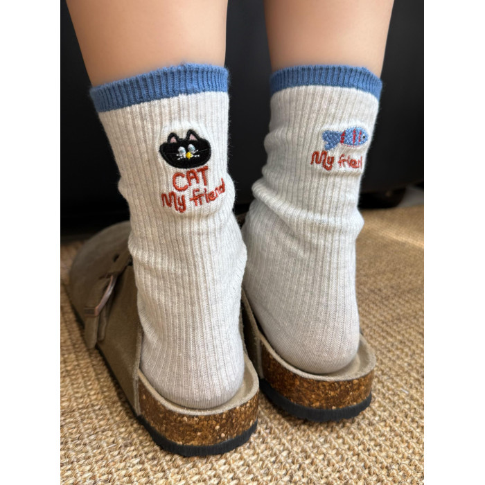 小貓與魚~左右兩衹腳都是不一樣的圖案~好可愛~襪子女AB中筒堆堆