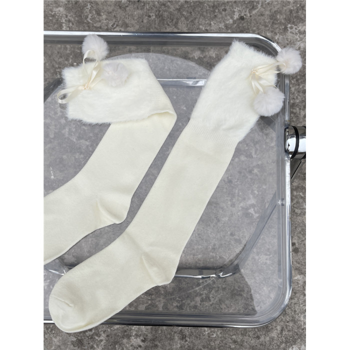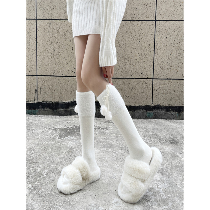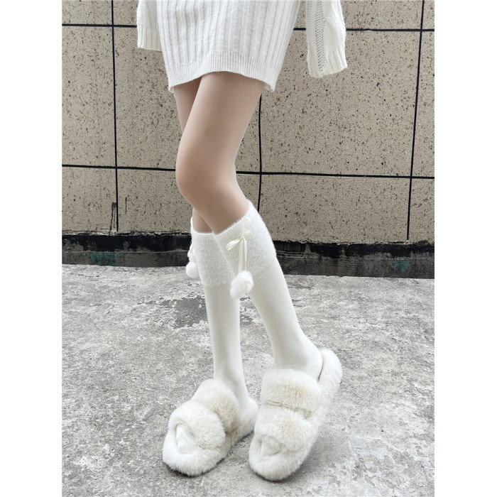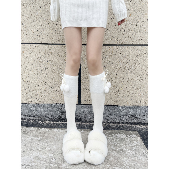 純欲奶白色小腿襪子JK過膝長筒襪套女秋冬加絨可愛毛球中筒堆堆襪