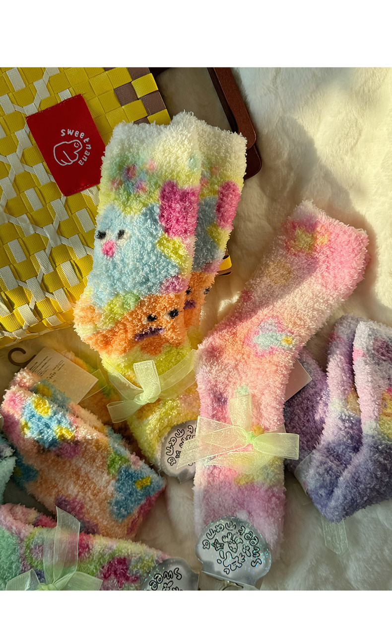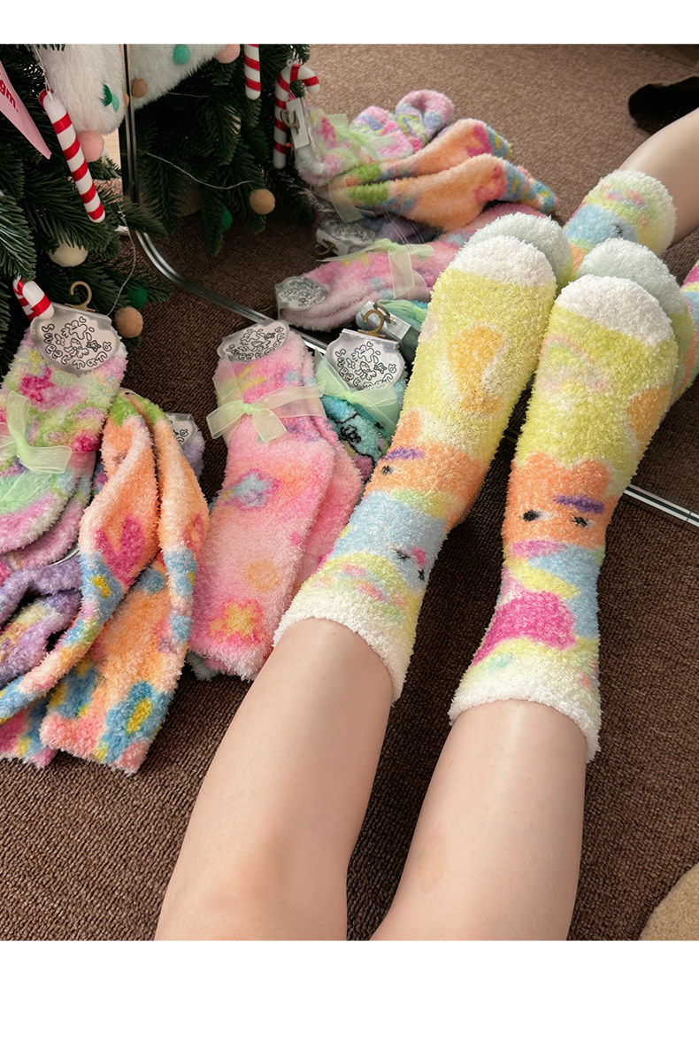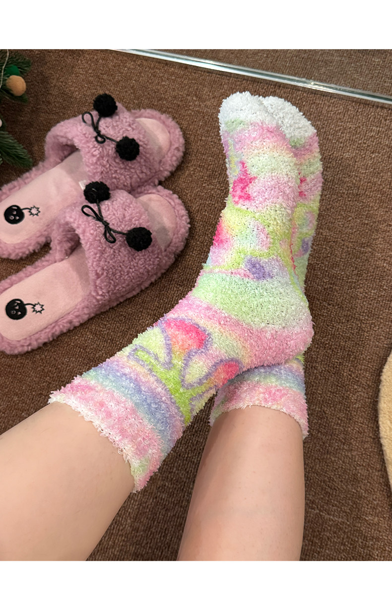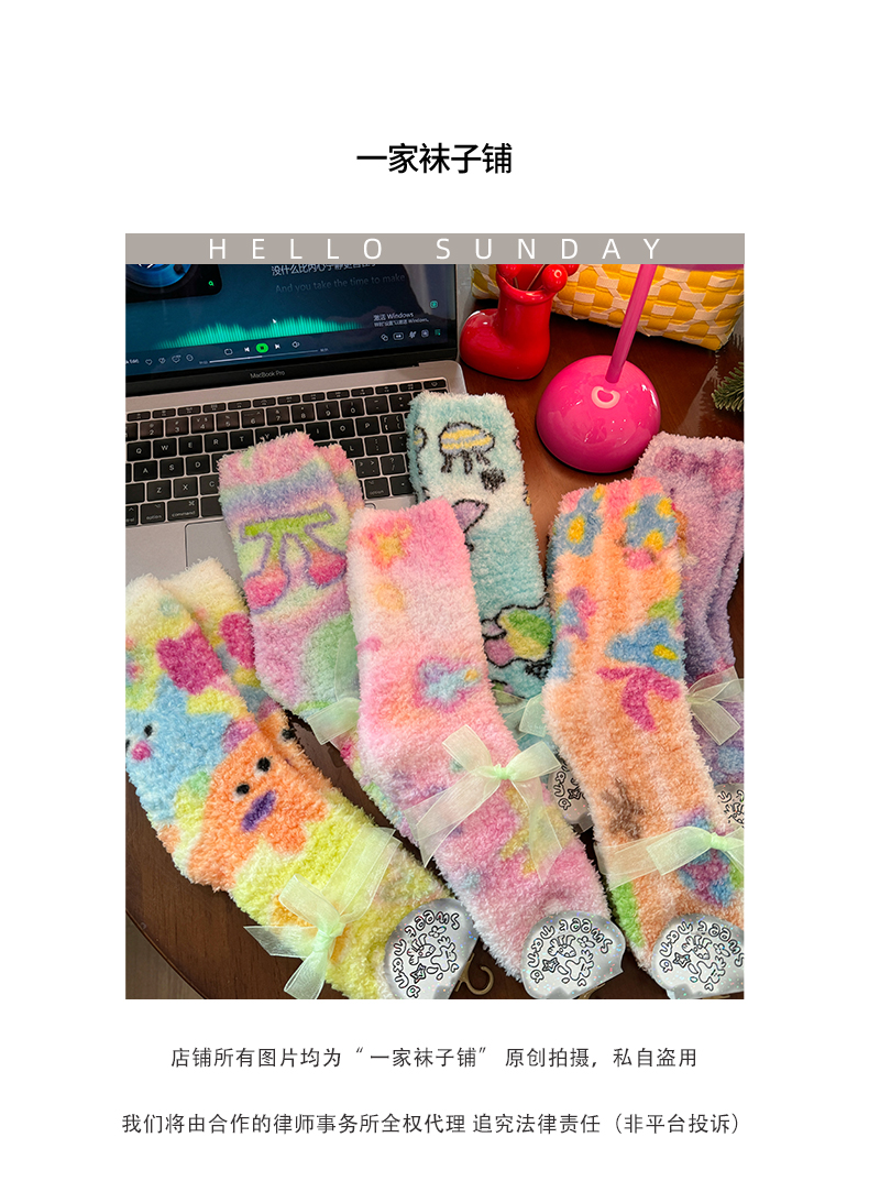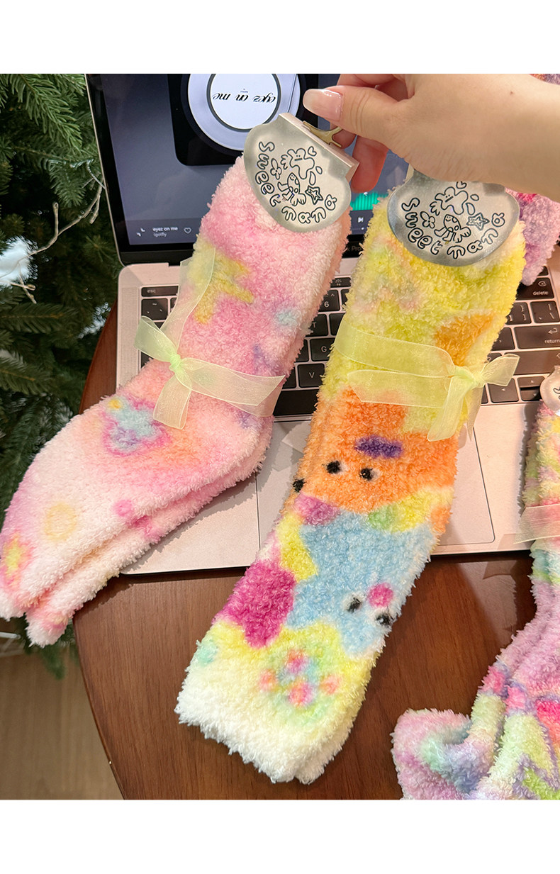 小衆個性紥染珊瑚絨襪子女中筒襪加厚保暖地板襪睡眠襪可愛創意