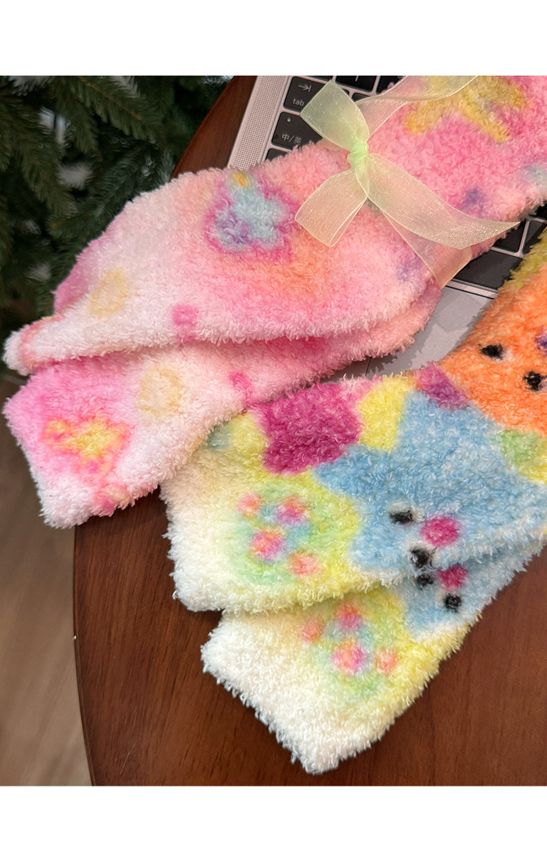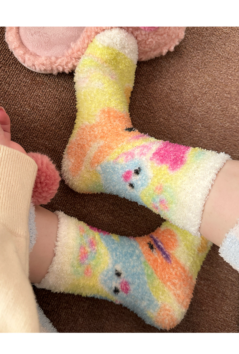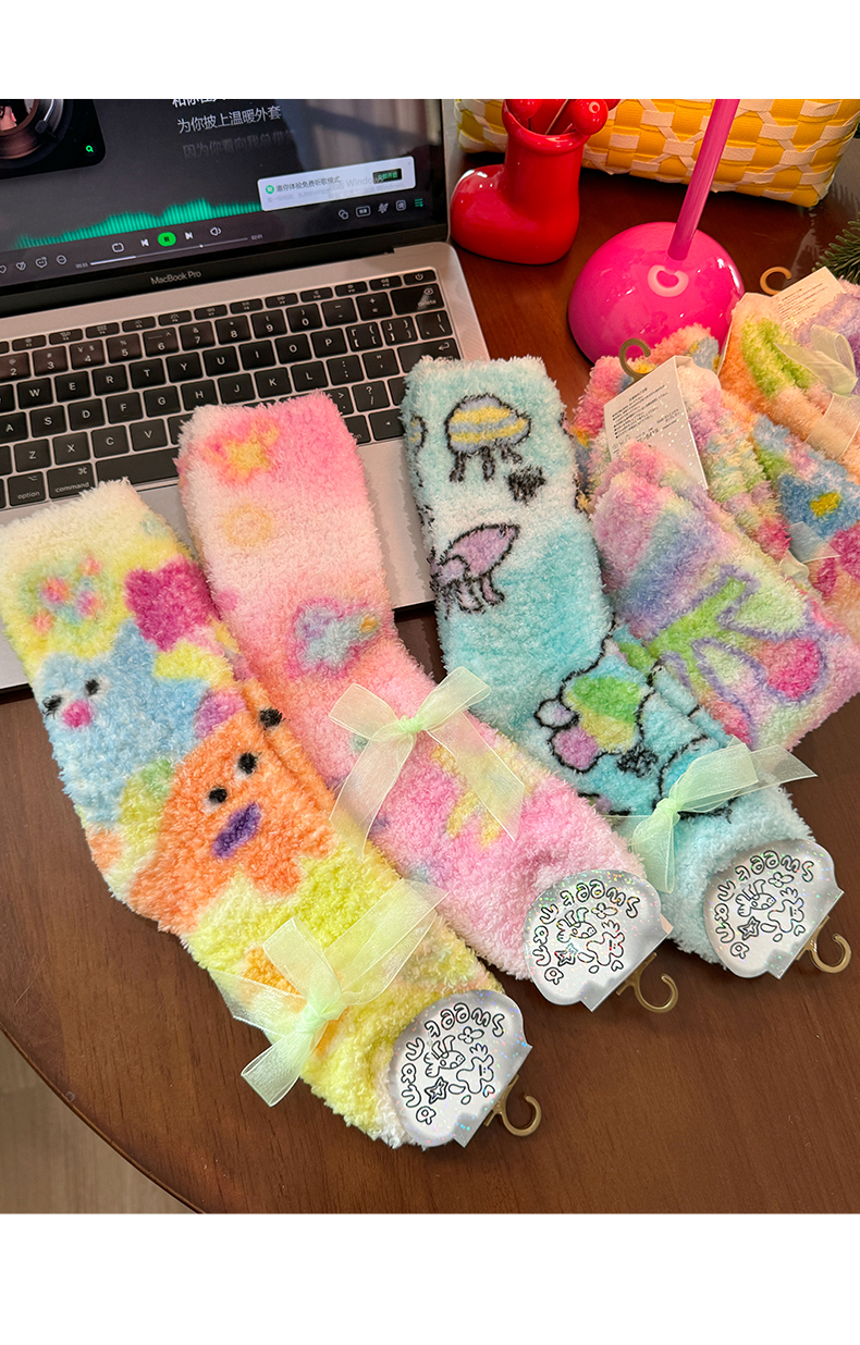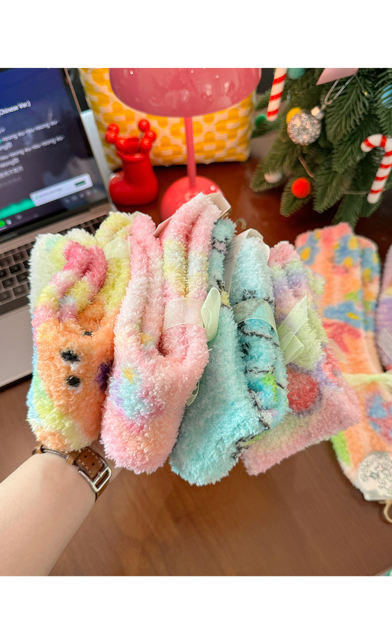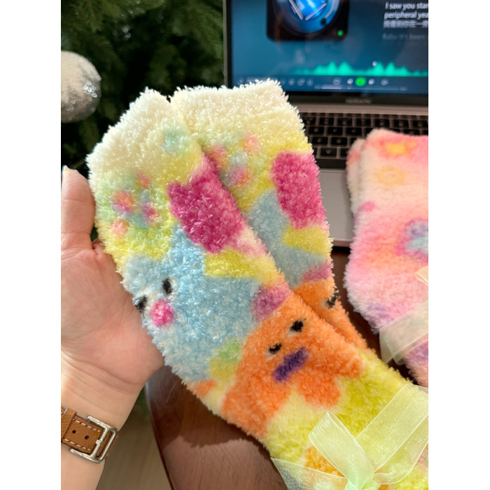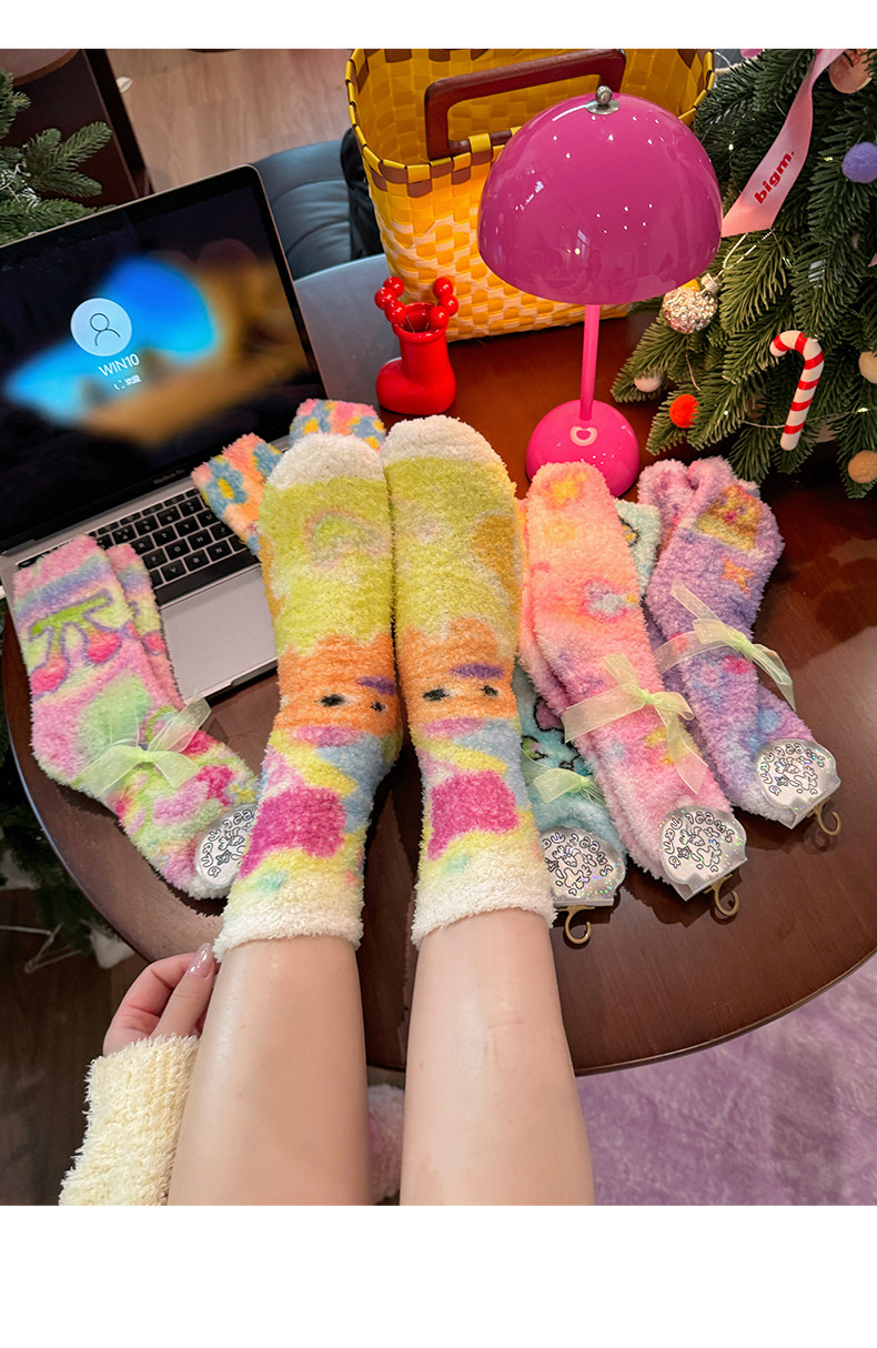 小衆個性紥染珊瑚絨襪子女中筒襪加厚保暖地板襪睡眠襪可愛創意