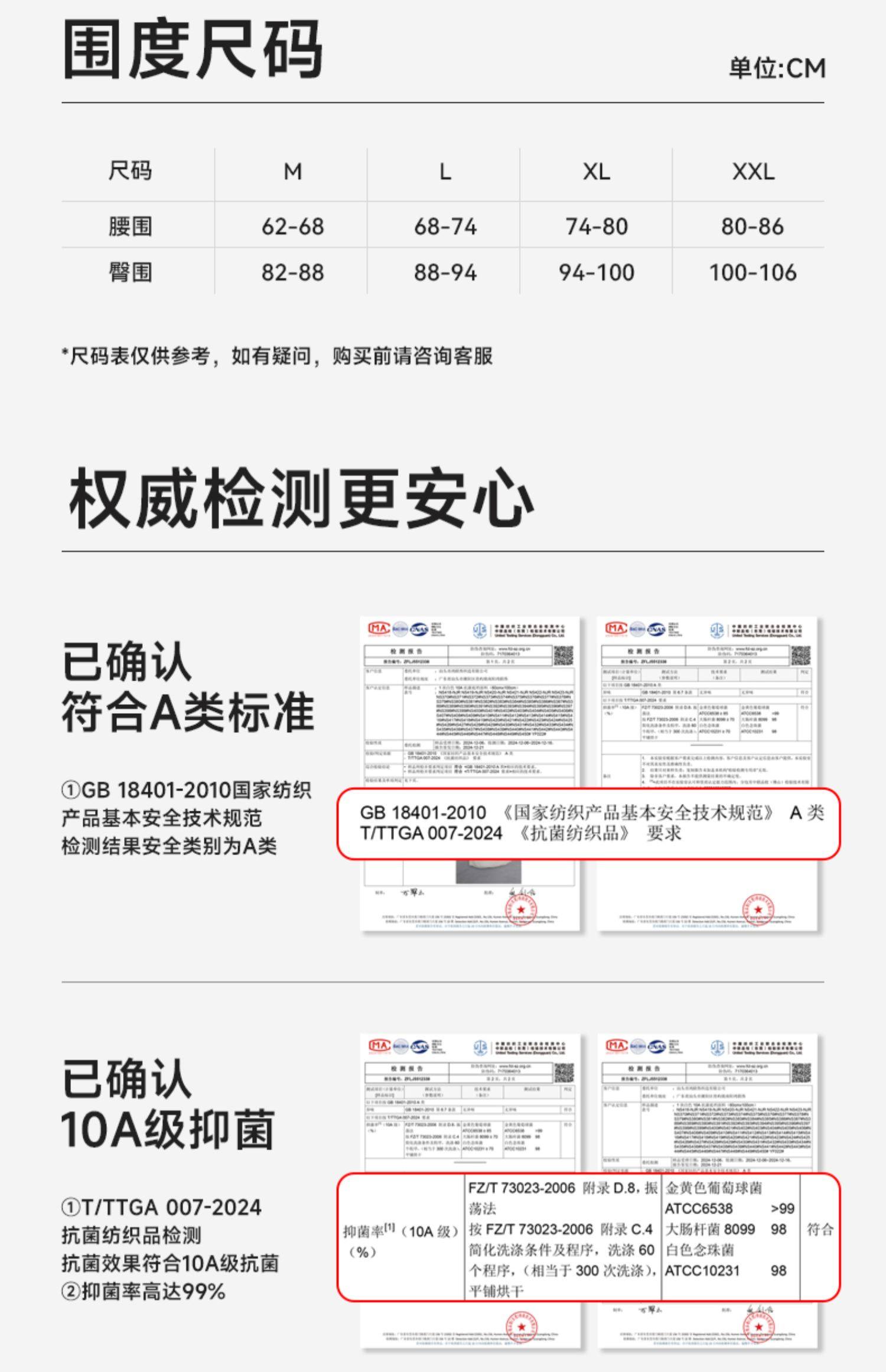 | 襠部材質成分 | 粘膠纖維(粘纖)89% 聚氨酯彈性纖維(氨綸)4% 桑蠶絲4% 聚醯胺纖維(錦綸)3% |