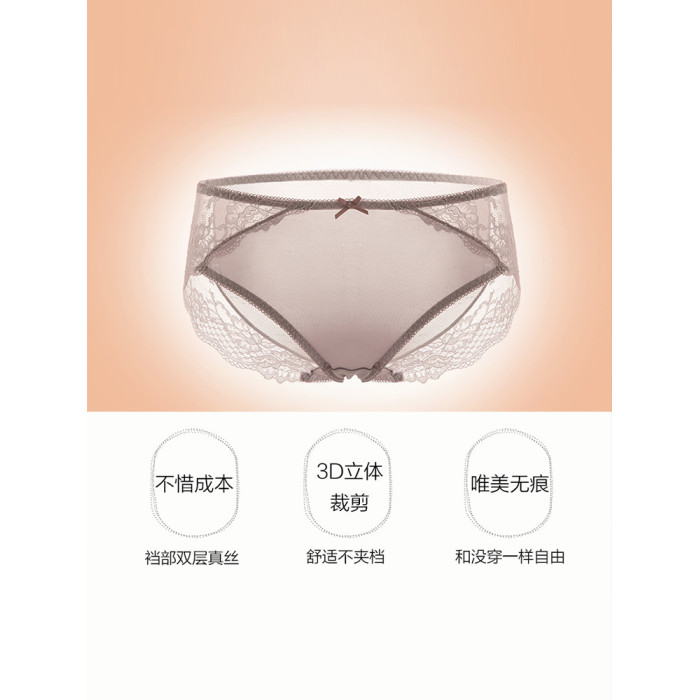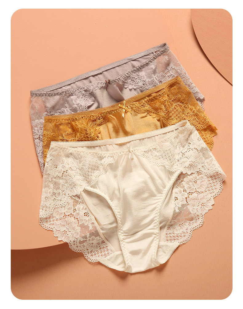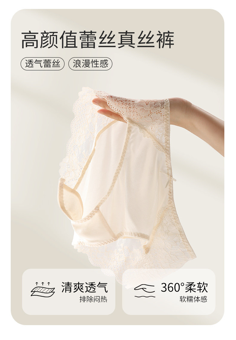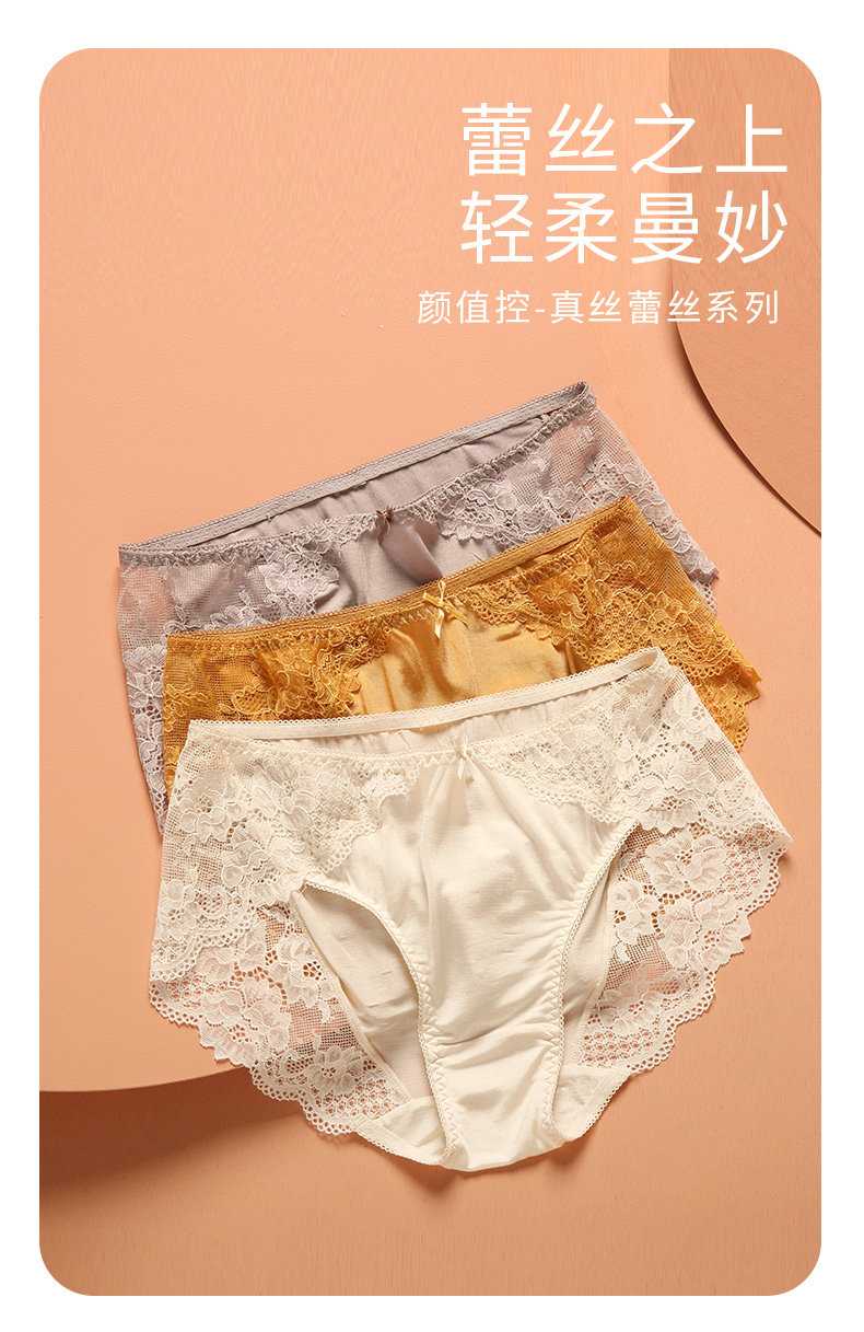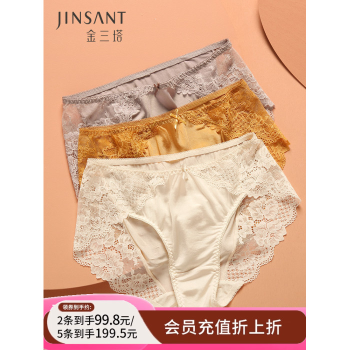金三塔真絲中腰內褲 舒適透氣蠶絲拼蕾絲三角褲100%桑蠶絲內衣女