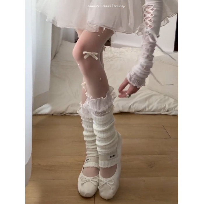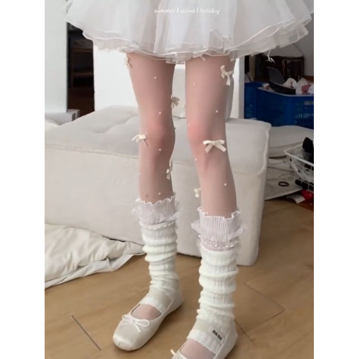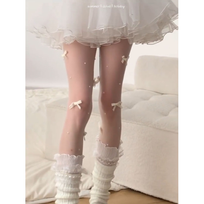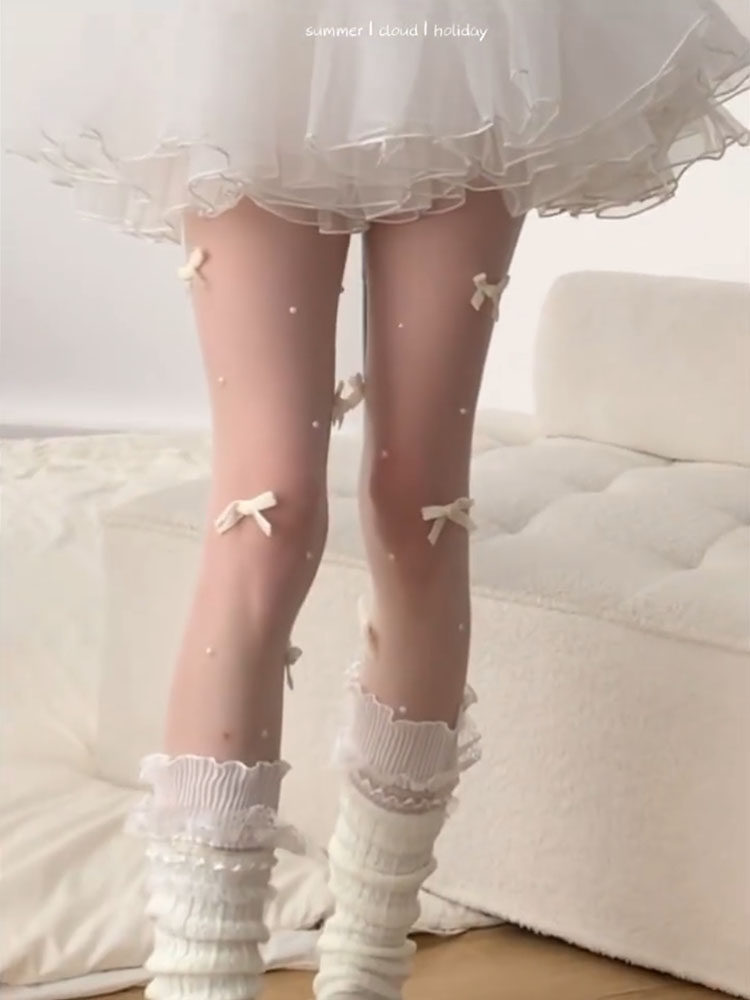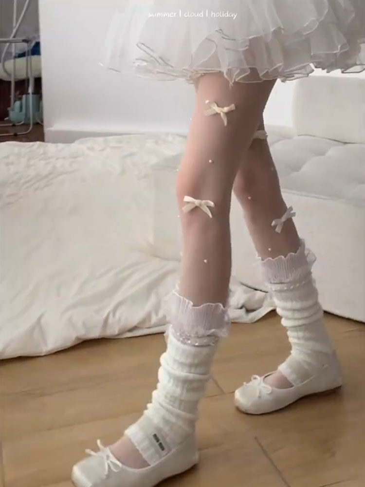 【4雙裝】春秋新款白絲襪子日系芭蕾風白色蝴蝶結手工珍珠連褲襪
