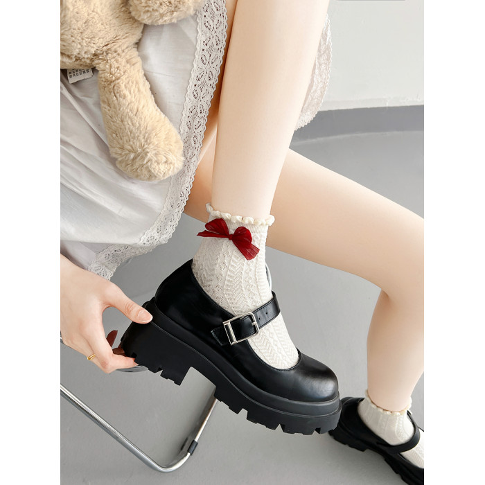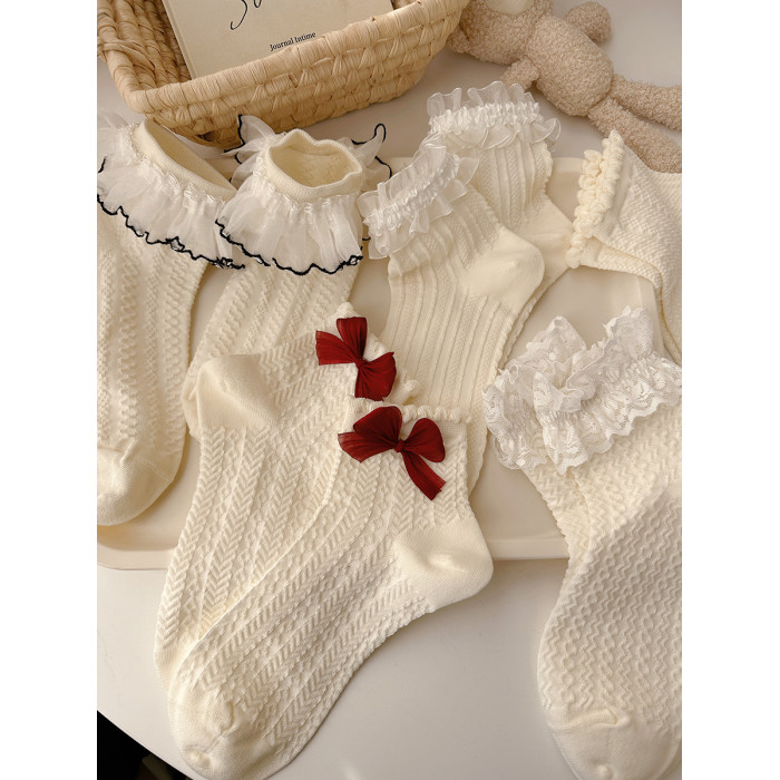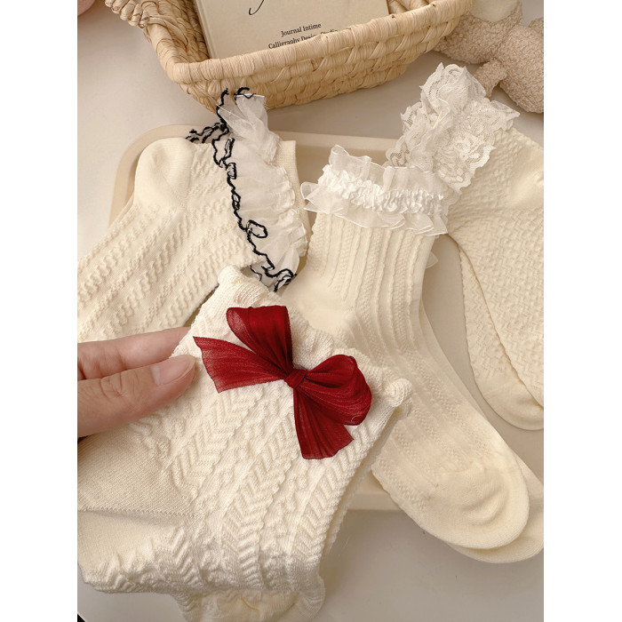 花邊襪子女可愛洛麗塔日系jk蕾絲襪lolita純棉奶白色蝴蝶結中筒襪