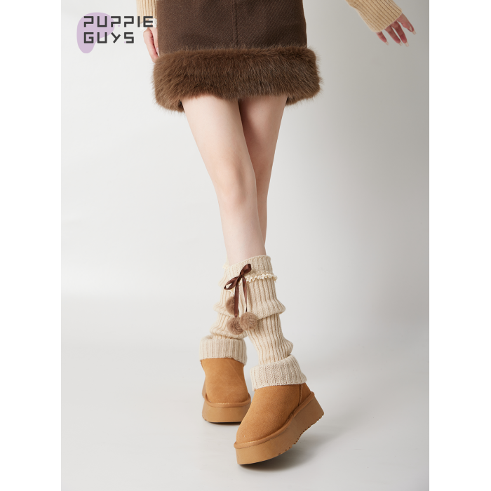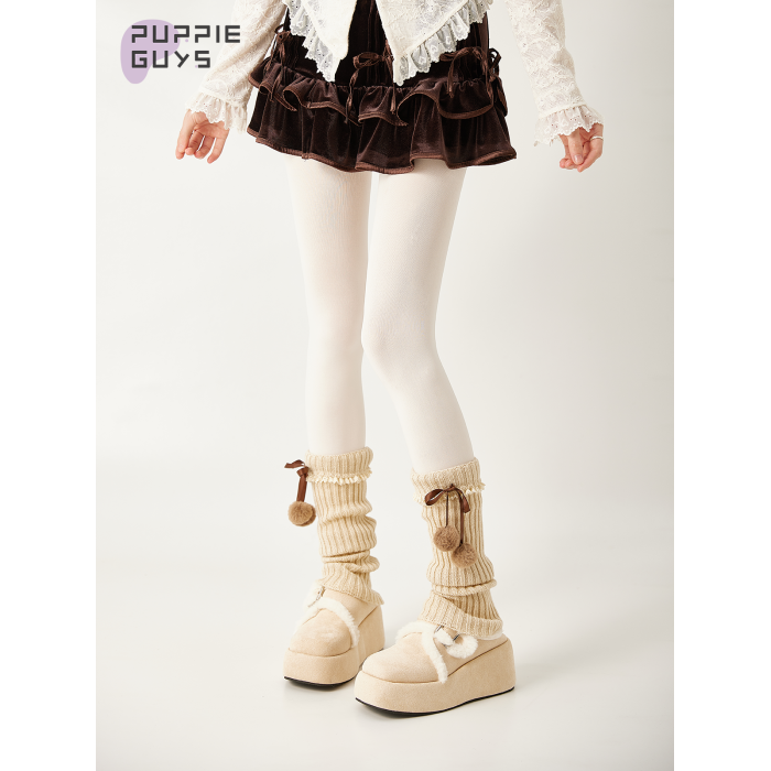 purpleguys毛球襪套秋冬女可愛蝴蝶結蕾絲花邊針織顯瘦堆堆小腿套
