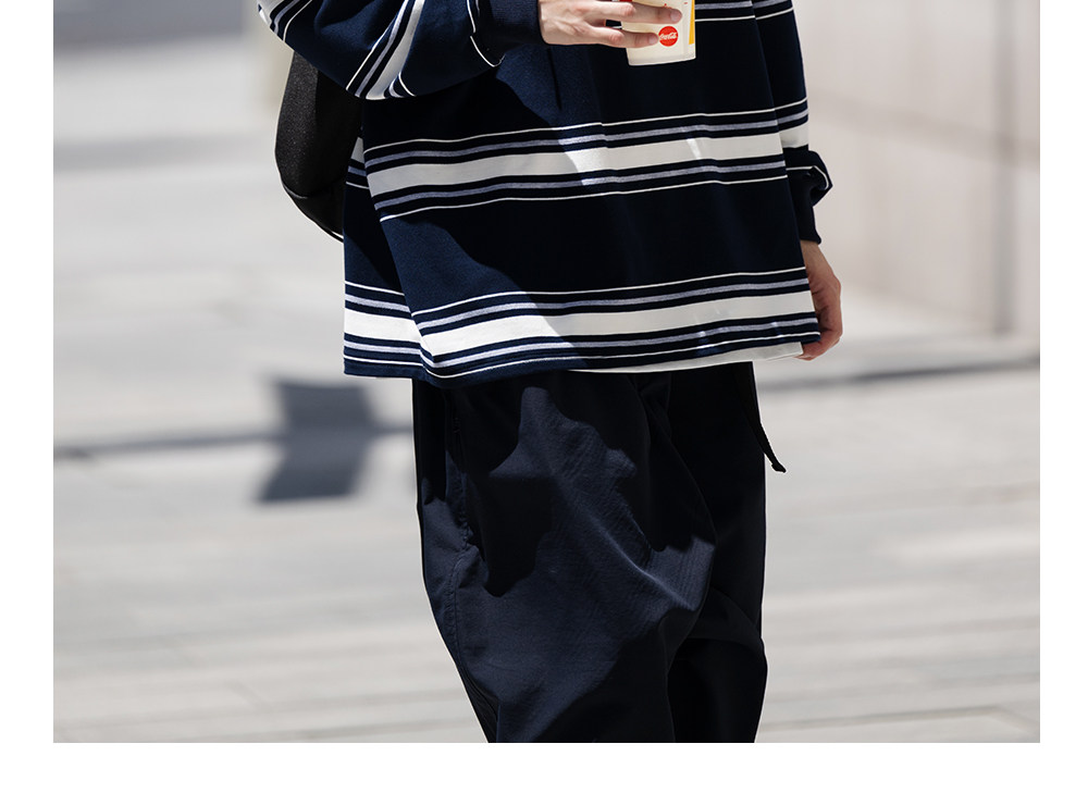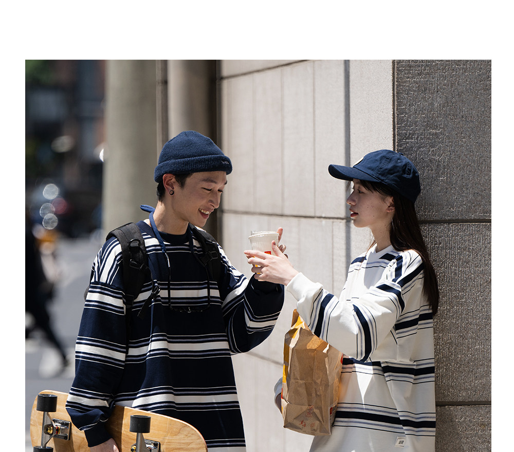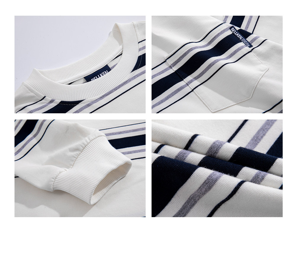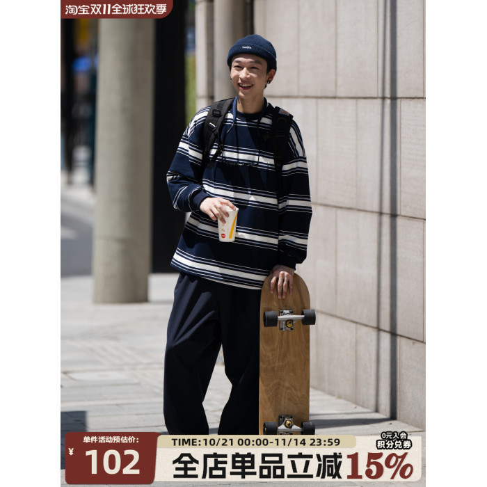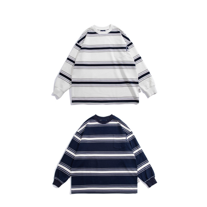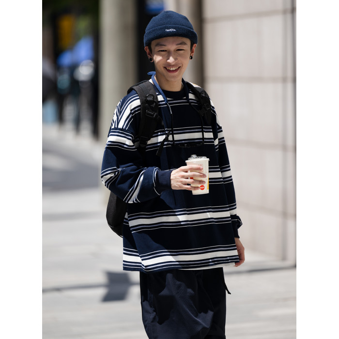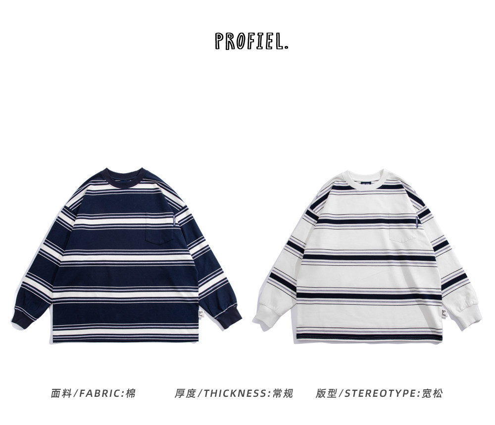 Bellken22AW復古日系藏青休閒條紋長袖T恤男女流行寬松廓形情侶衫