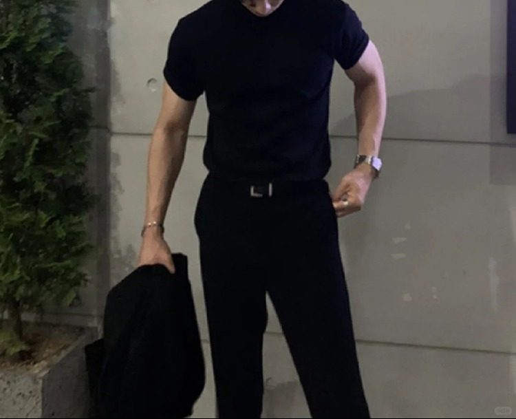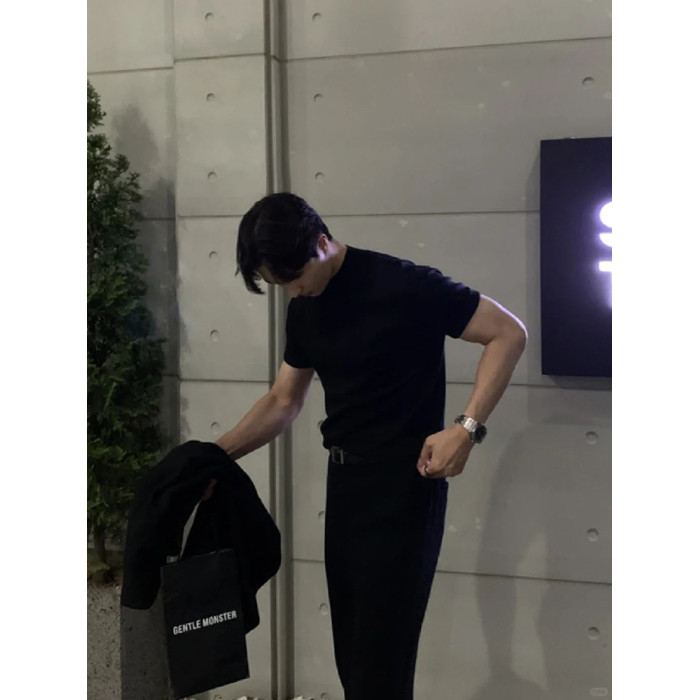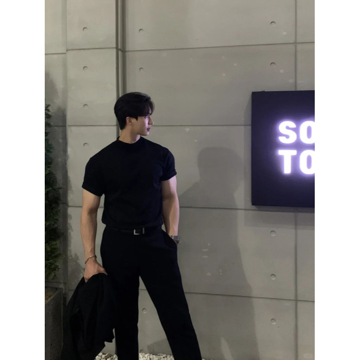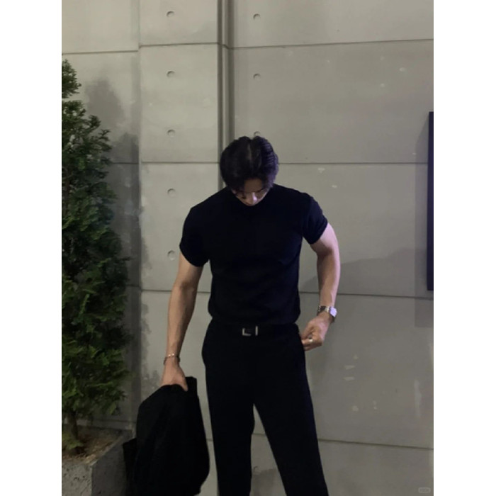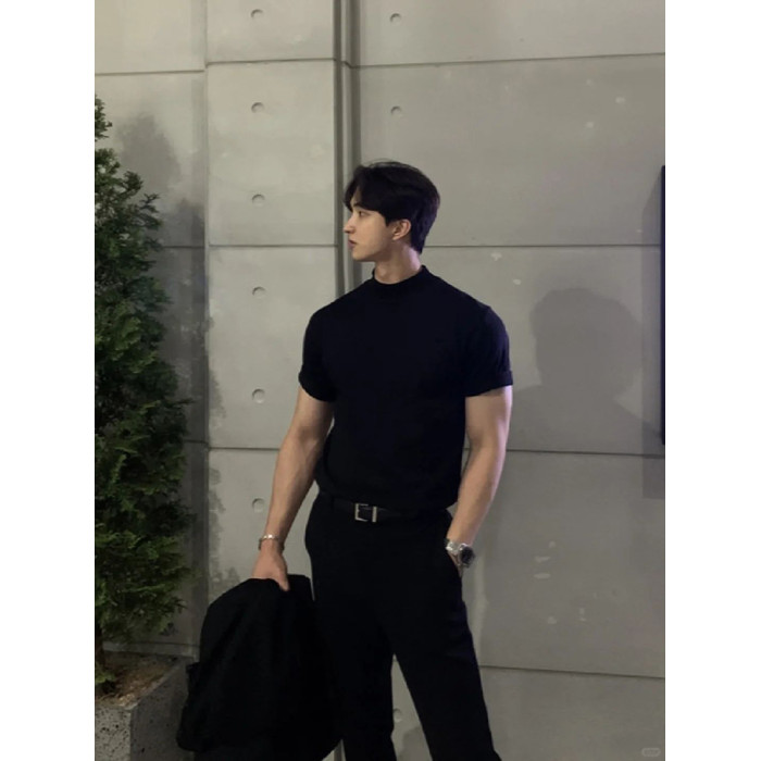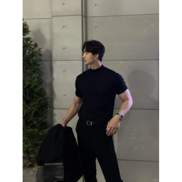 英倫雅痞男裝夏季收袖口t恤小領口修身短袖顯肌肉西裝內搭5分半袖