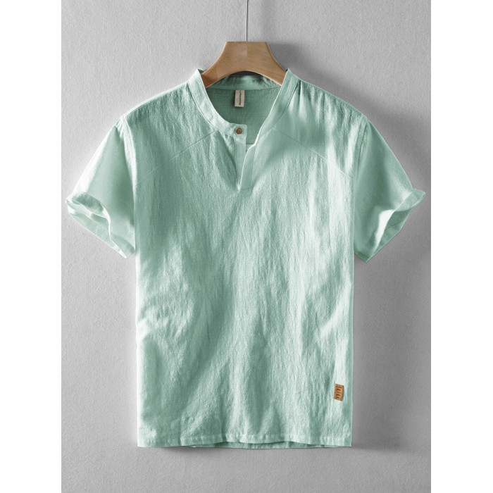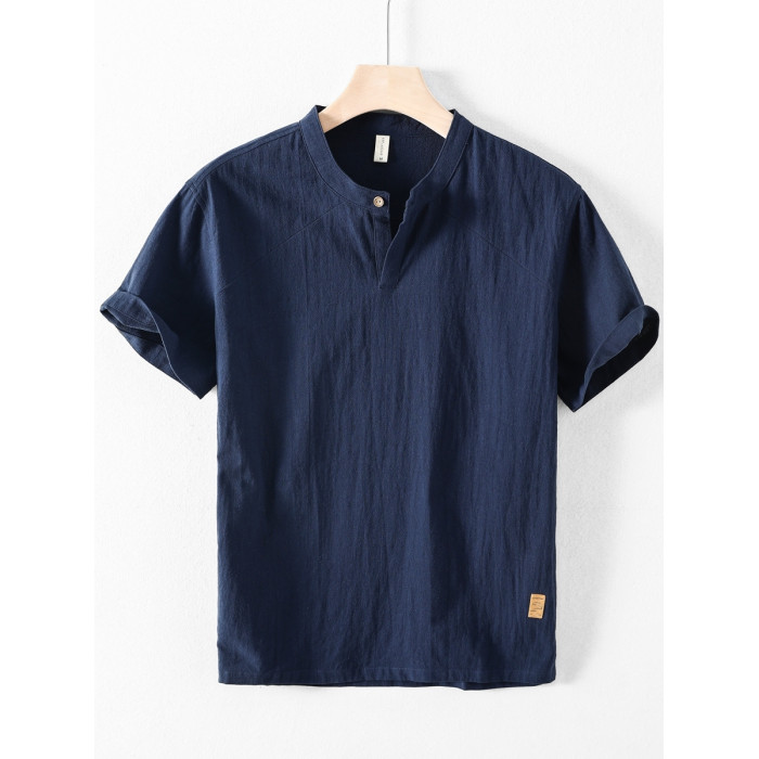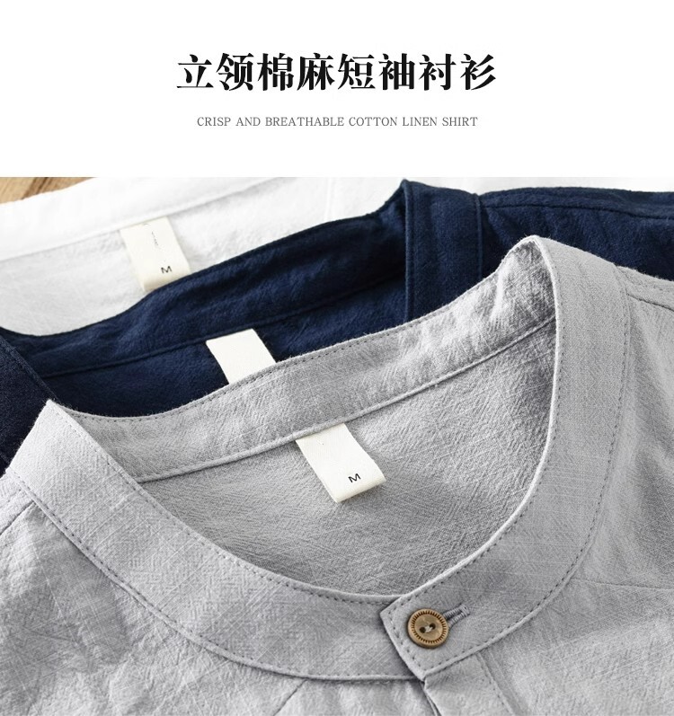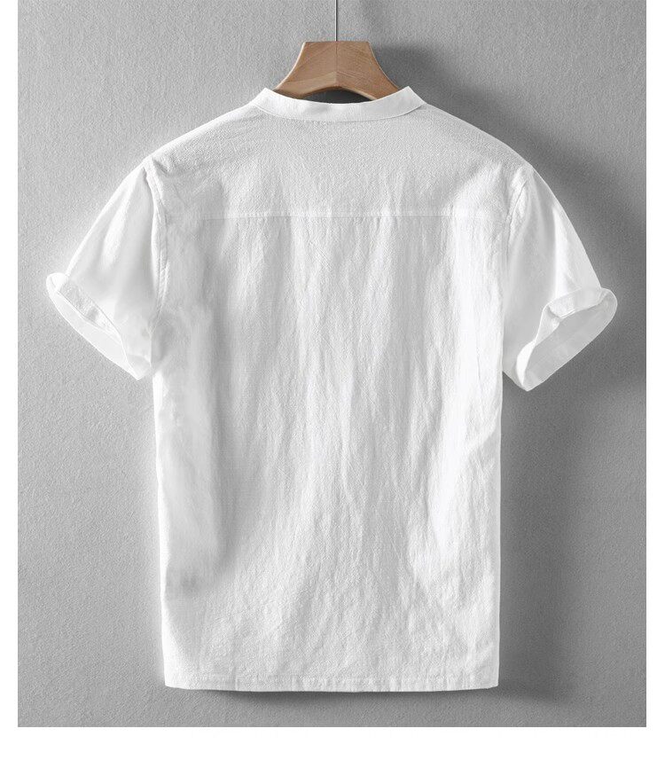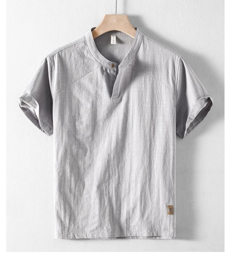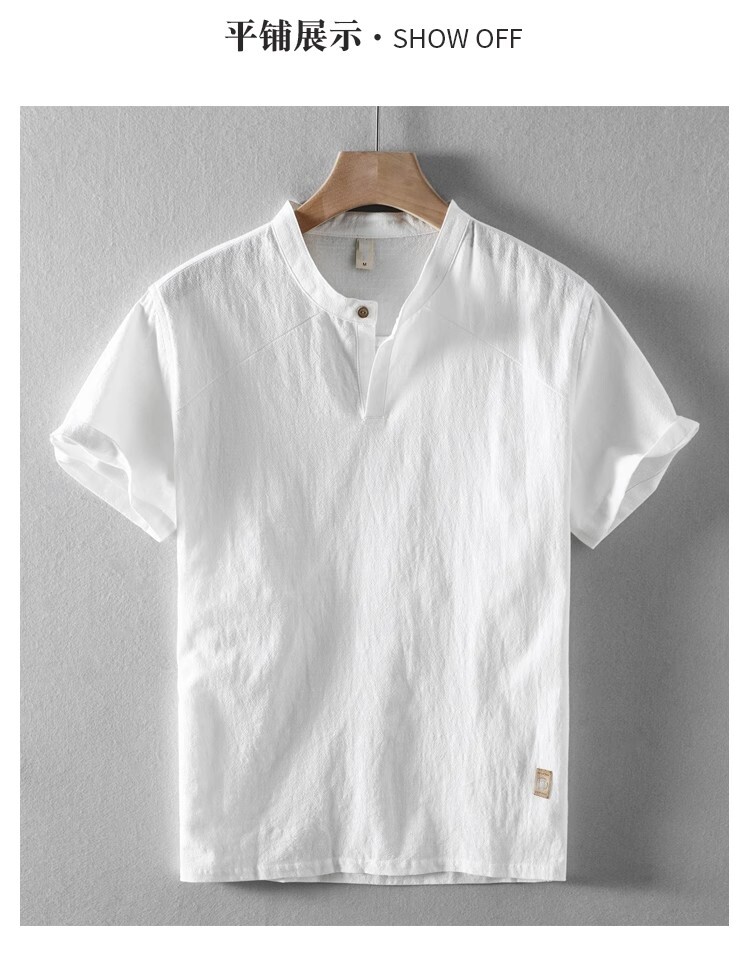 夏季男士亞麻短袖襯衫立領棉麻薄款復古休閒套頭寬松半袖t恤上衣