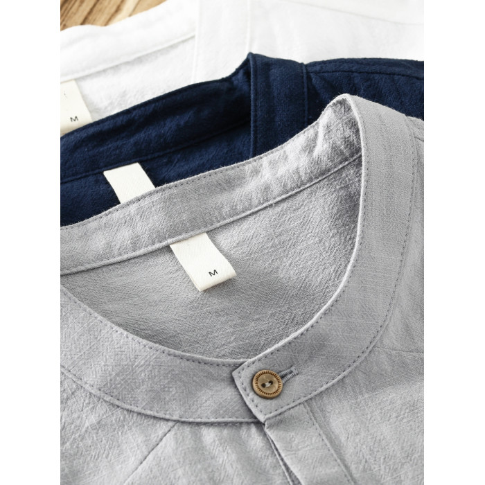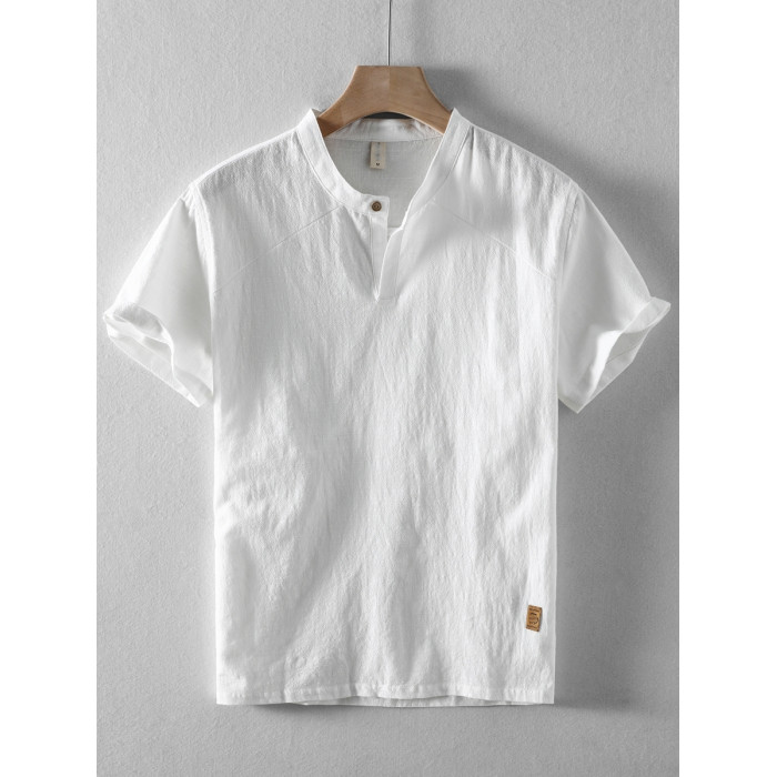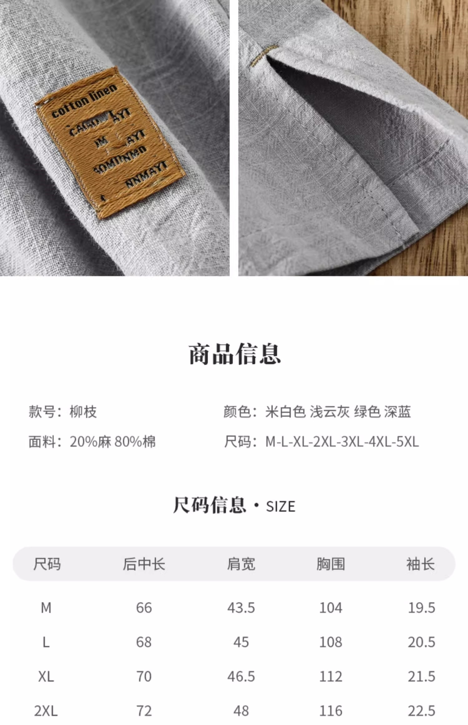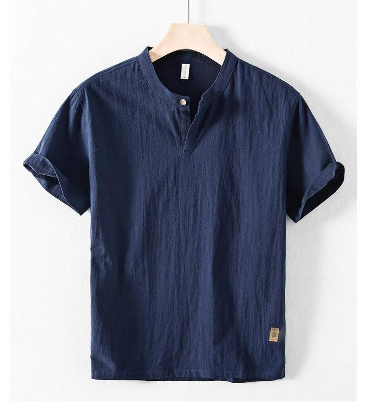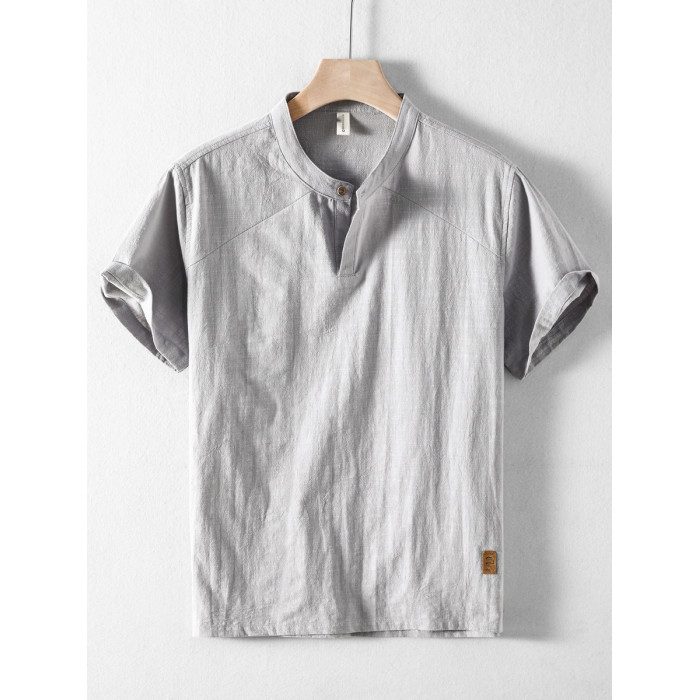 夏季男士亞麻短袖襯衫立領棉麻薄款復古休閒套頭寬松半袖t恤上衣