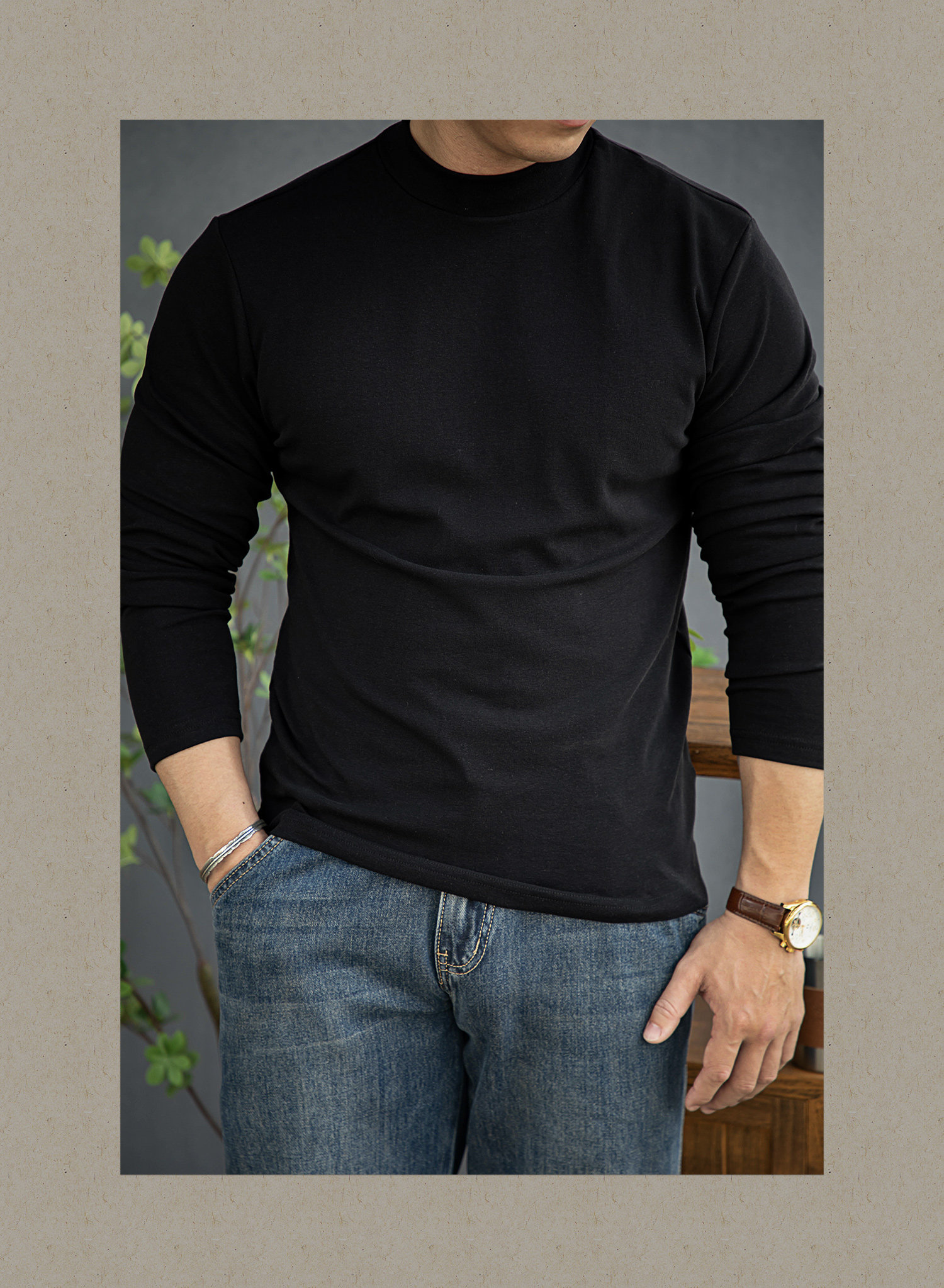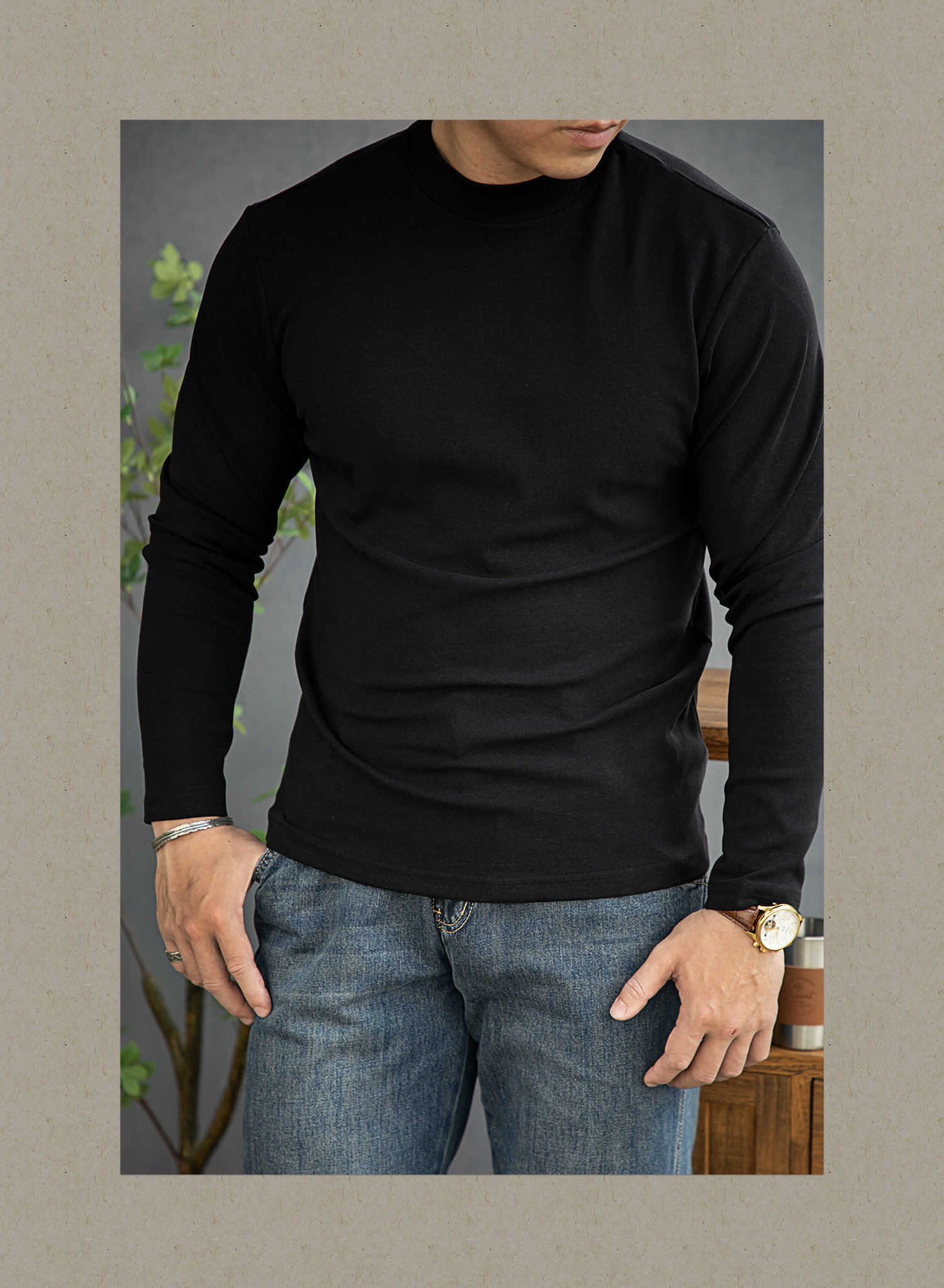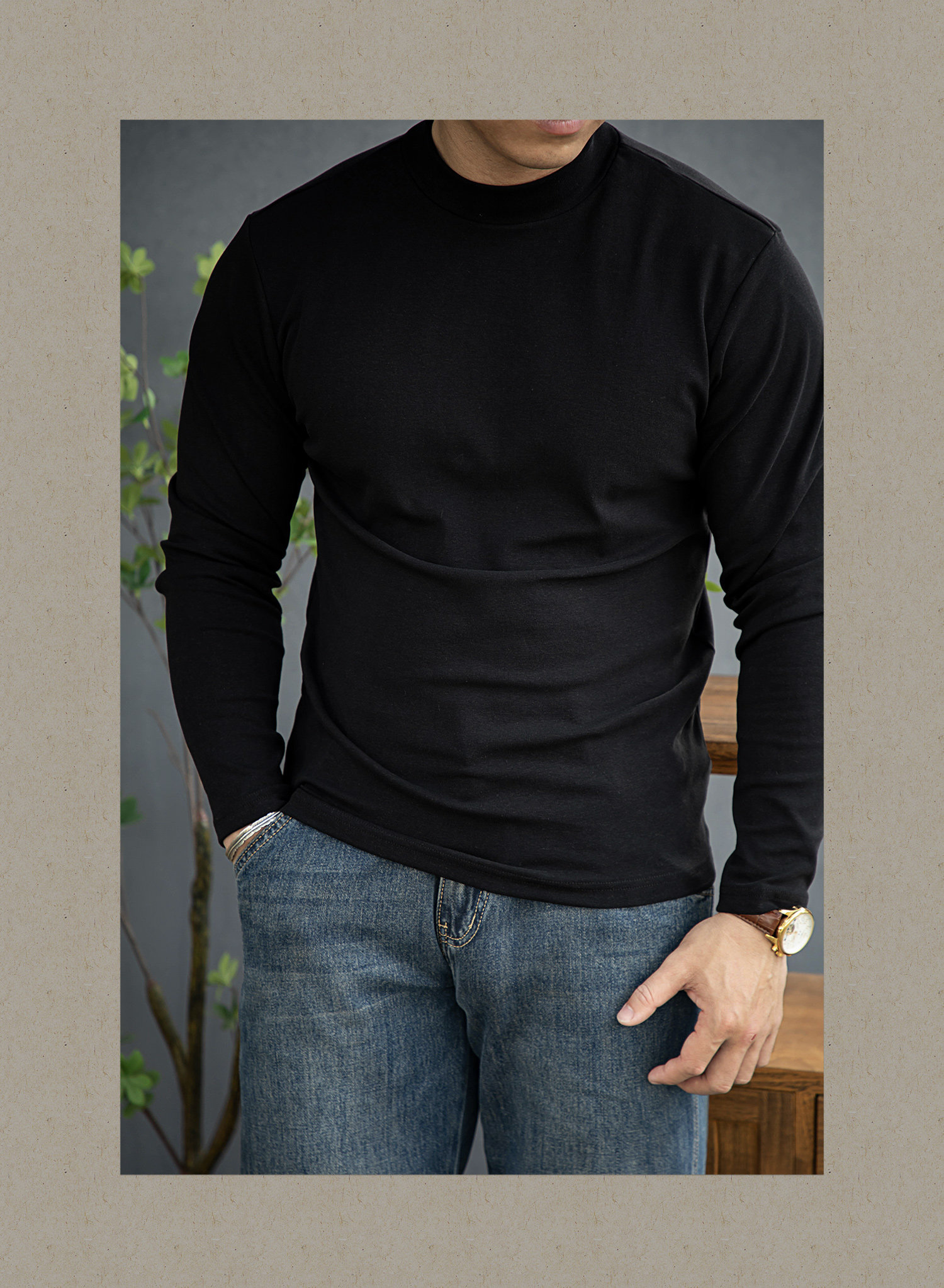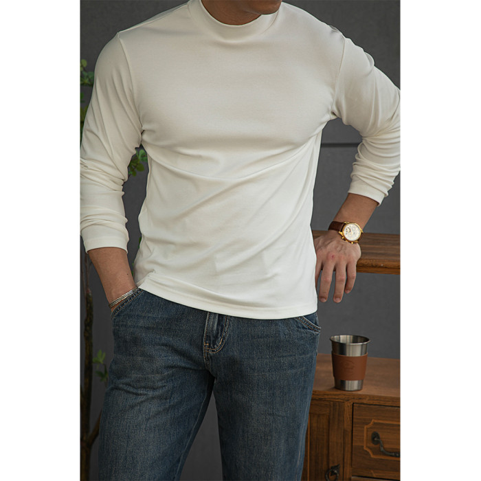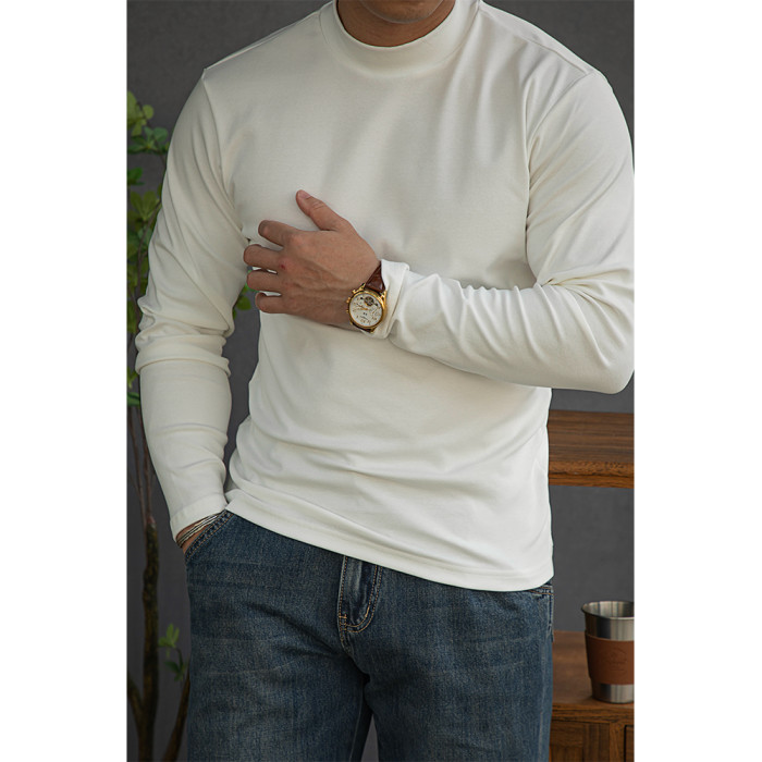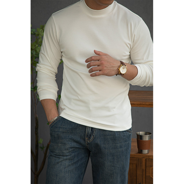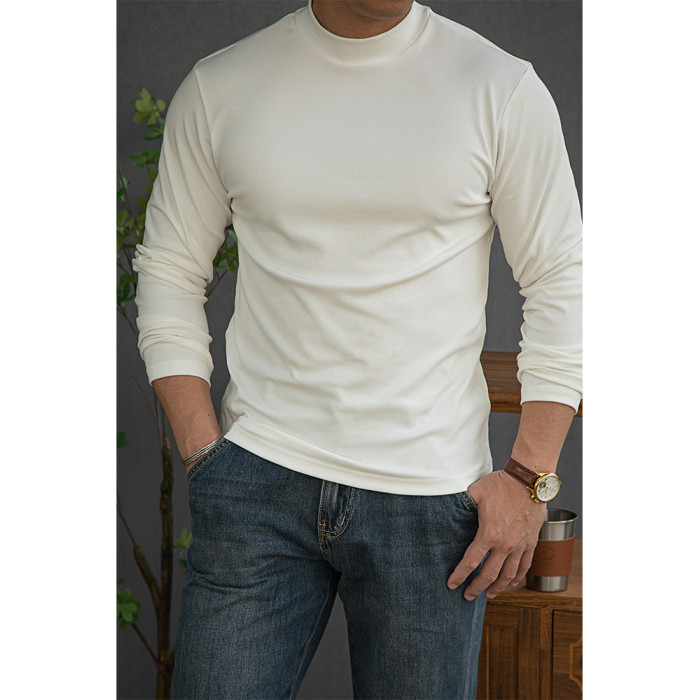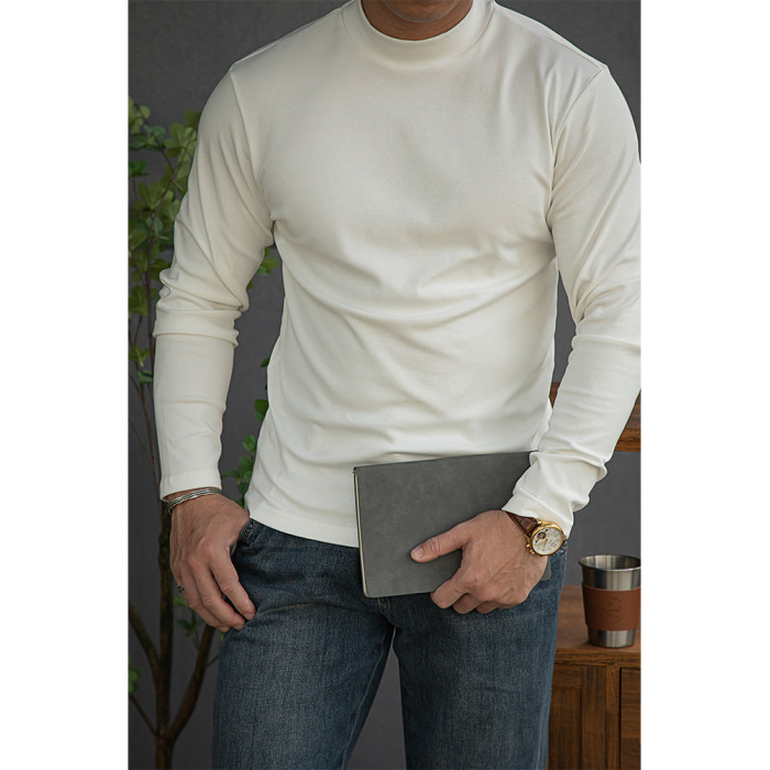 唔刃工裝美式重磅260g螺紋彈力半高領打底衫T恤修身顯瘦內搭男秋