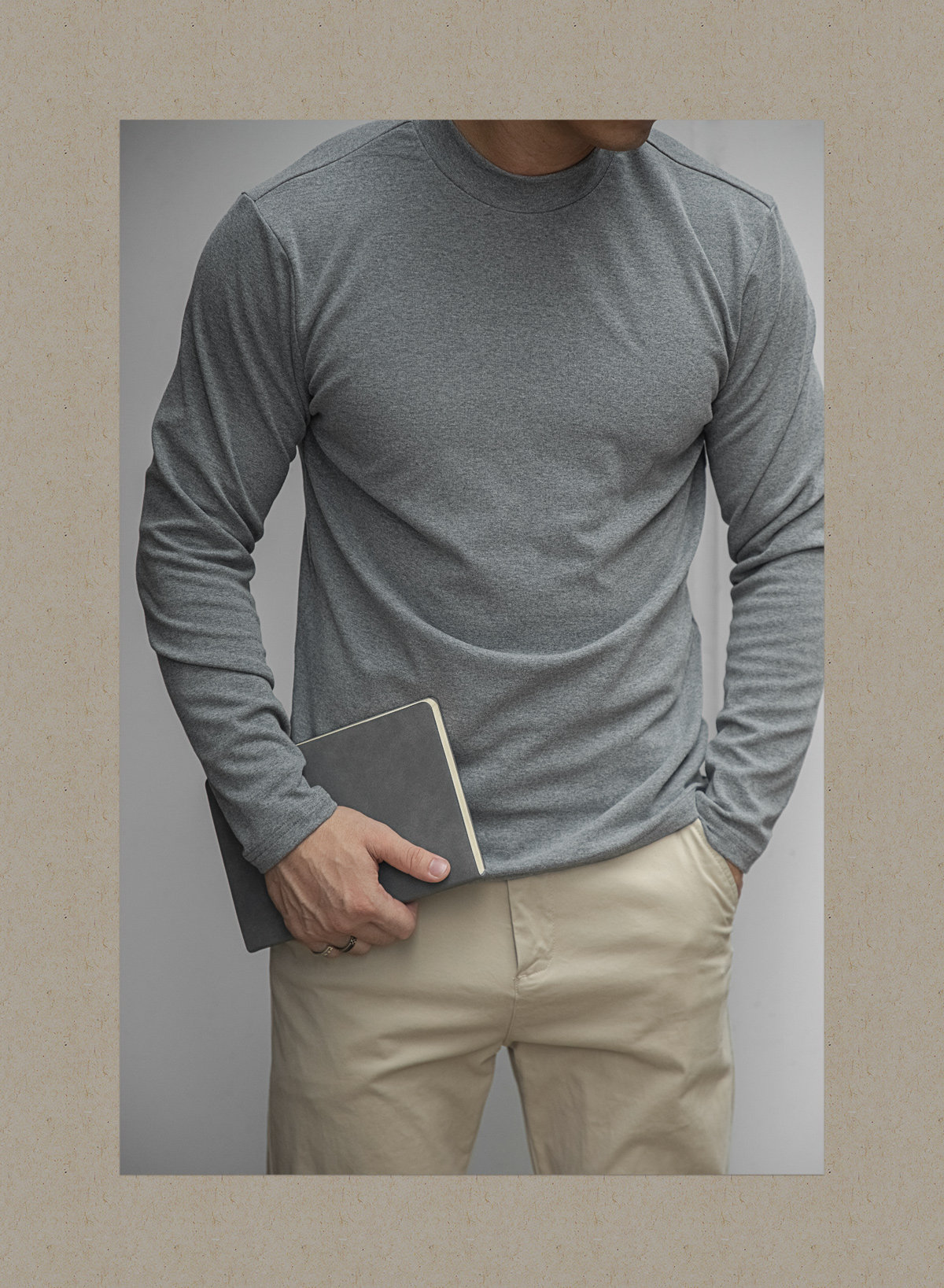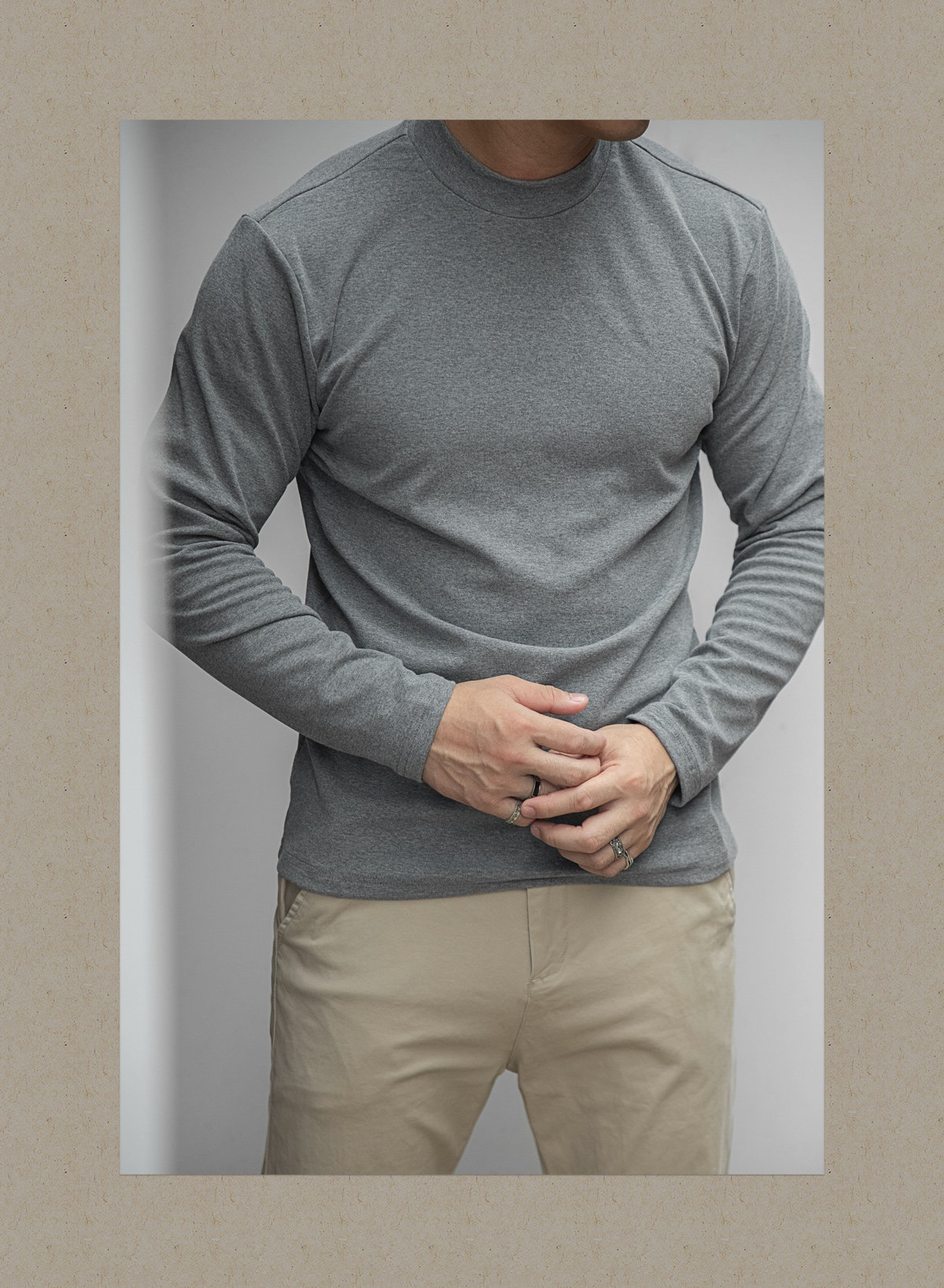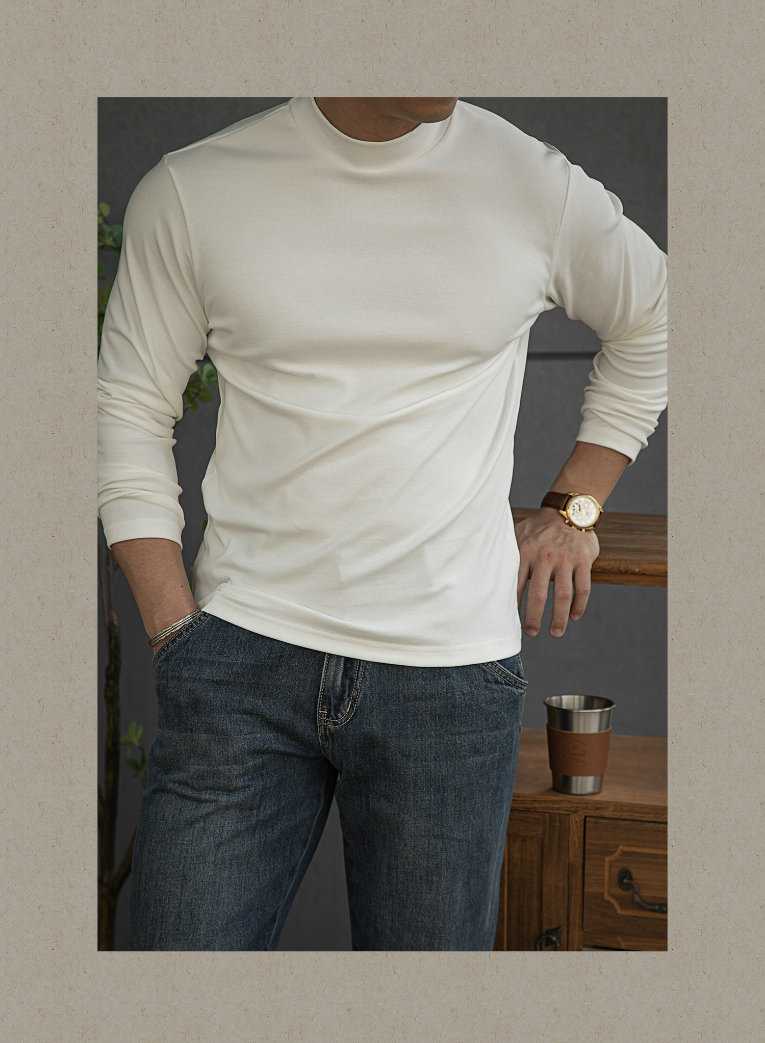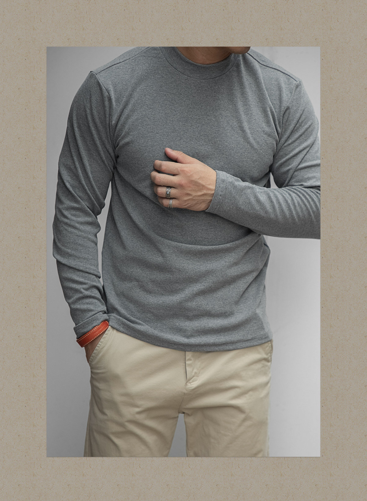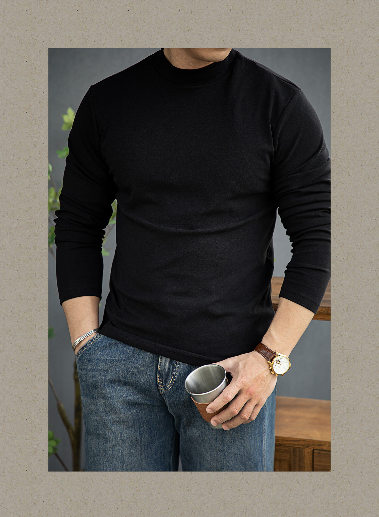 唔刃工裝美式重磅260g螺紋彈力半高領打底衫T恤修身顯瘦內搭男秋