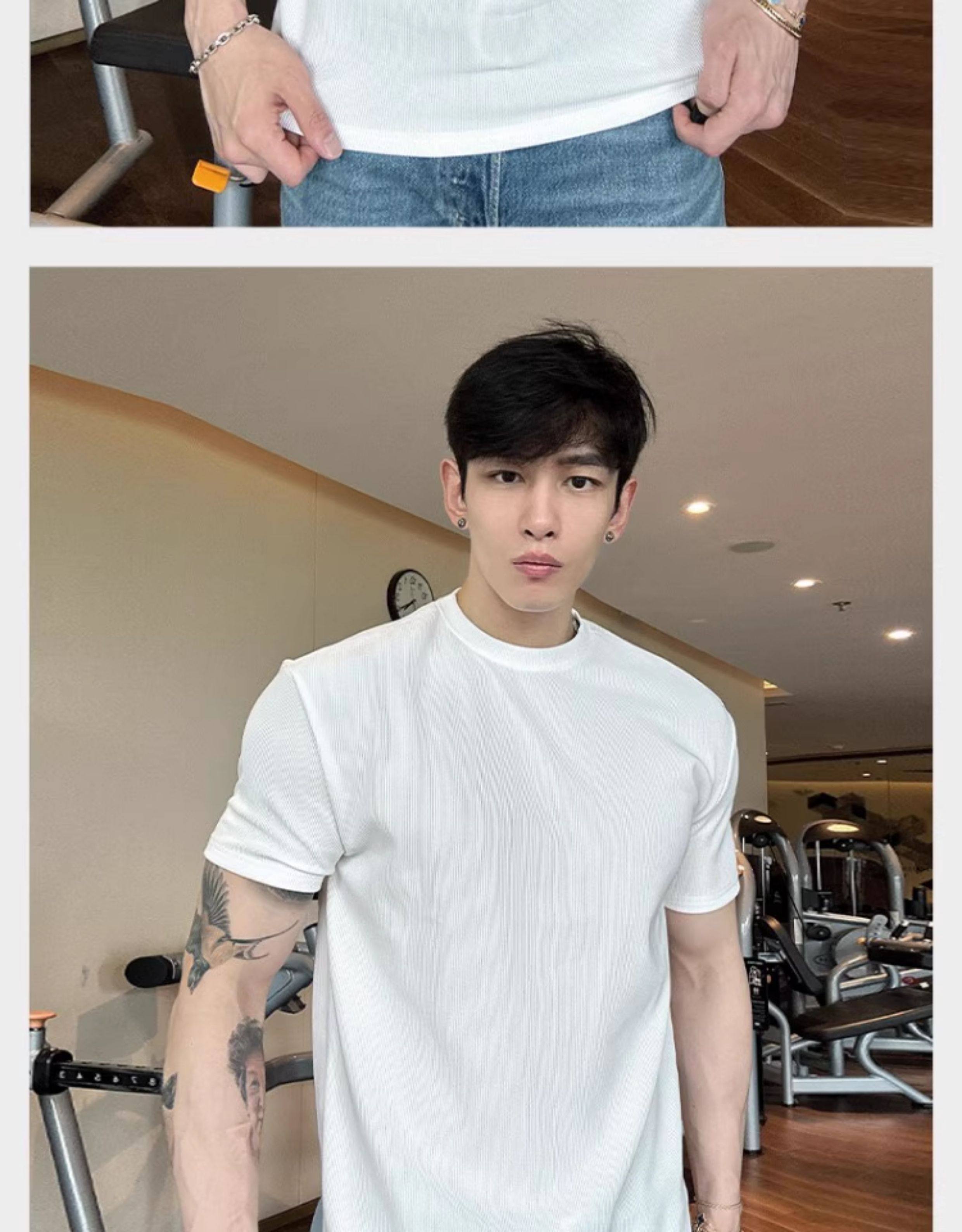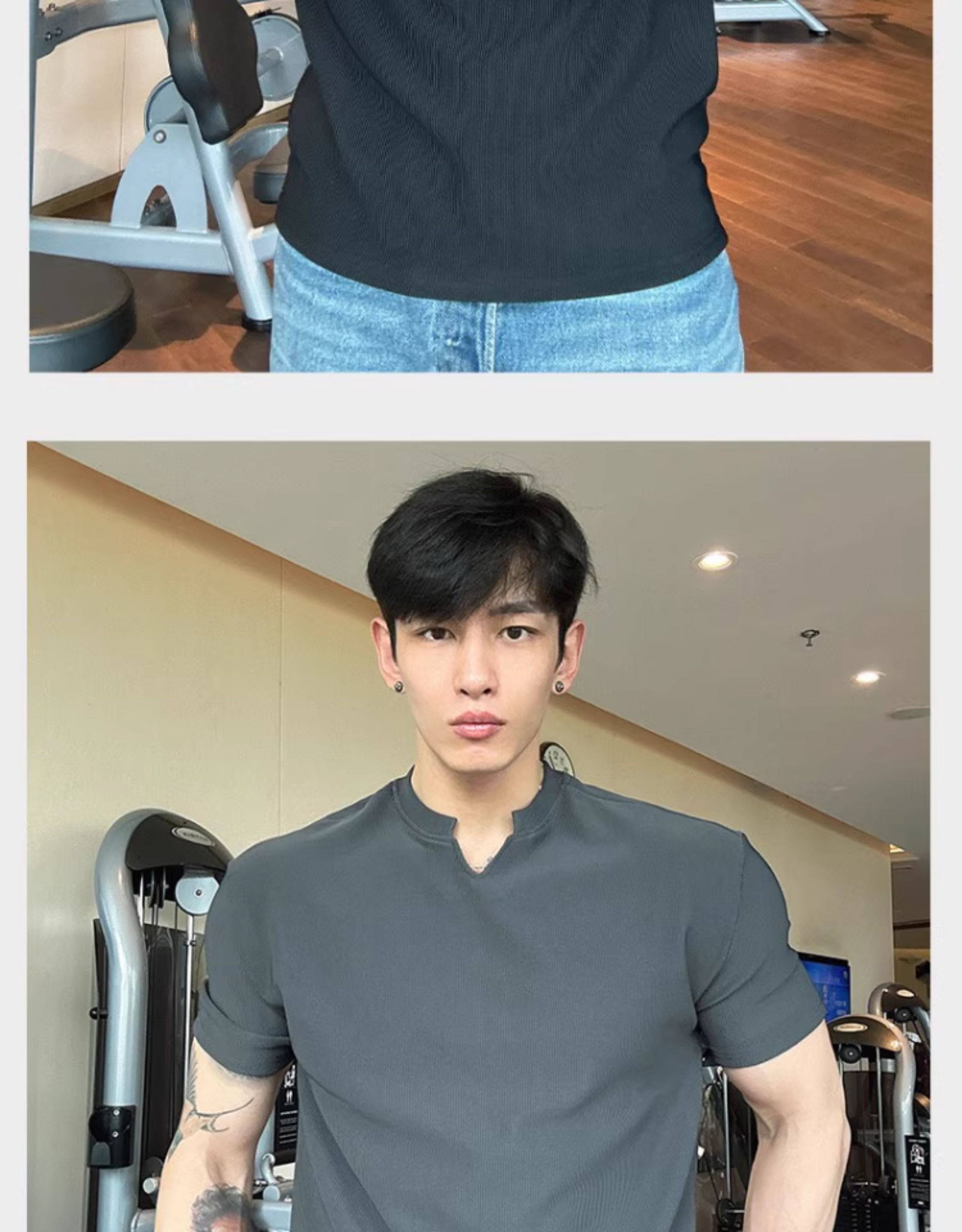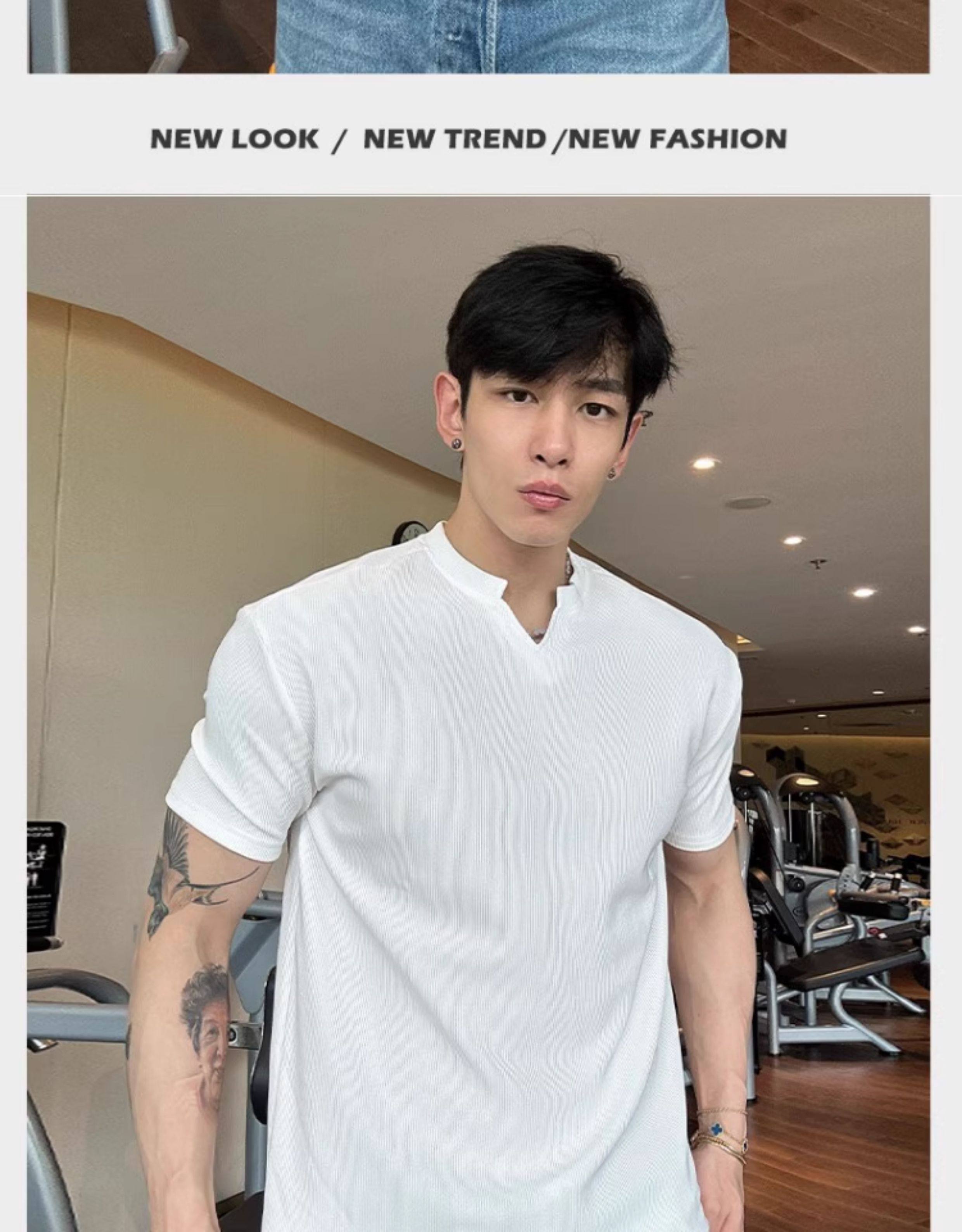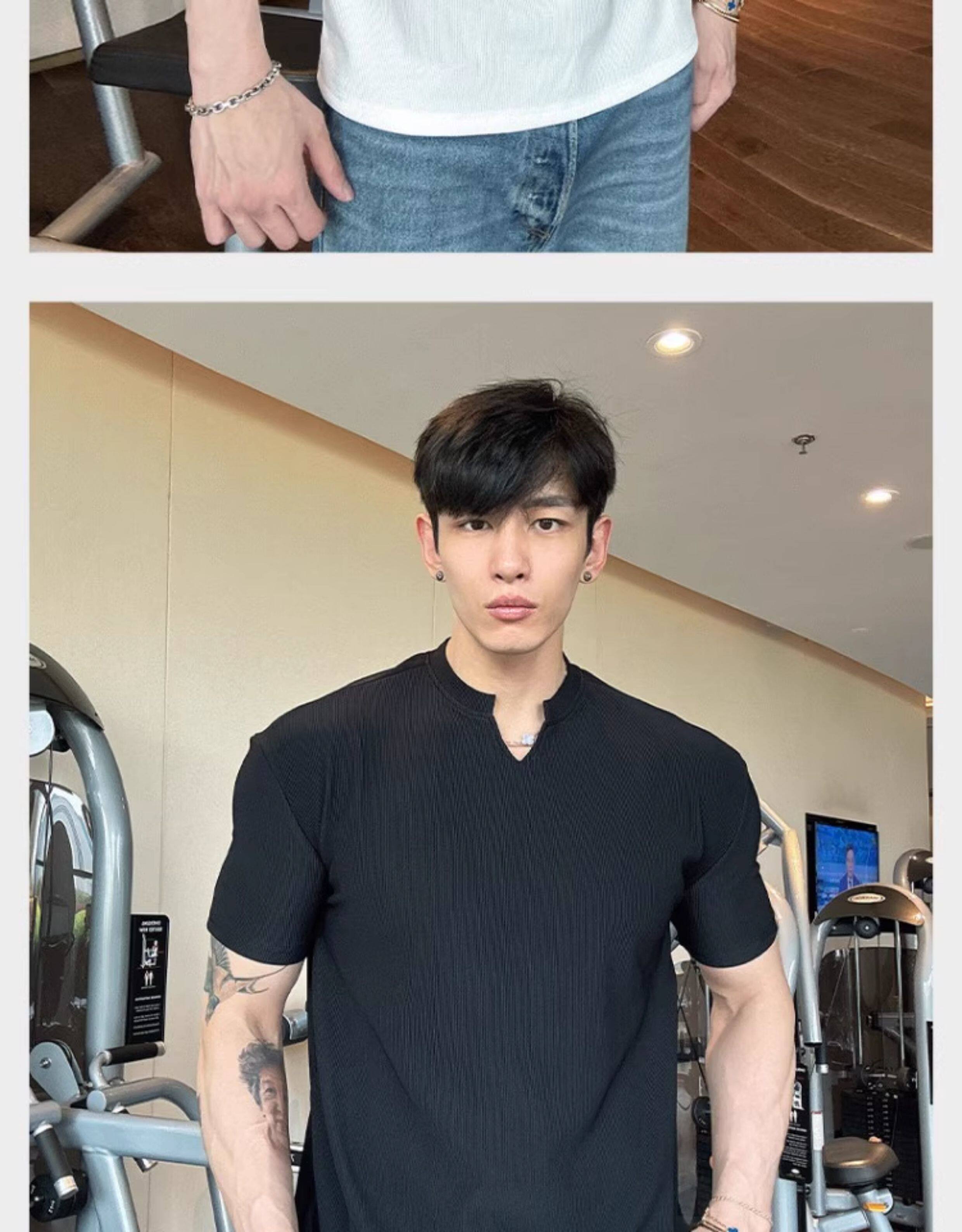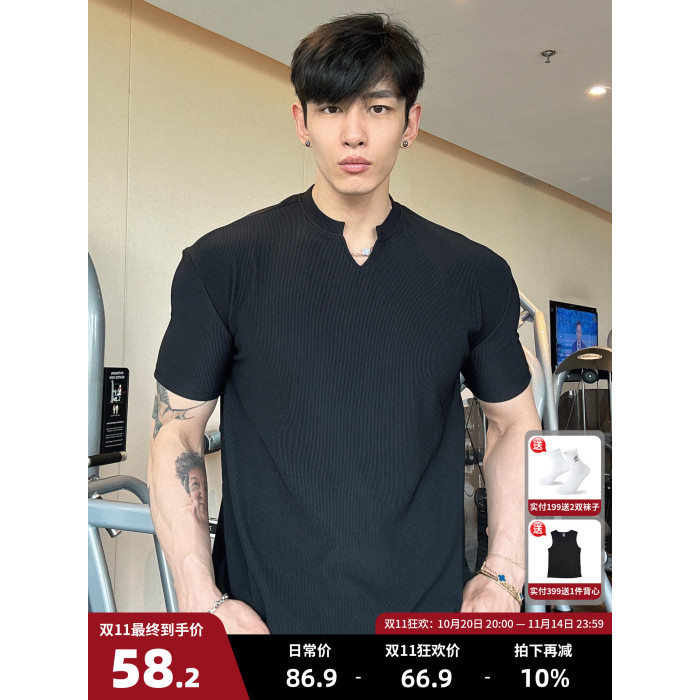 春夏男士純色V領T恤休閒美式細條紋短袖健身運動訓練打底百搭上衣