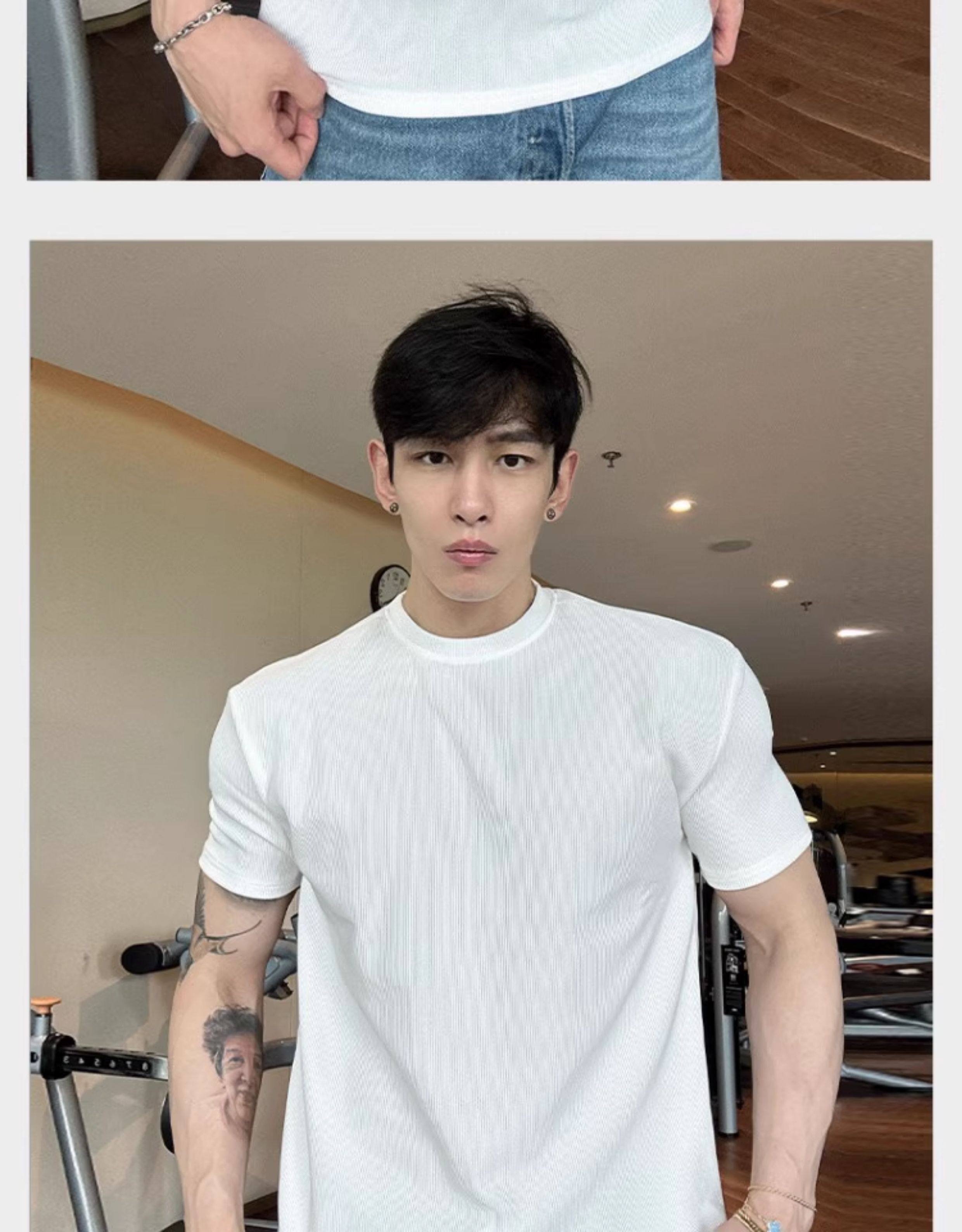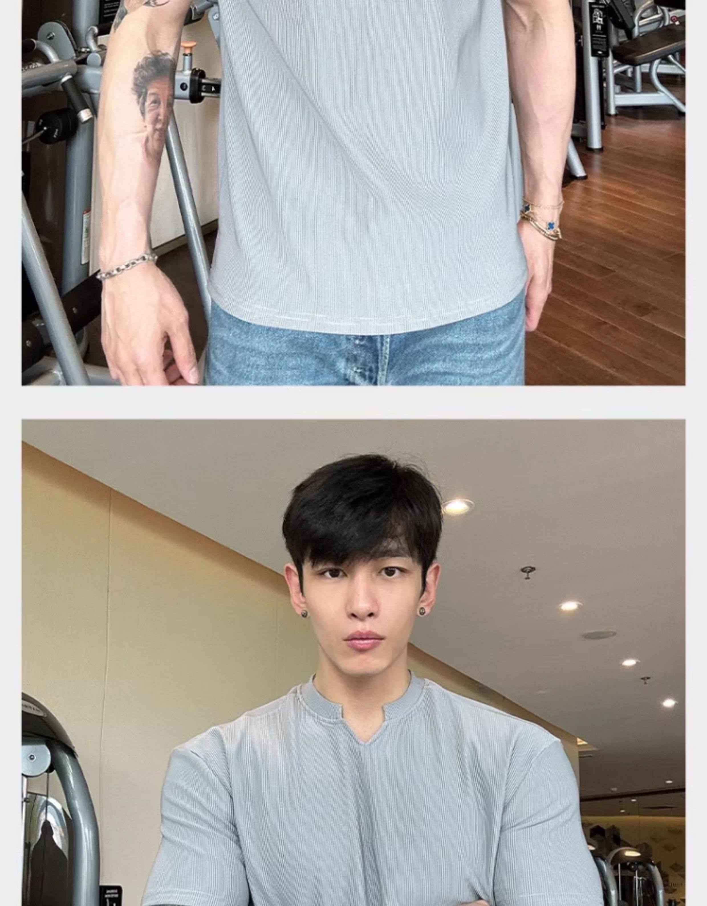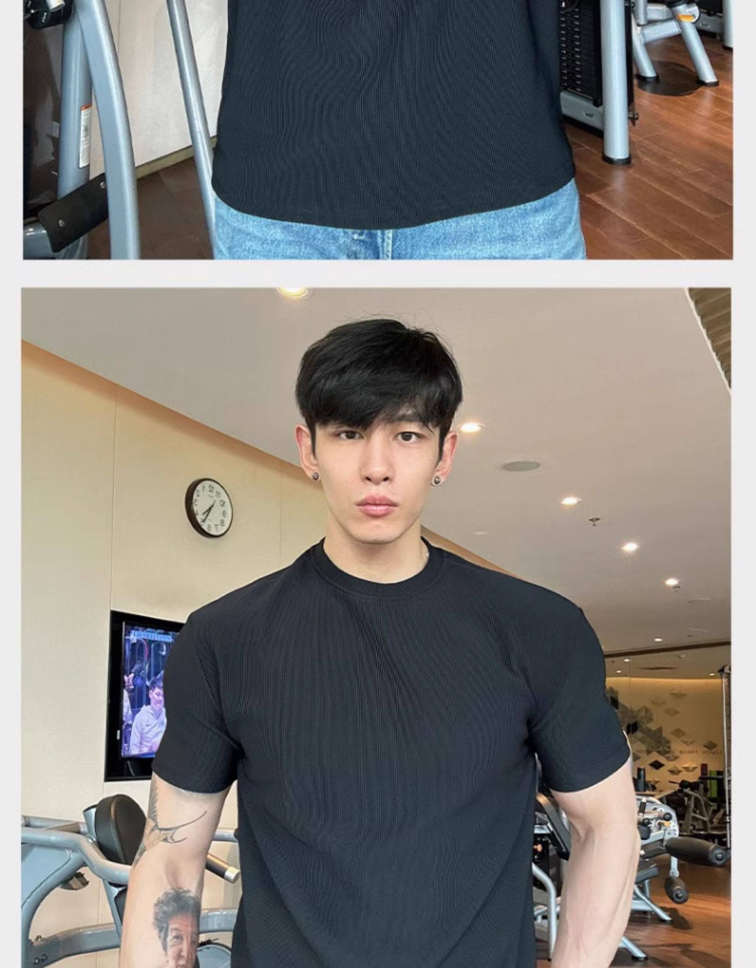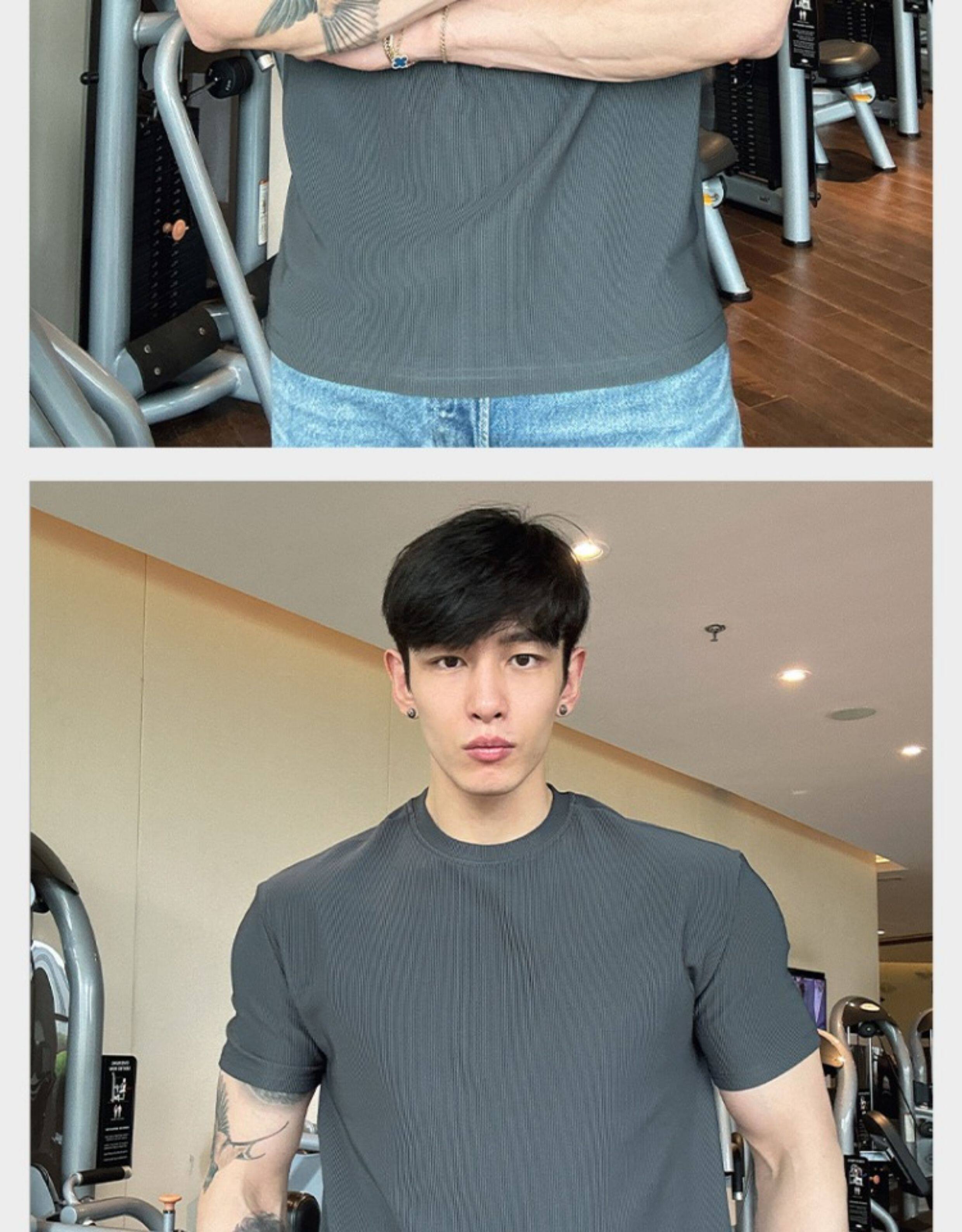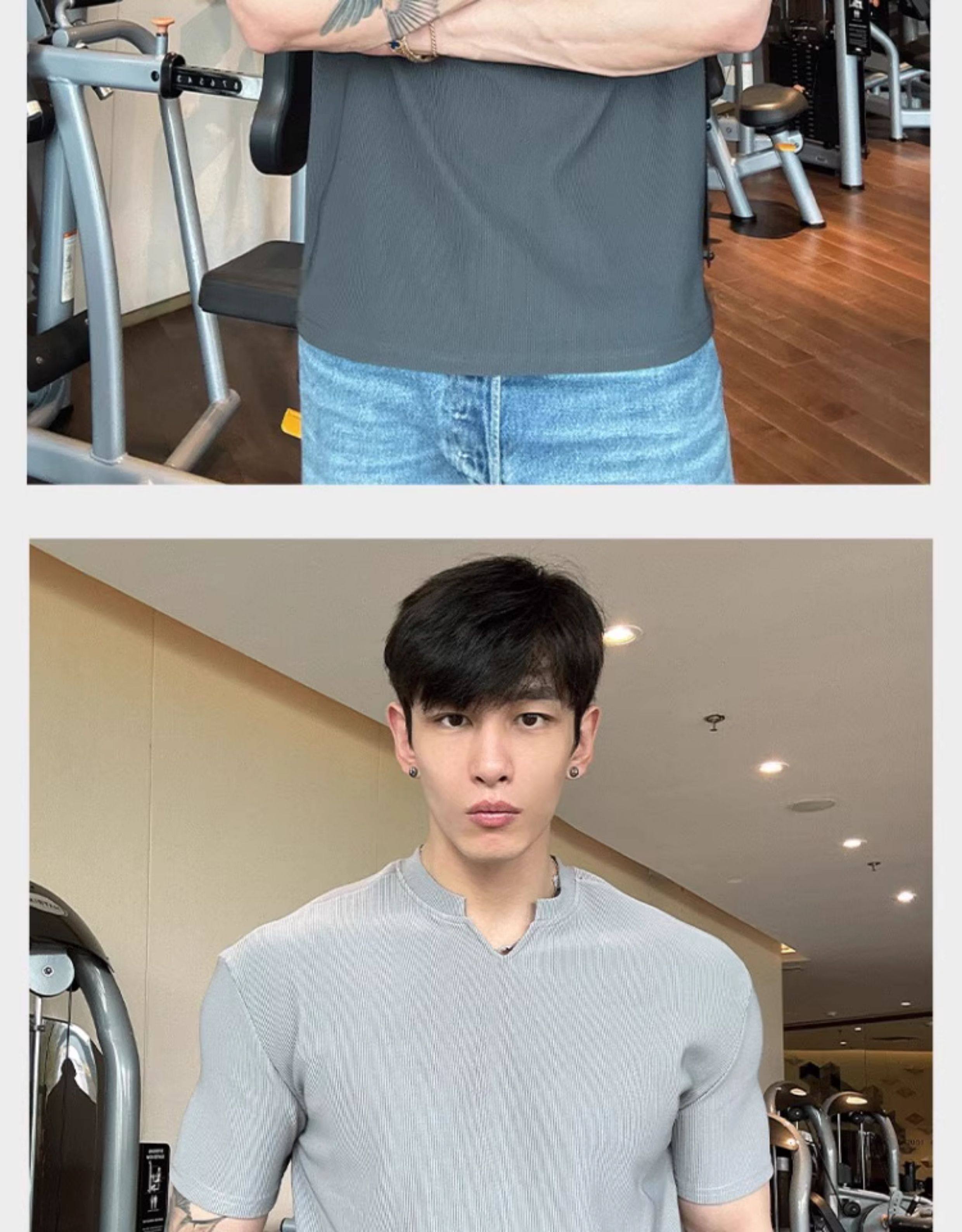 春夏男士純色V領T恤休閒美式細條紋短袖健身運動訓練打底百搭上衣