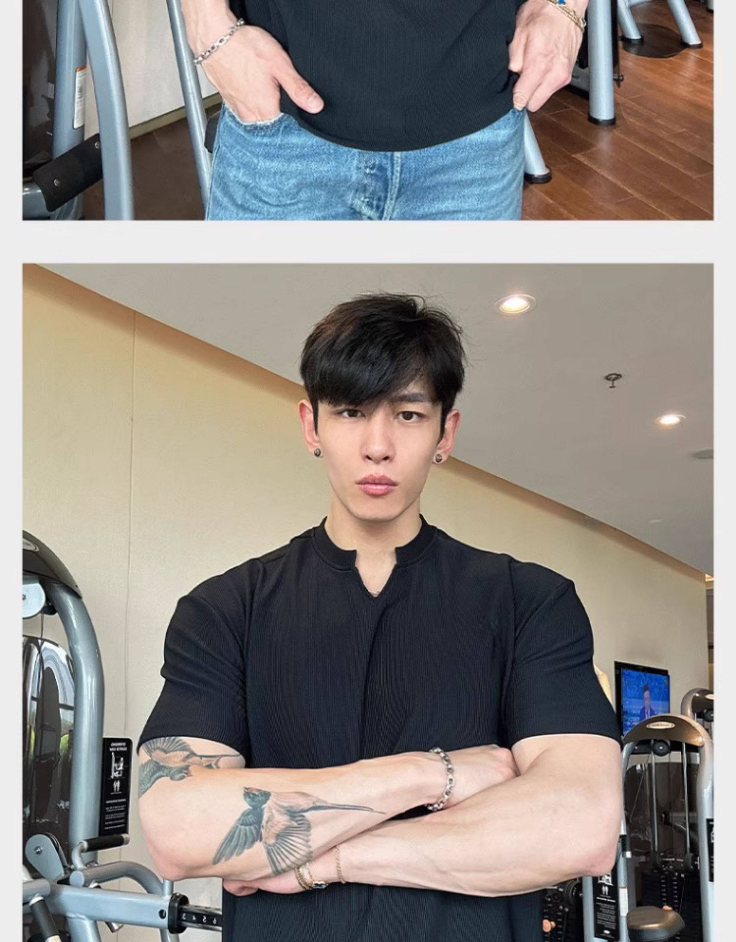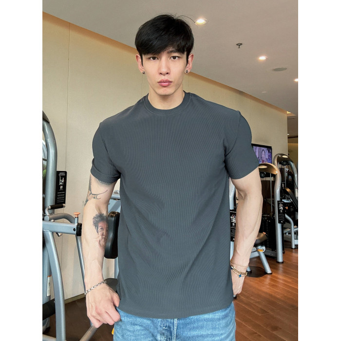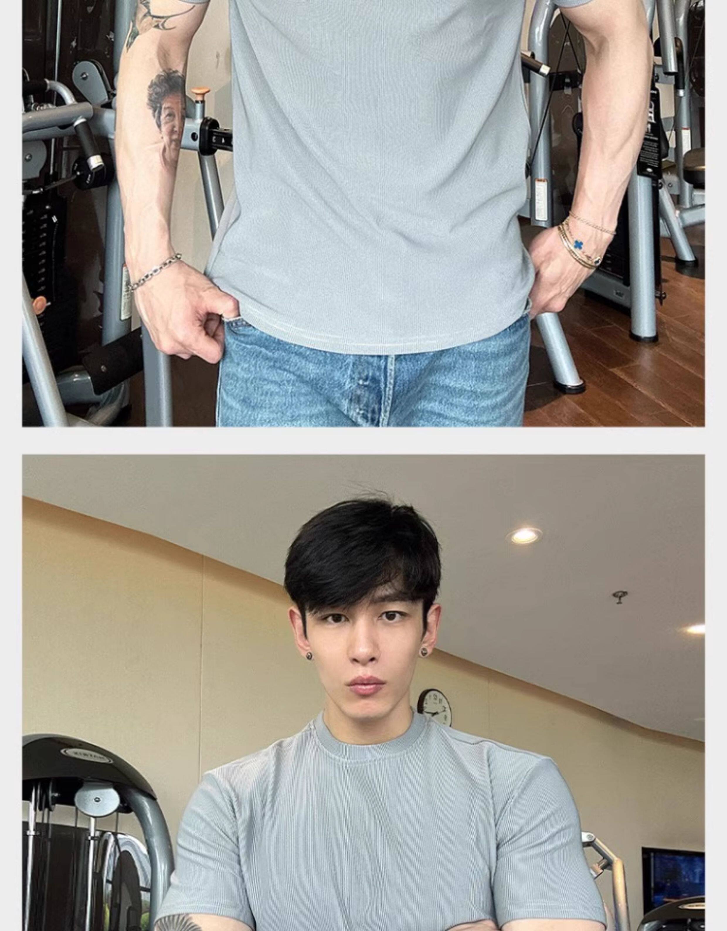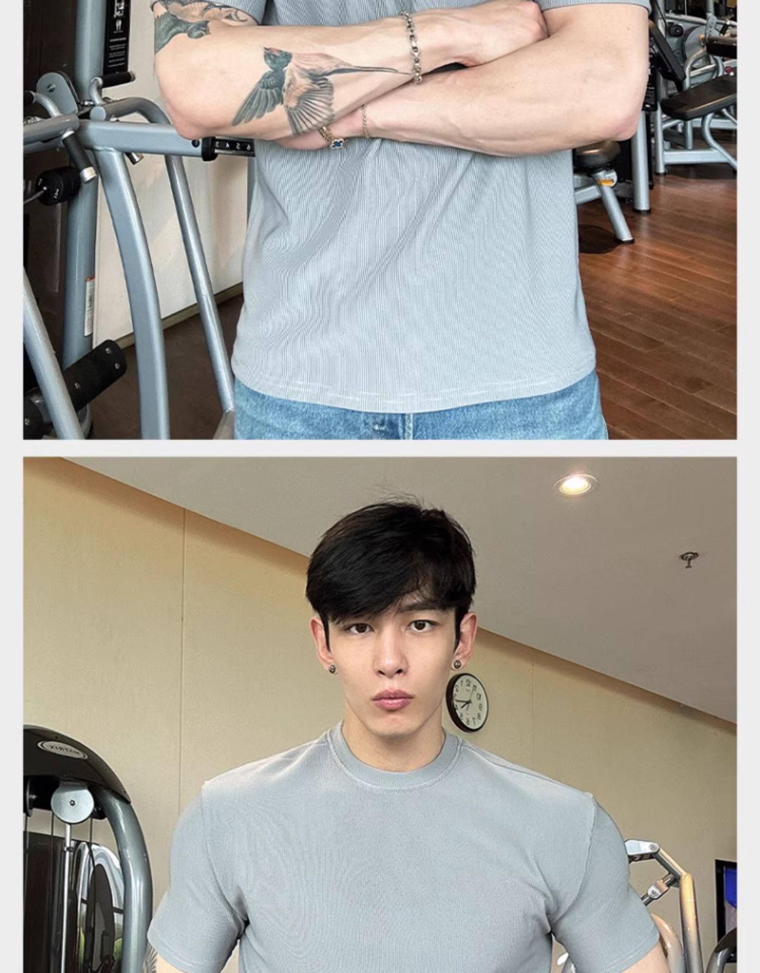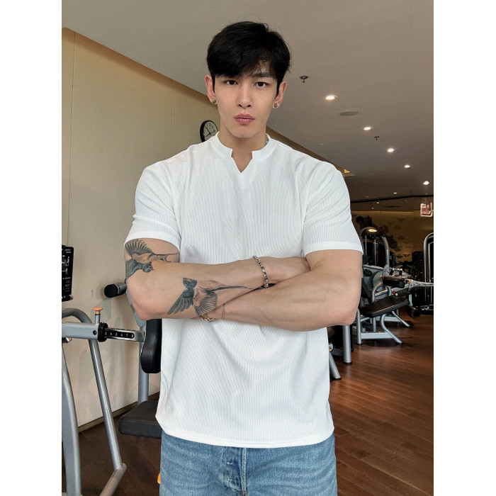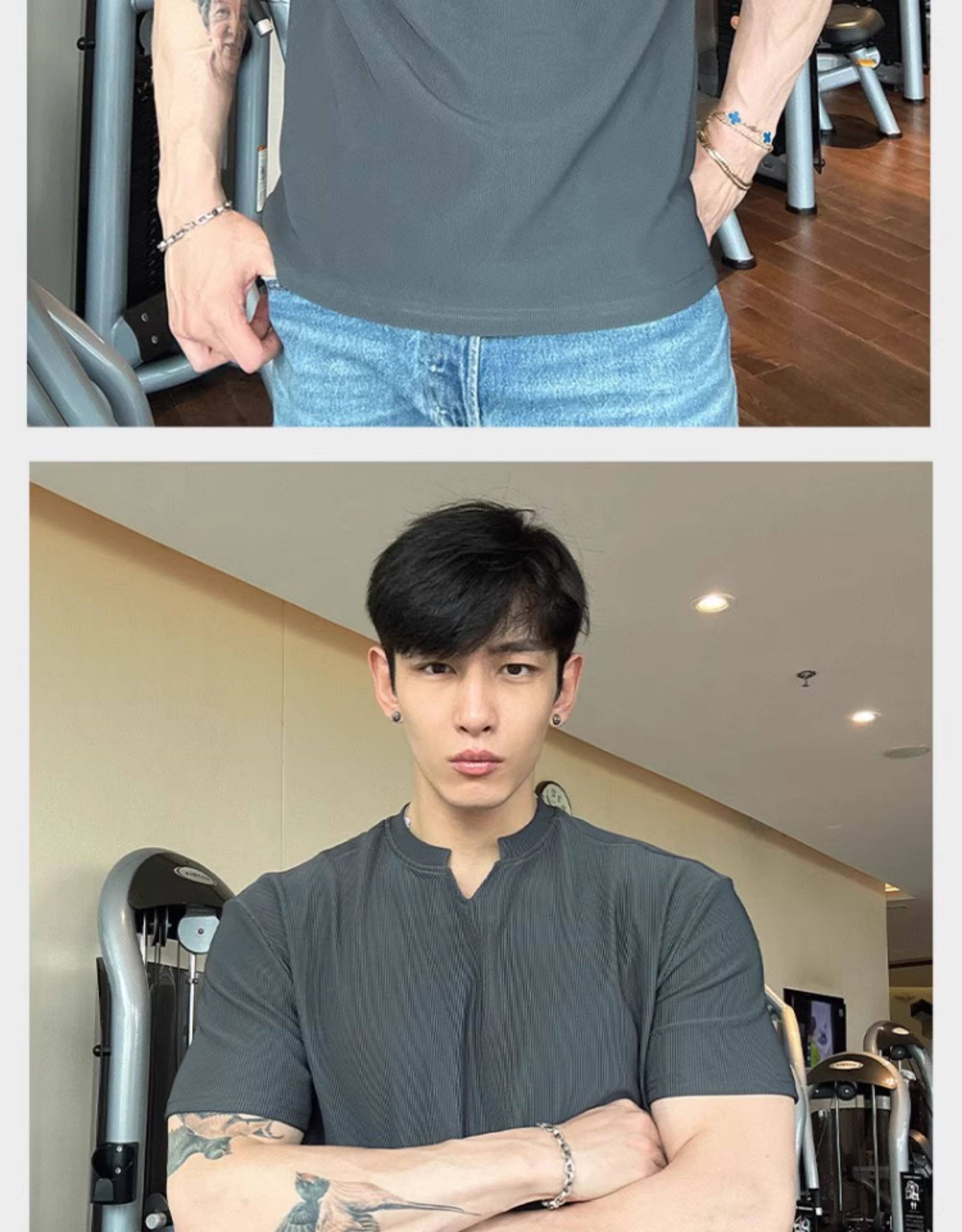春夏男士純色V領T恤休閒美式細條紋短袖健身運動訓練打底百搭上衣