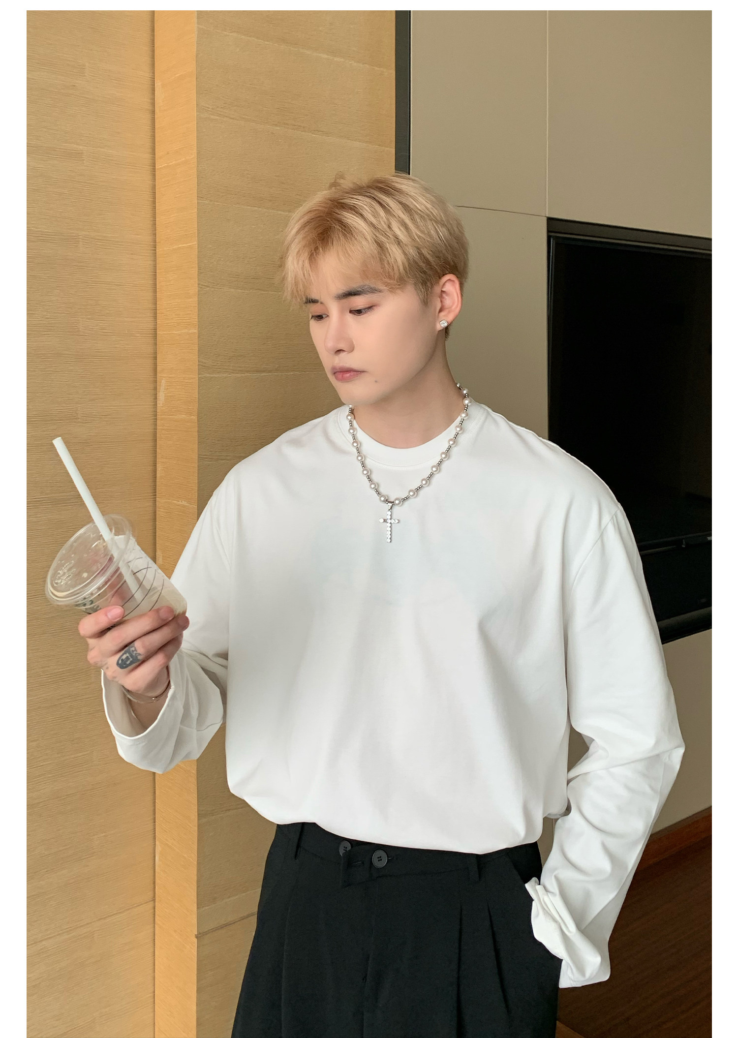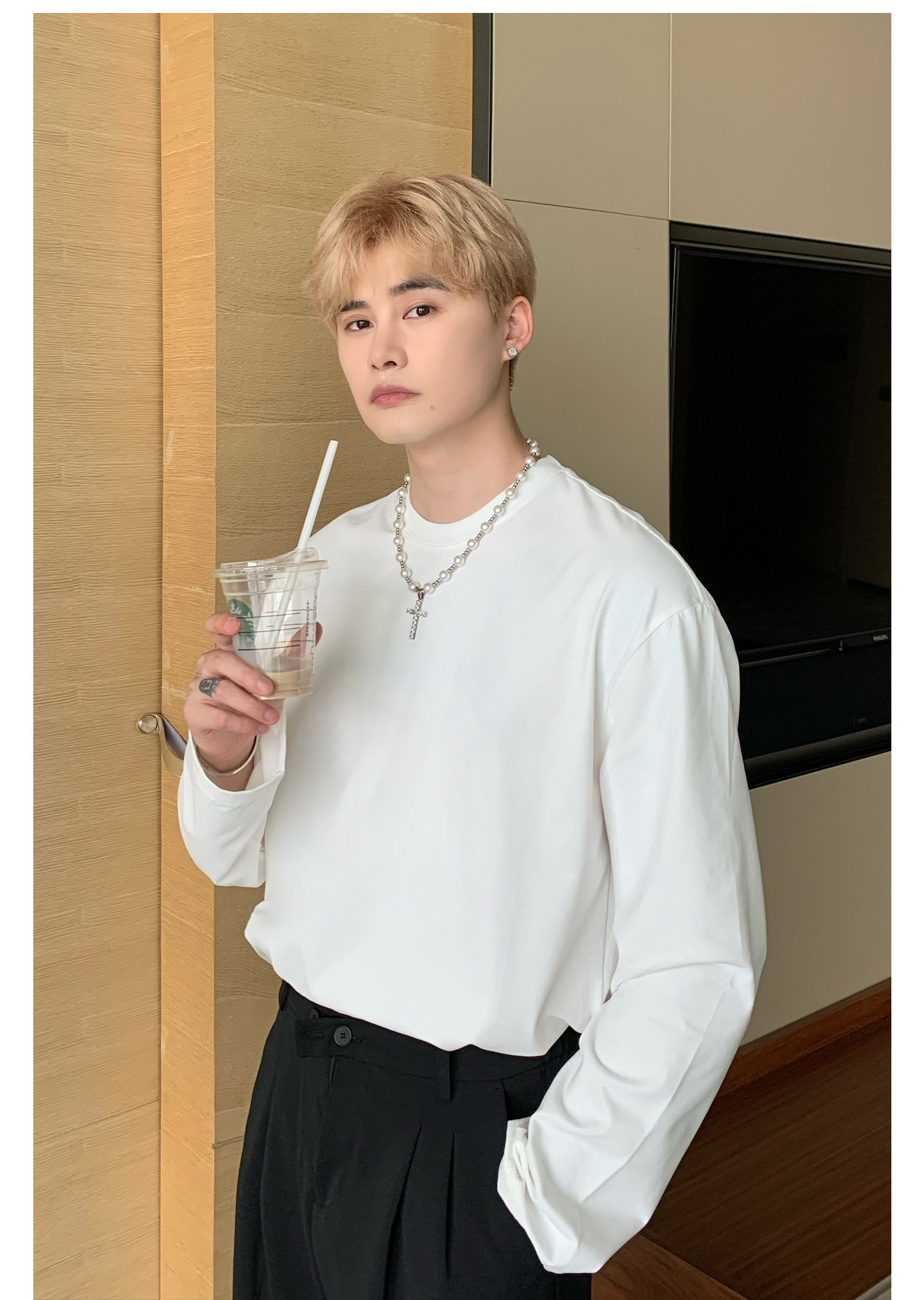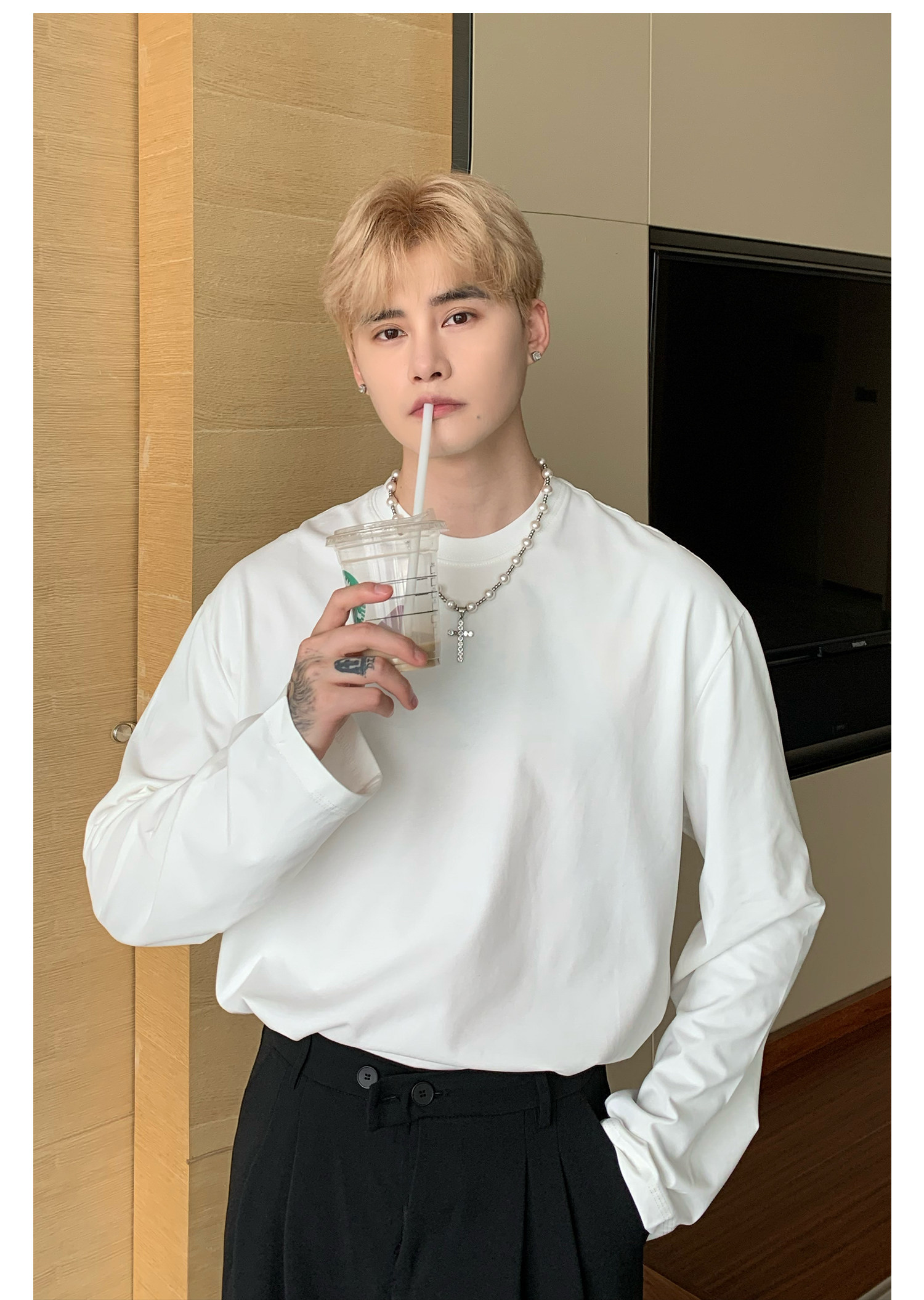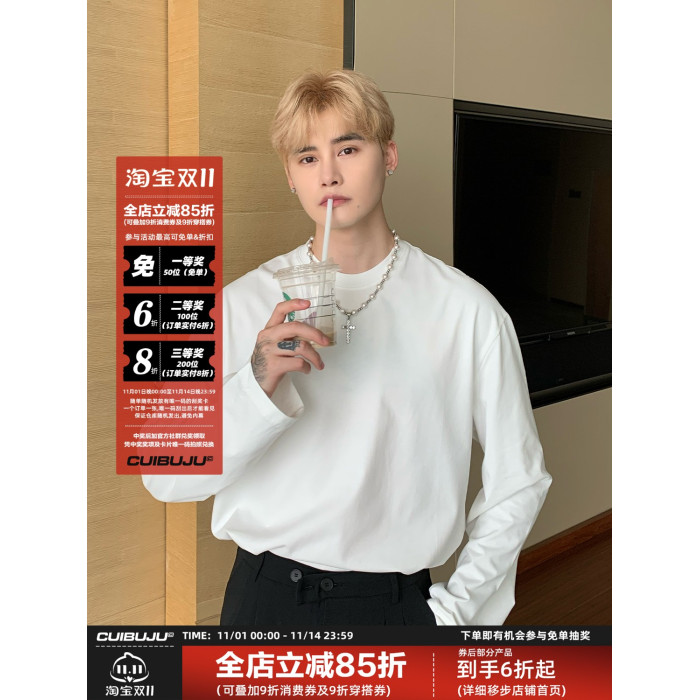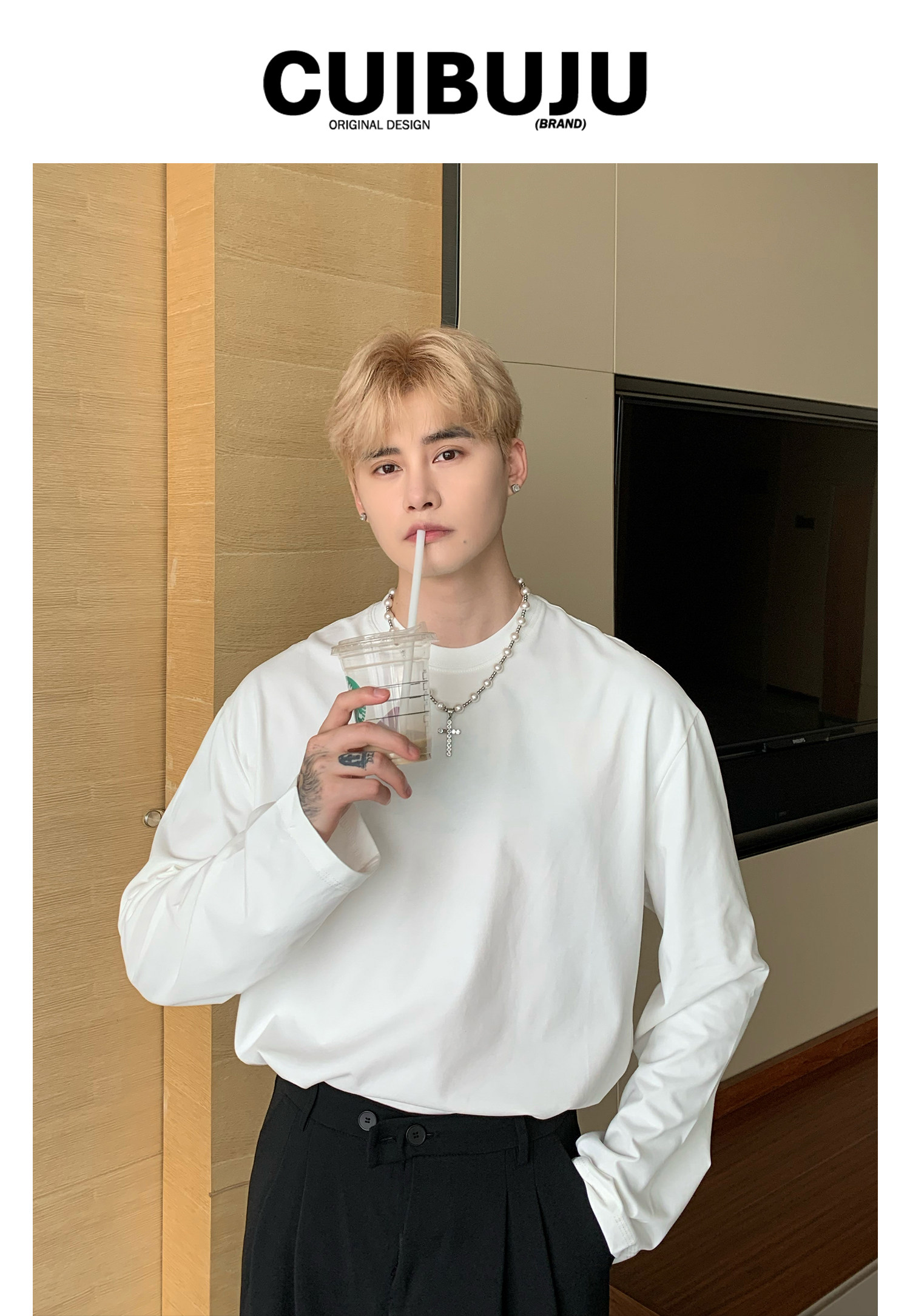 cuibuju 高品質純棉內搭打底衫男寬松秋冬圓領純白淨色長袖T恤ins