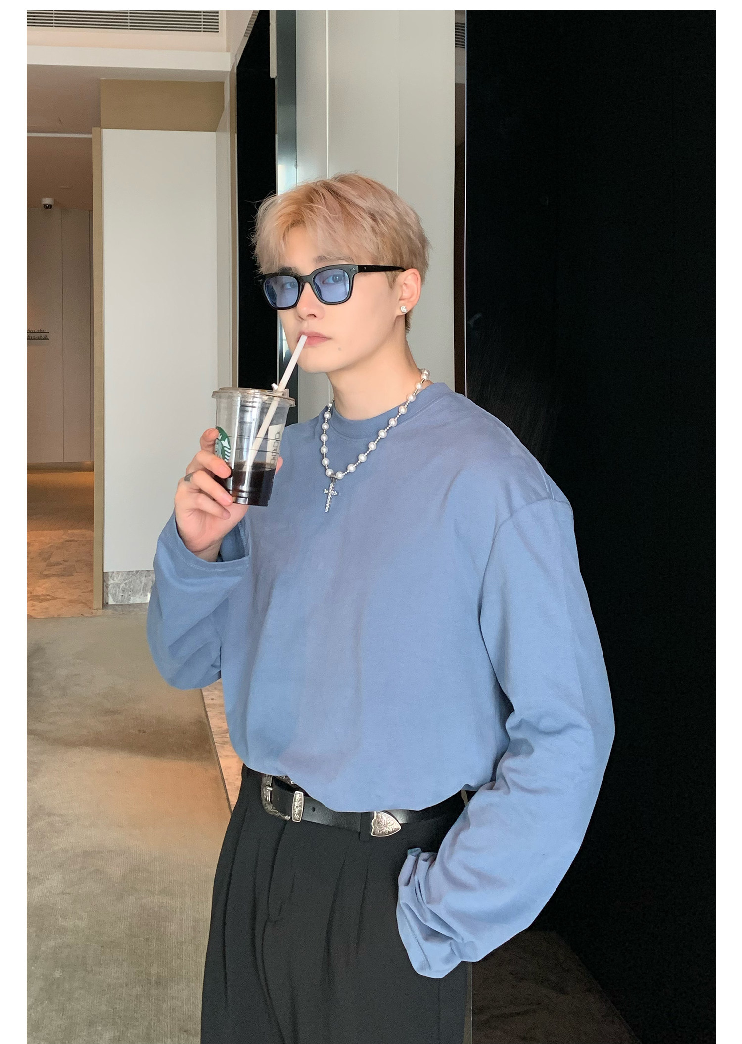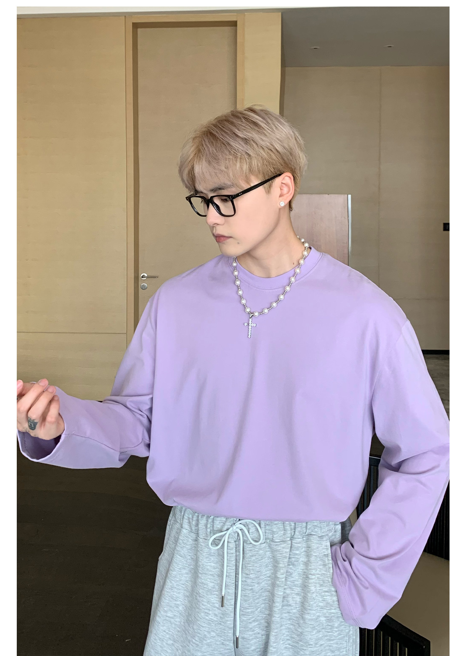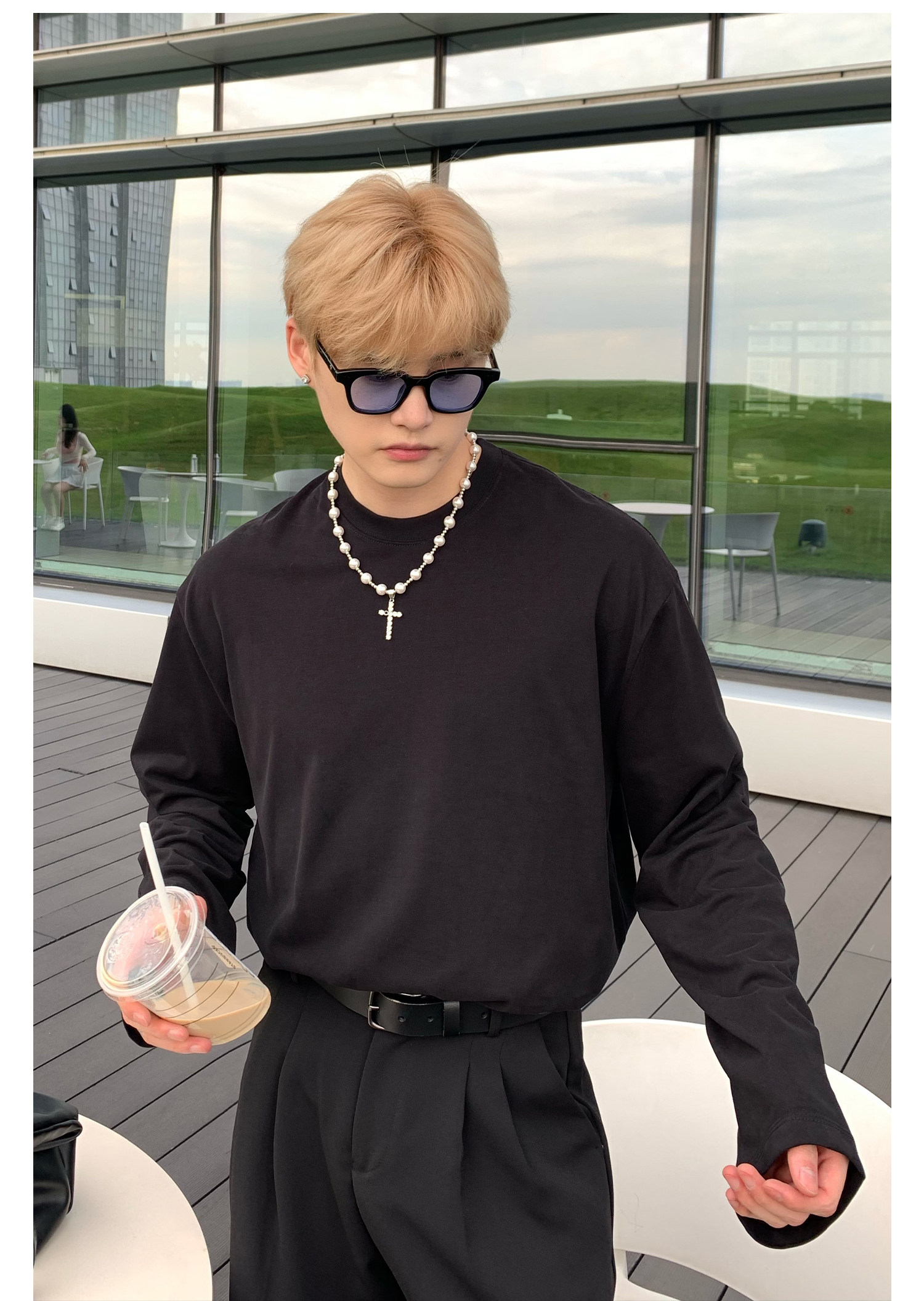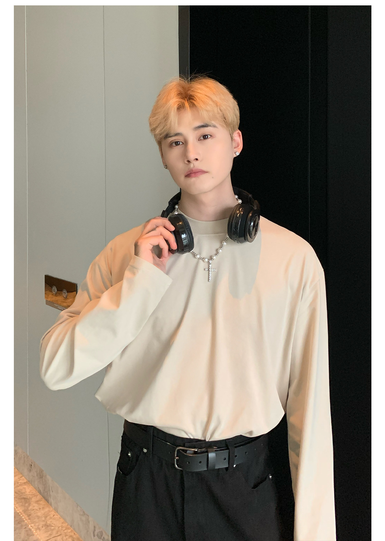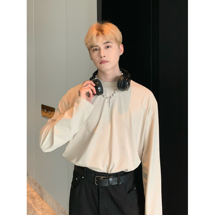 cuibuju 高品質純棉內搭打底衫男寬松秋冬圓領純白淨色長袖T恤ins
