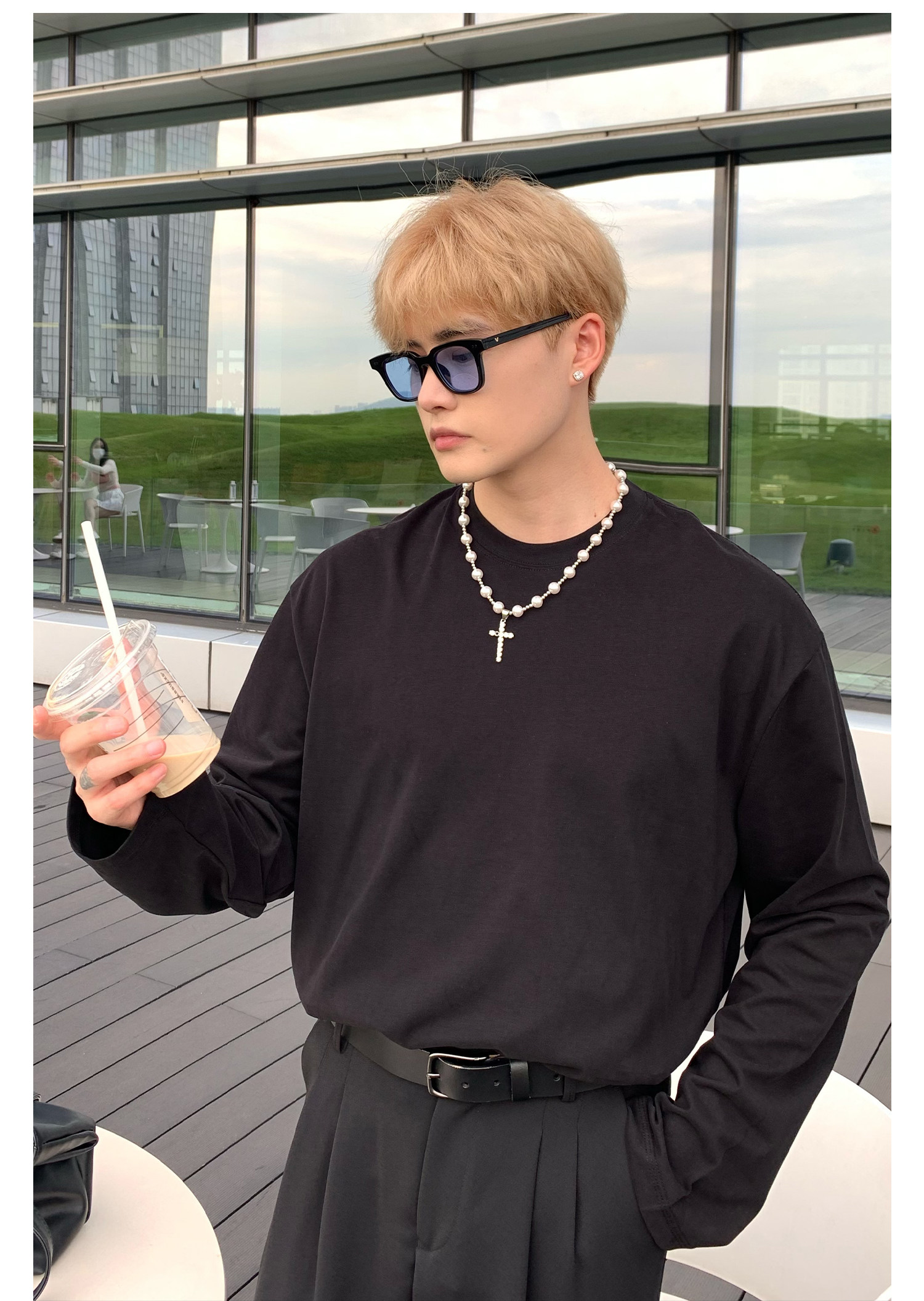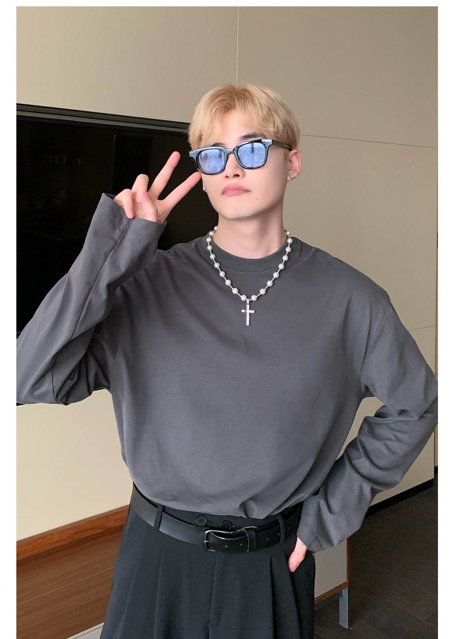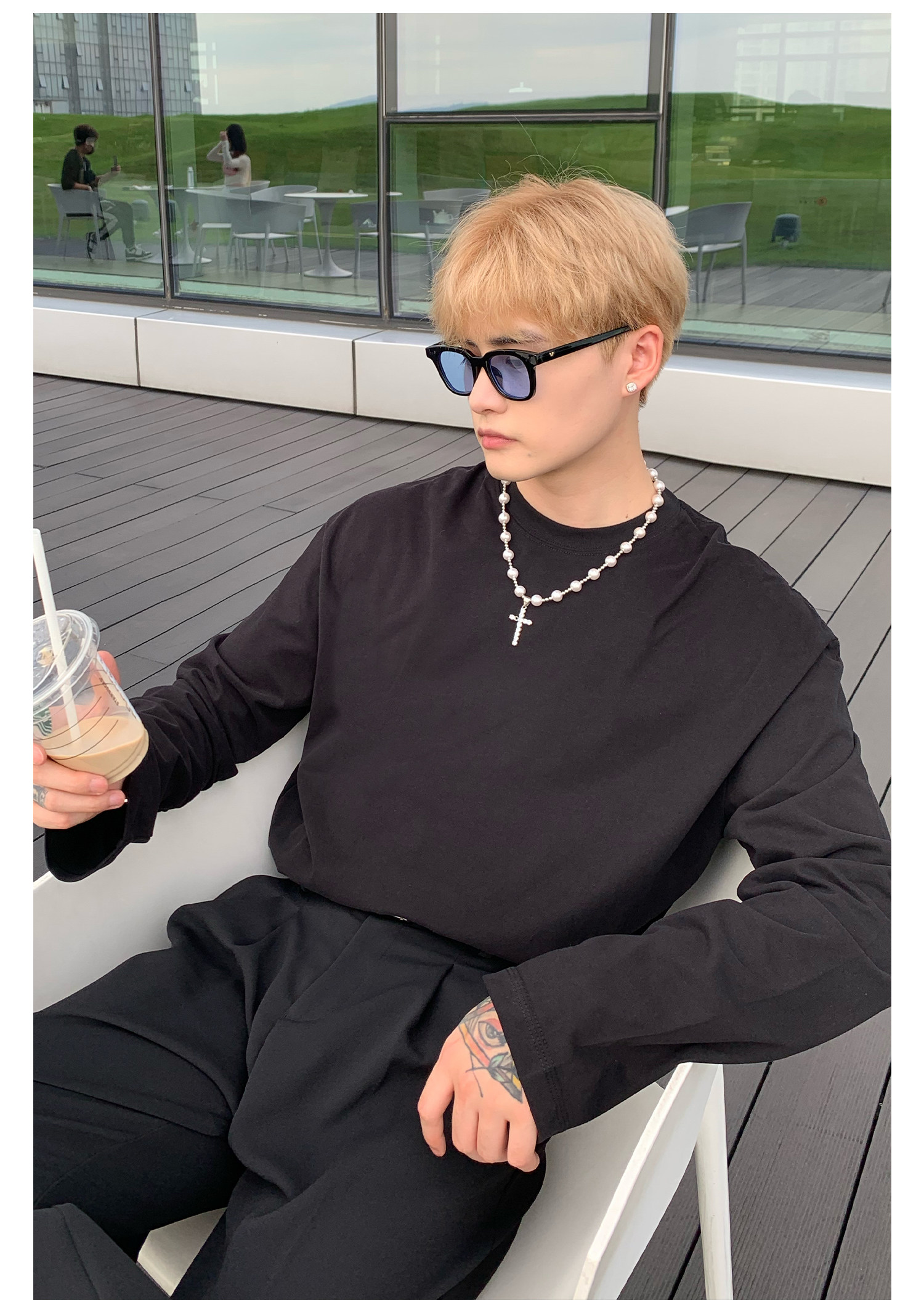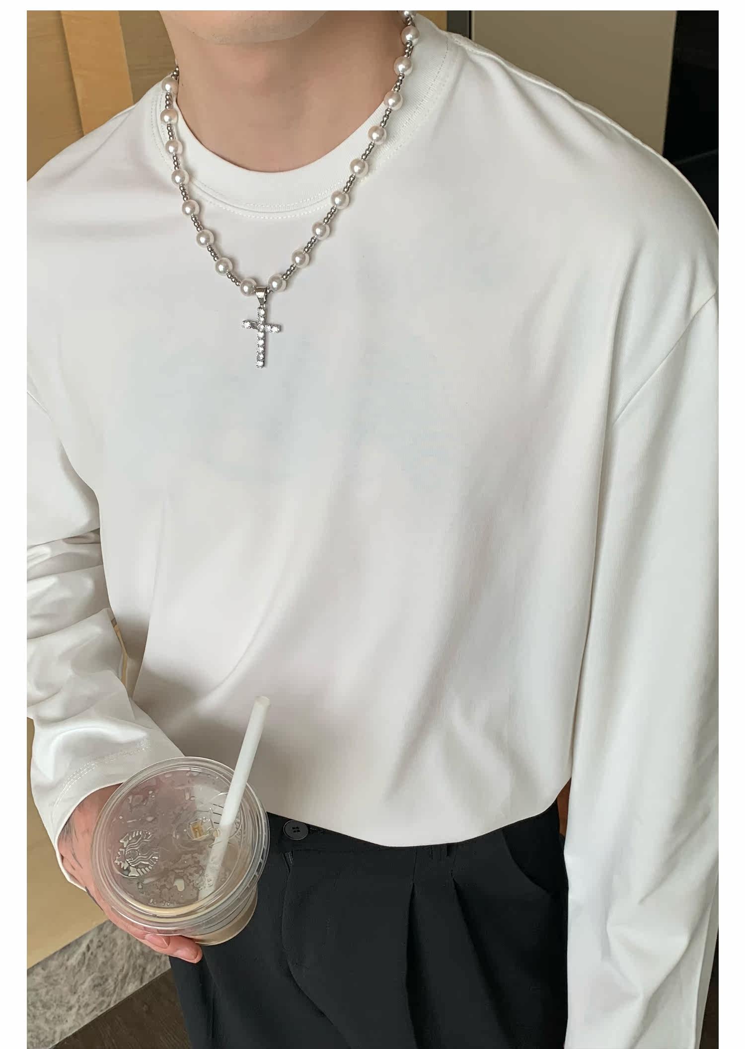 cuibuju 高品質純棉內搭打底衫男寬松秋冬圓領純白淨色長袖T恤ins