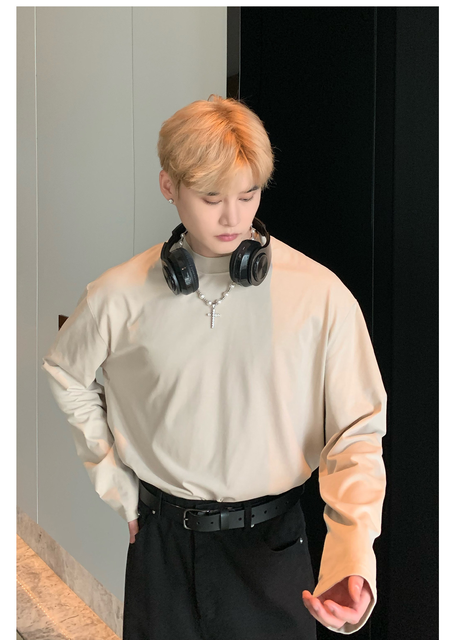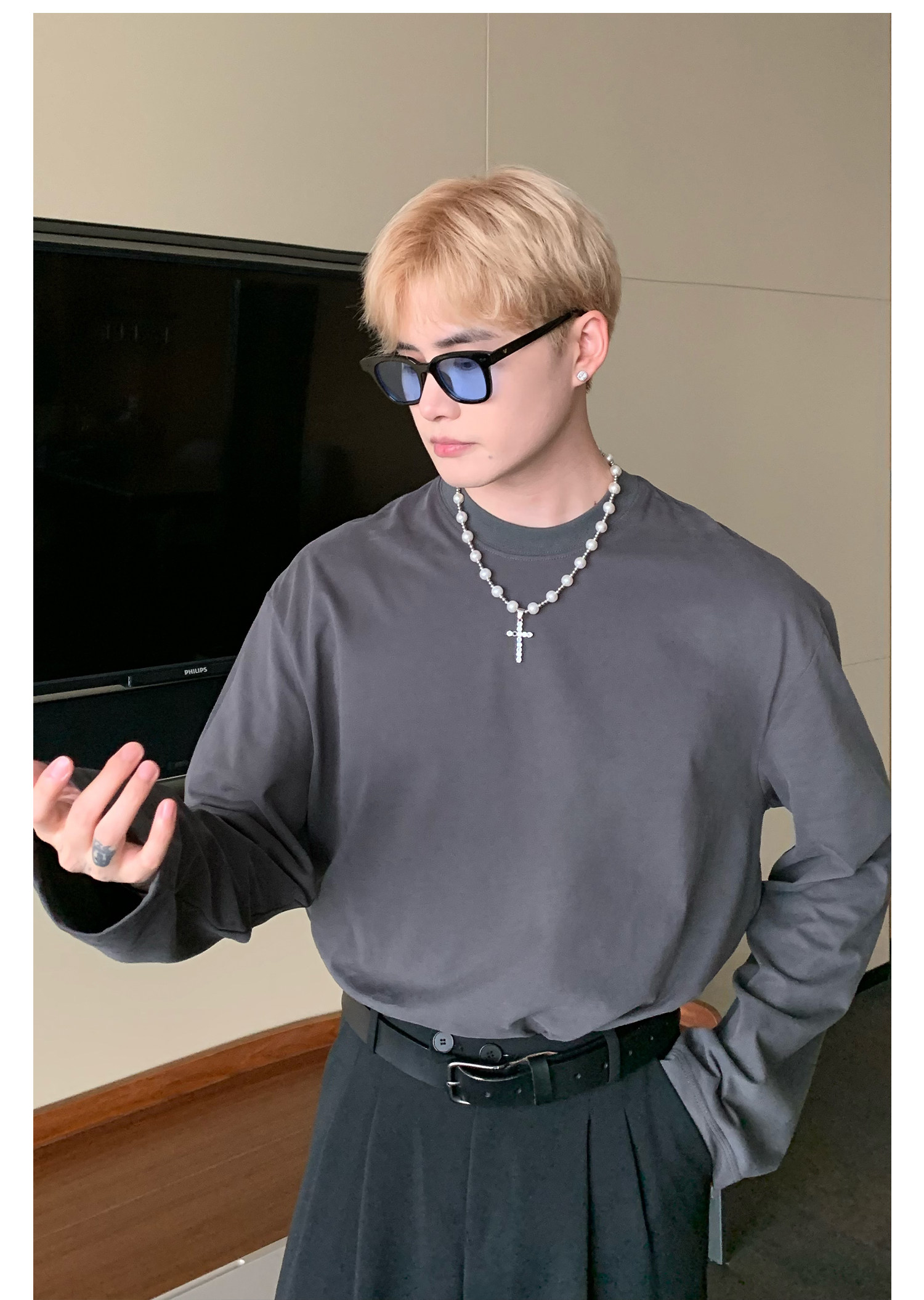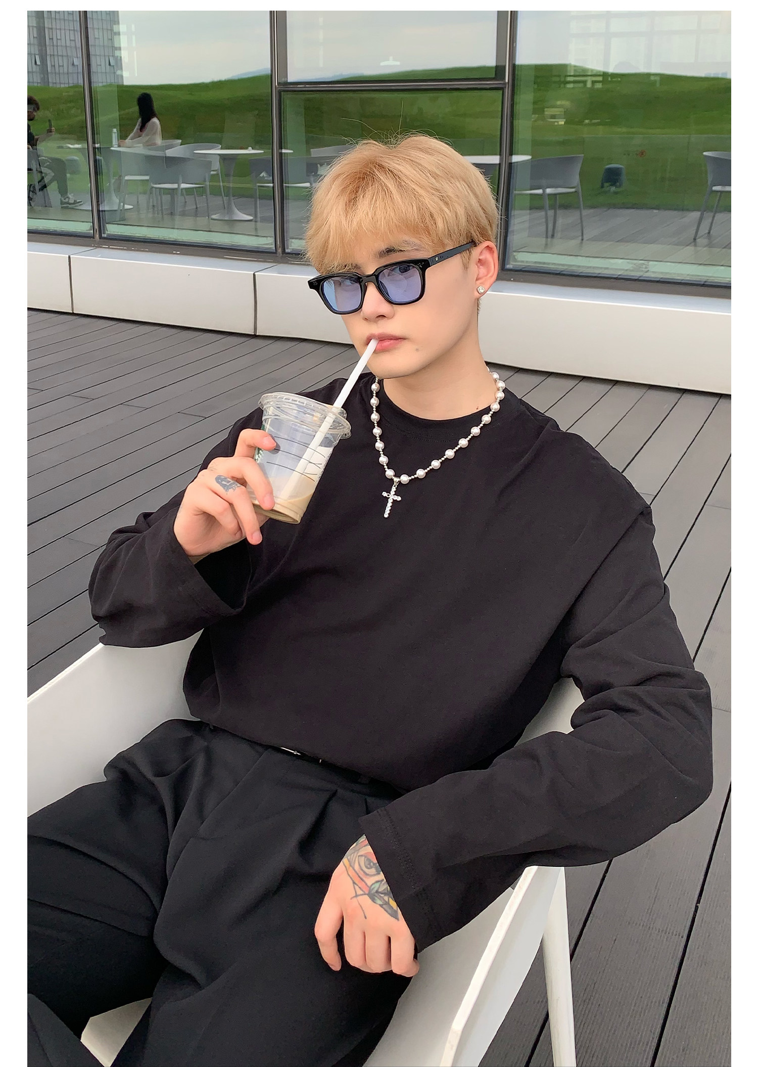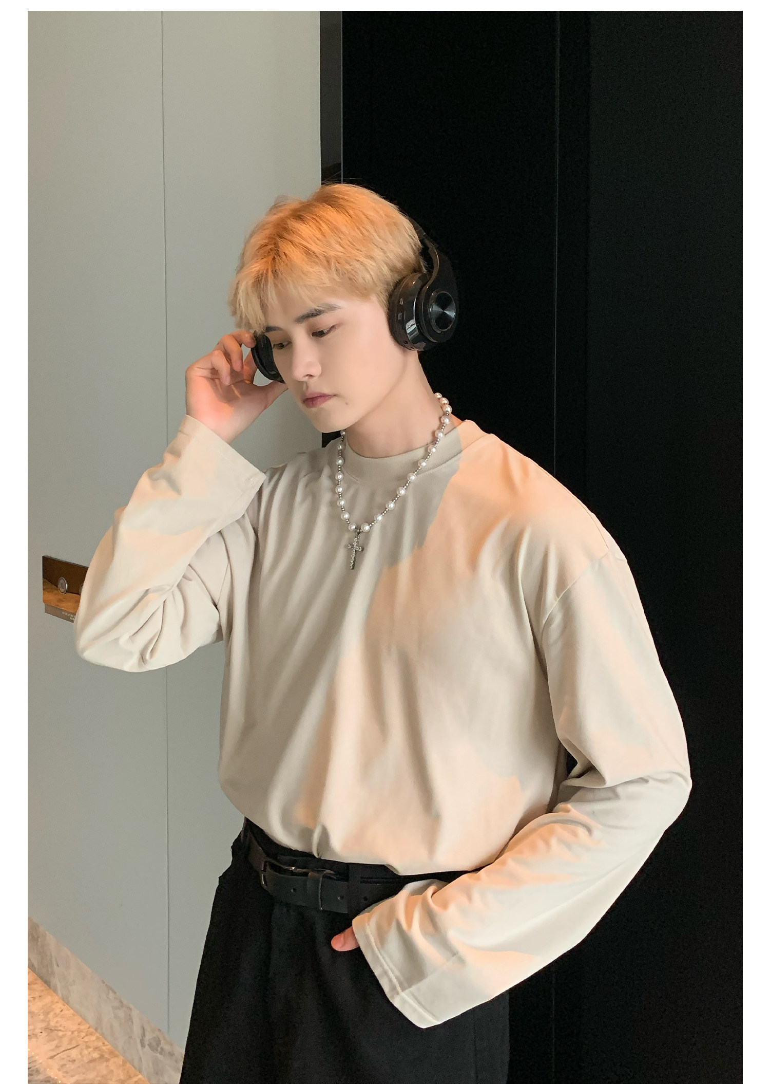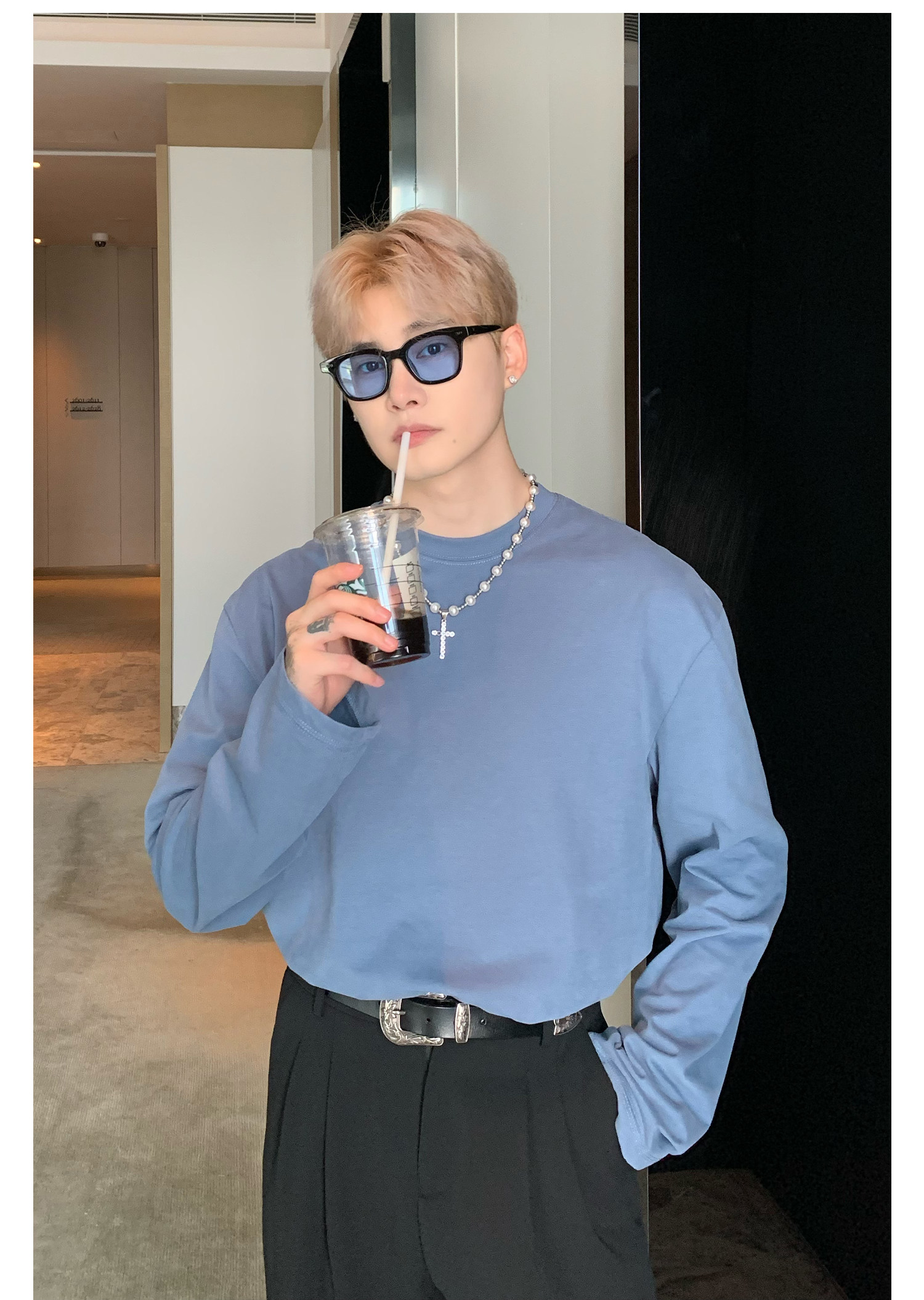 cuibuju 高品質純棉內搭打底衫男寬松秋冬圓領純白淨色長袖T恤ins