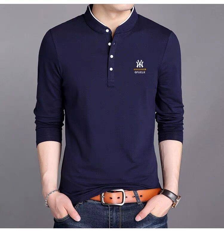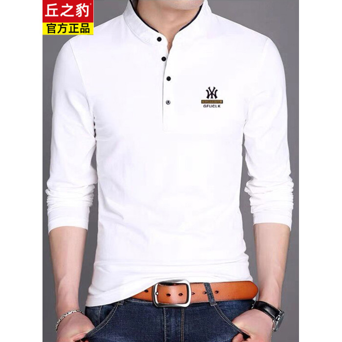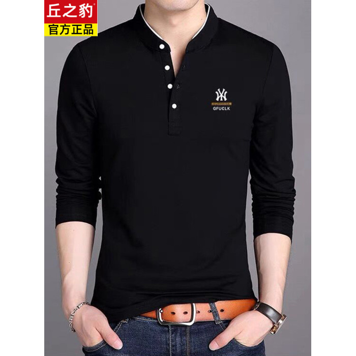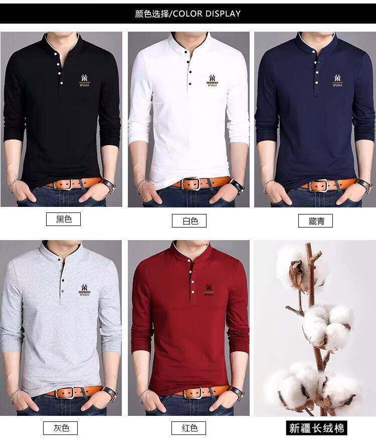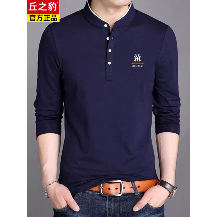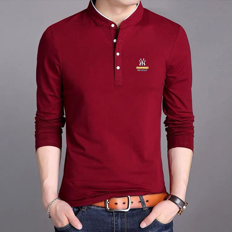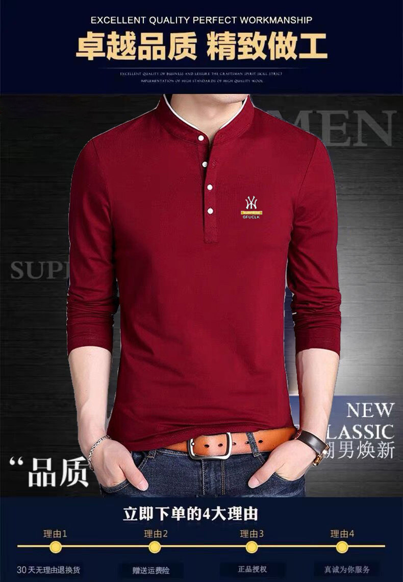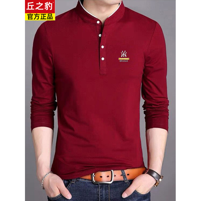 男裝春秋薄款立領純棉長袖t恤男秋裝上衣男士冬季加厚紅色打底衫