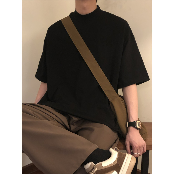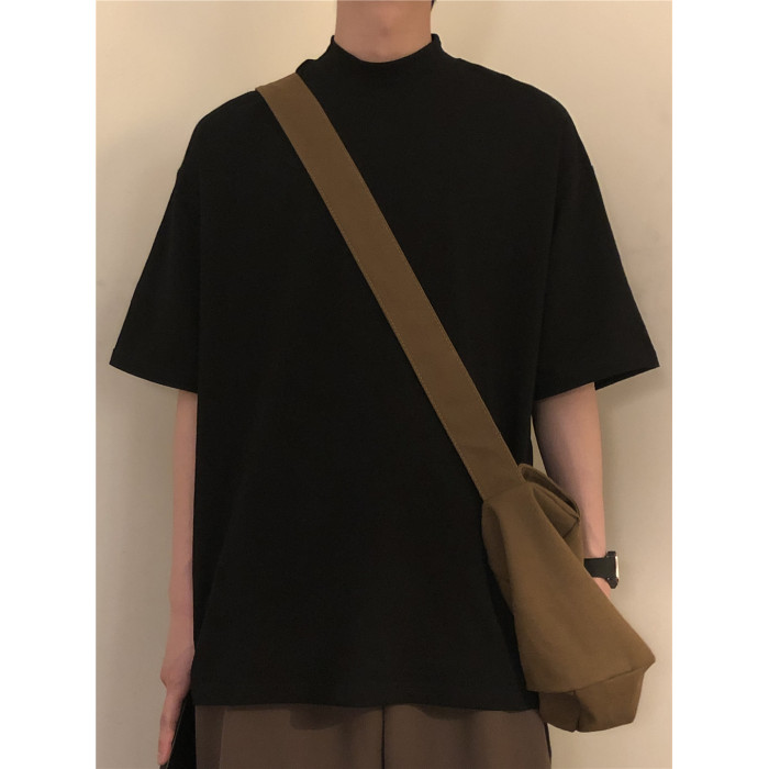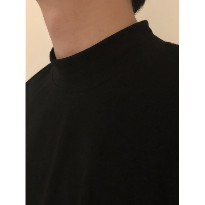 日系新款潮牌黑色半高領T恤男ina高街百搭純色短袖寬松五分袖上衣