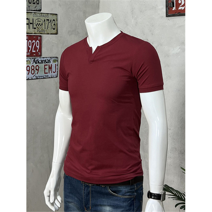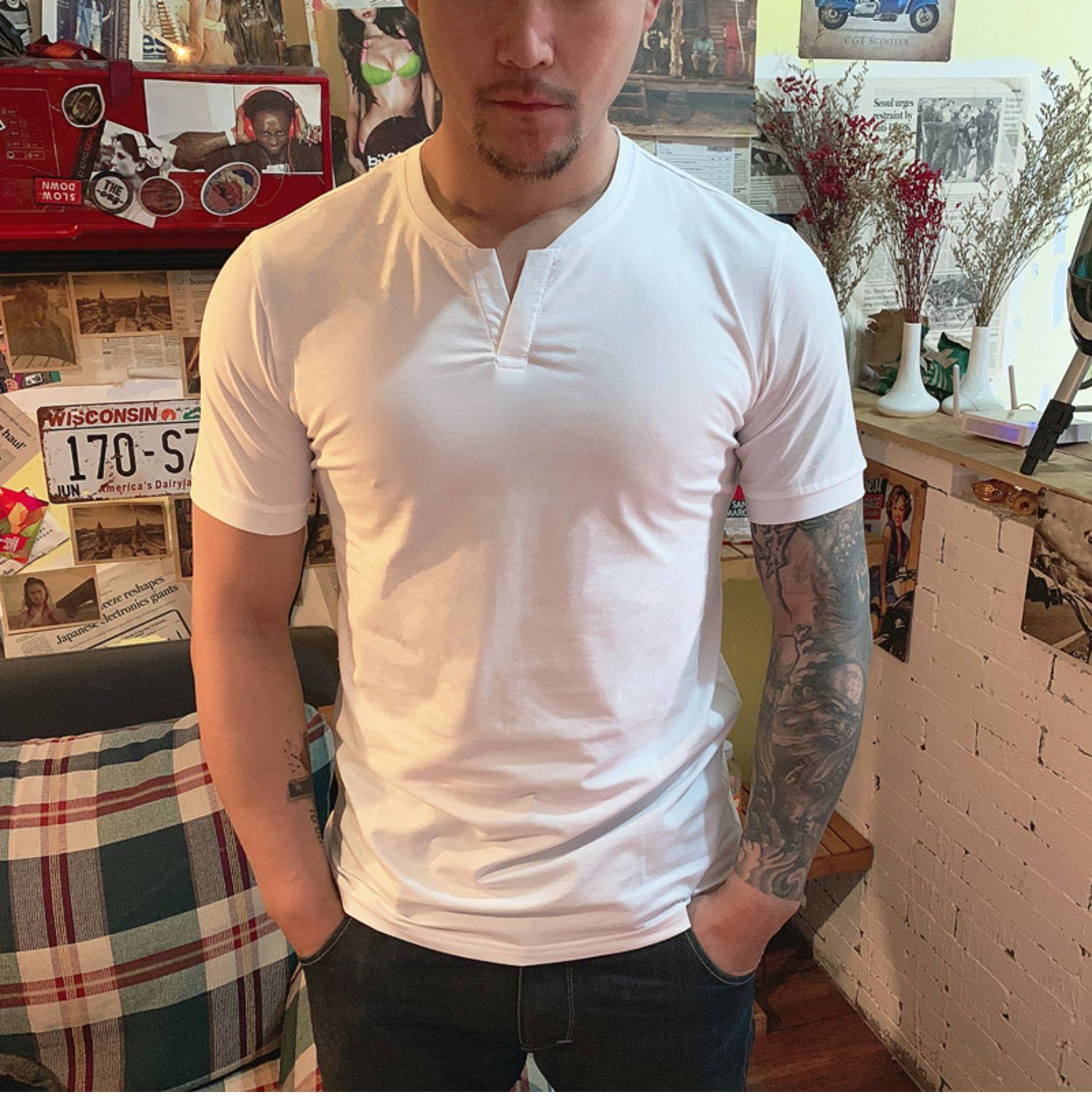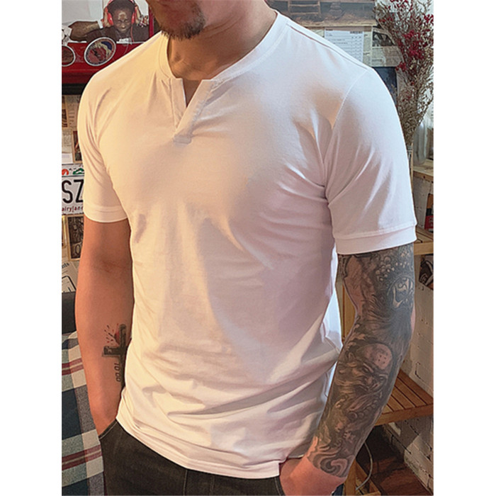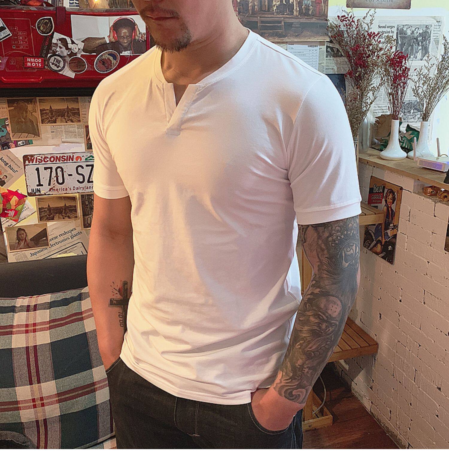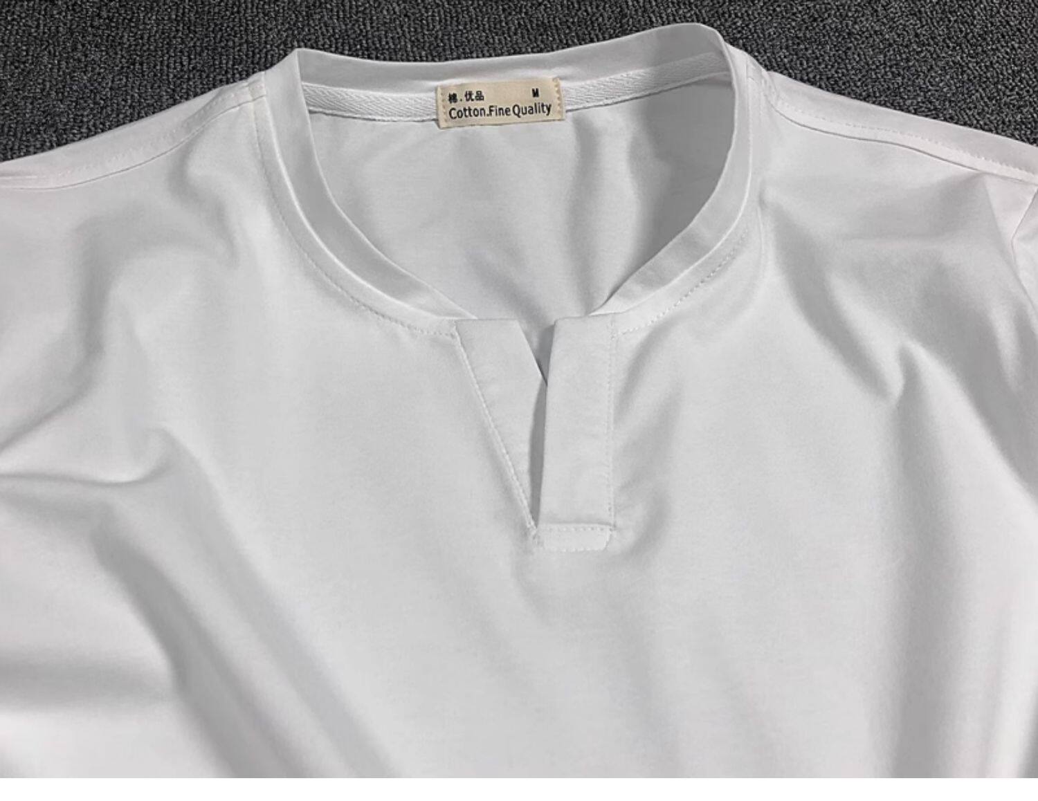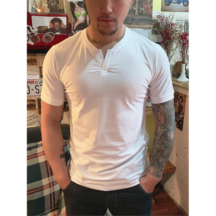 棉開V筒男士短袖亨利領美式復古硬漢純色T恤修身上衣簡約薄款高級