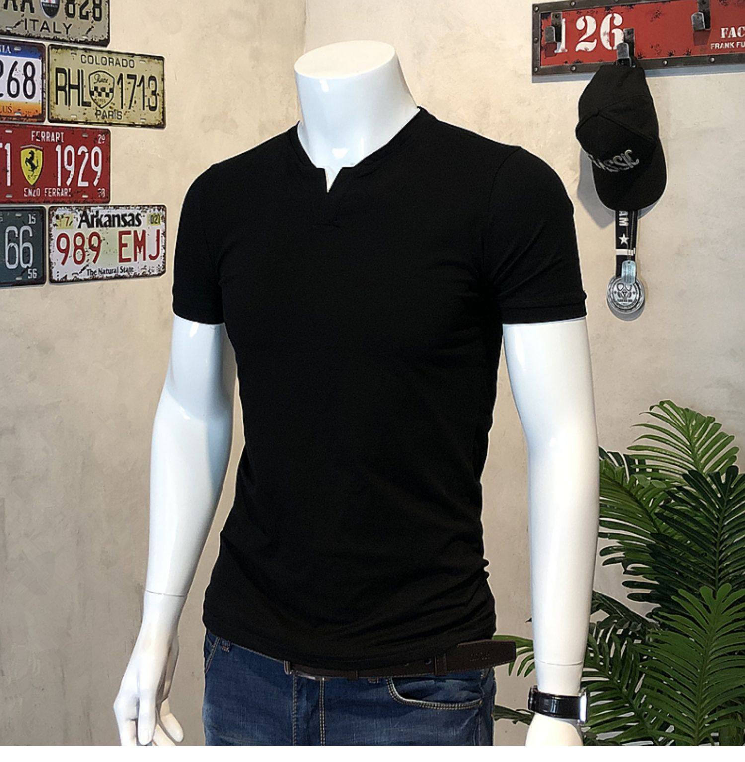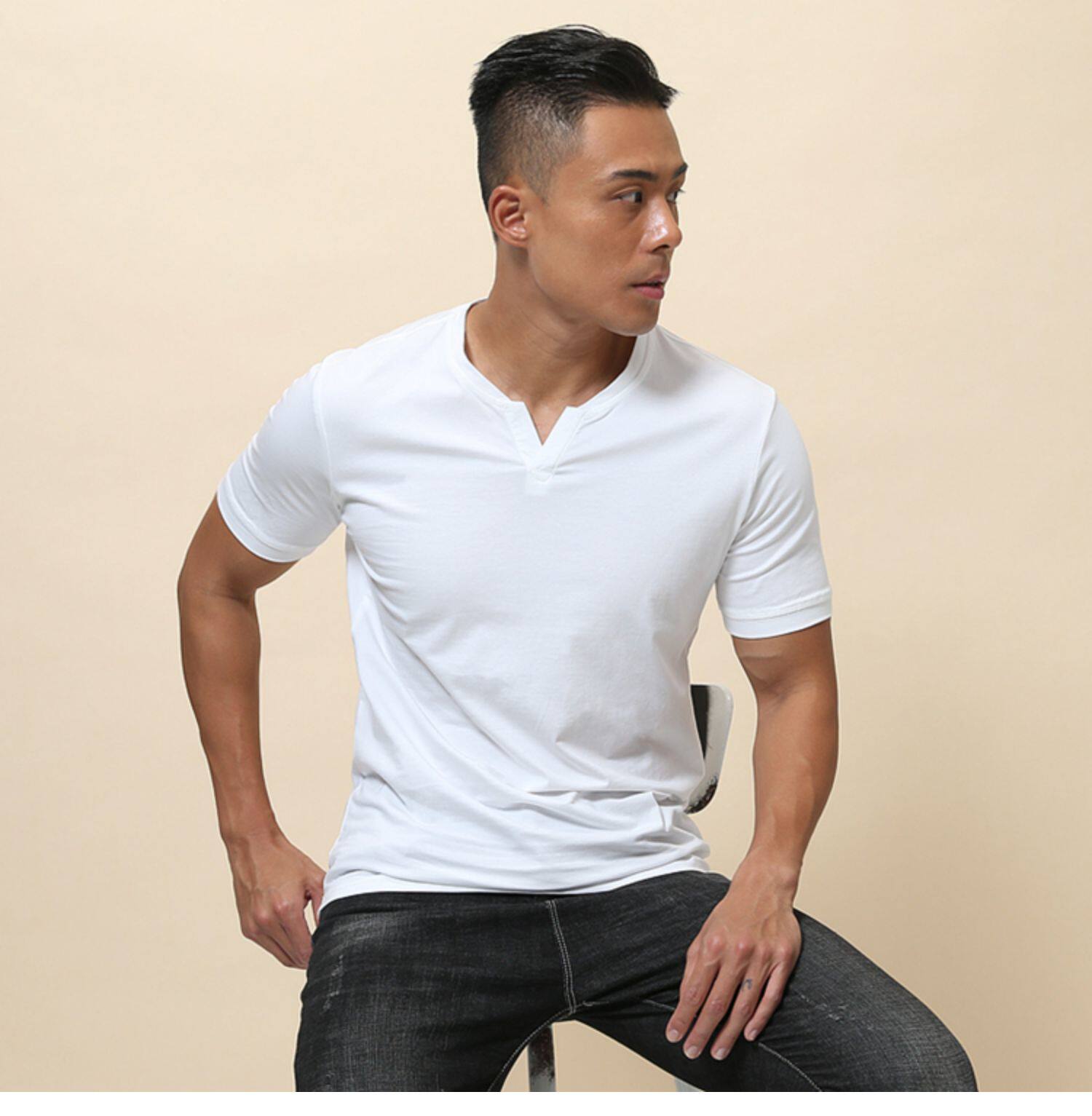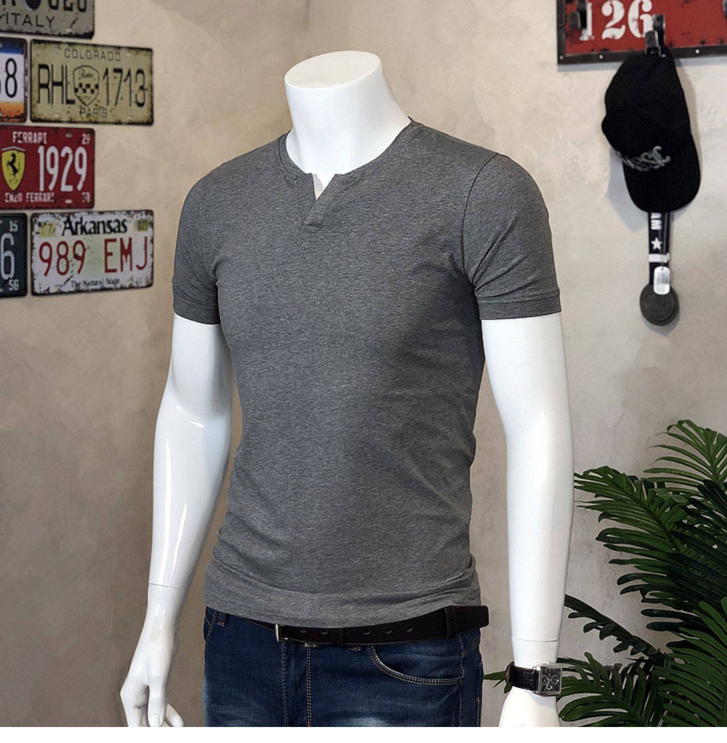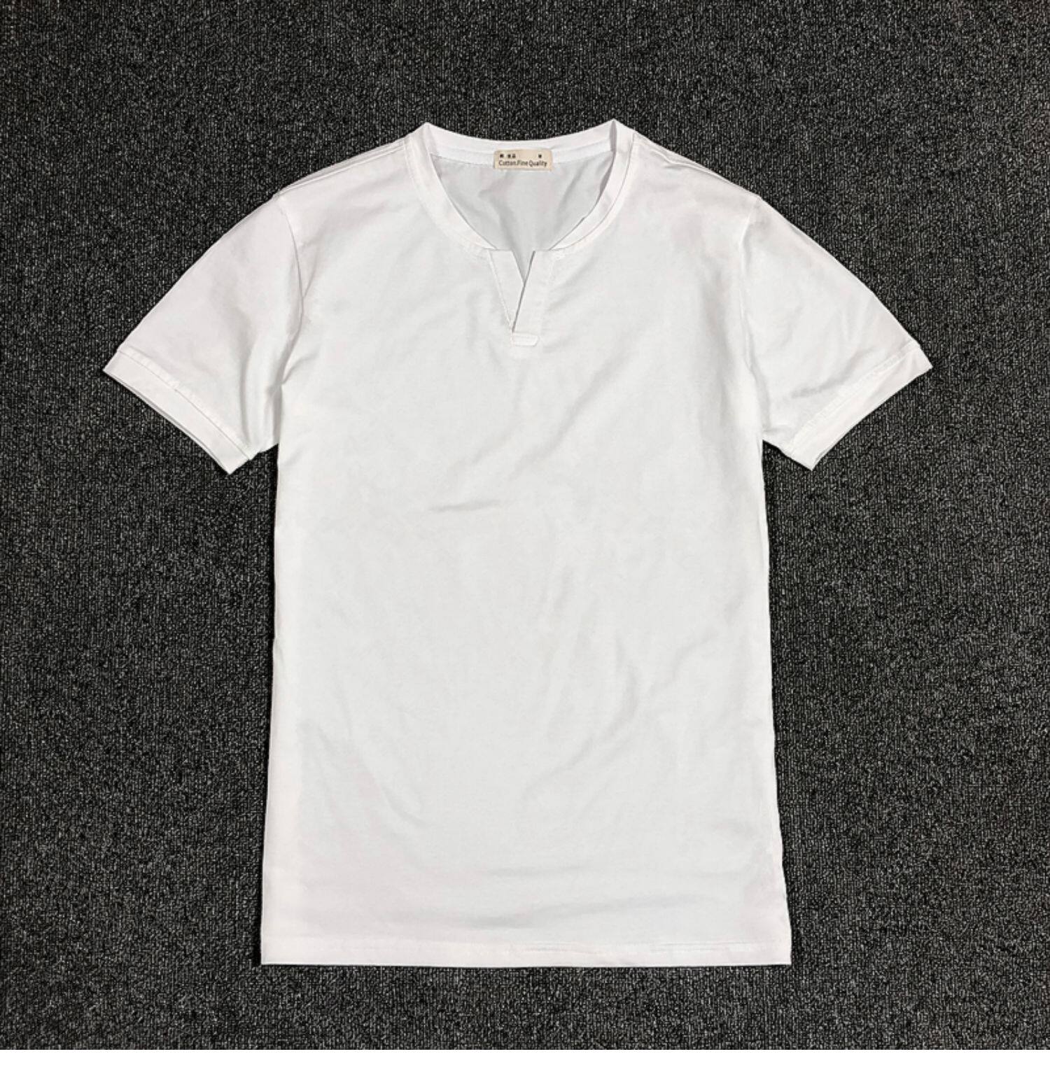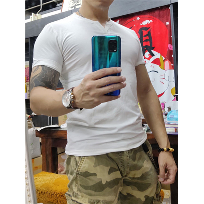 棉開V筒男士短袖亨利領美式復古硬漢純色T恤修身上衣簡約薄款高級