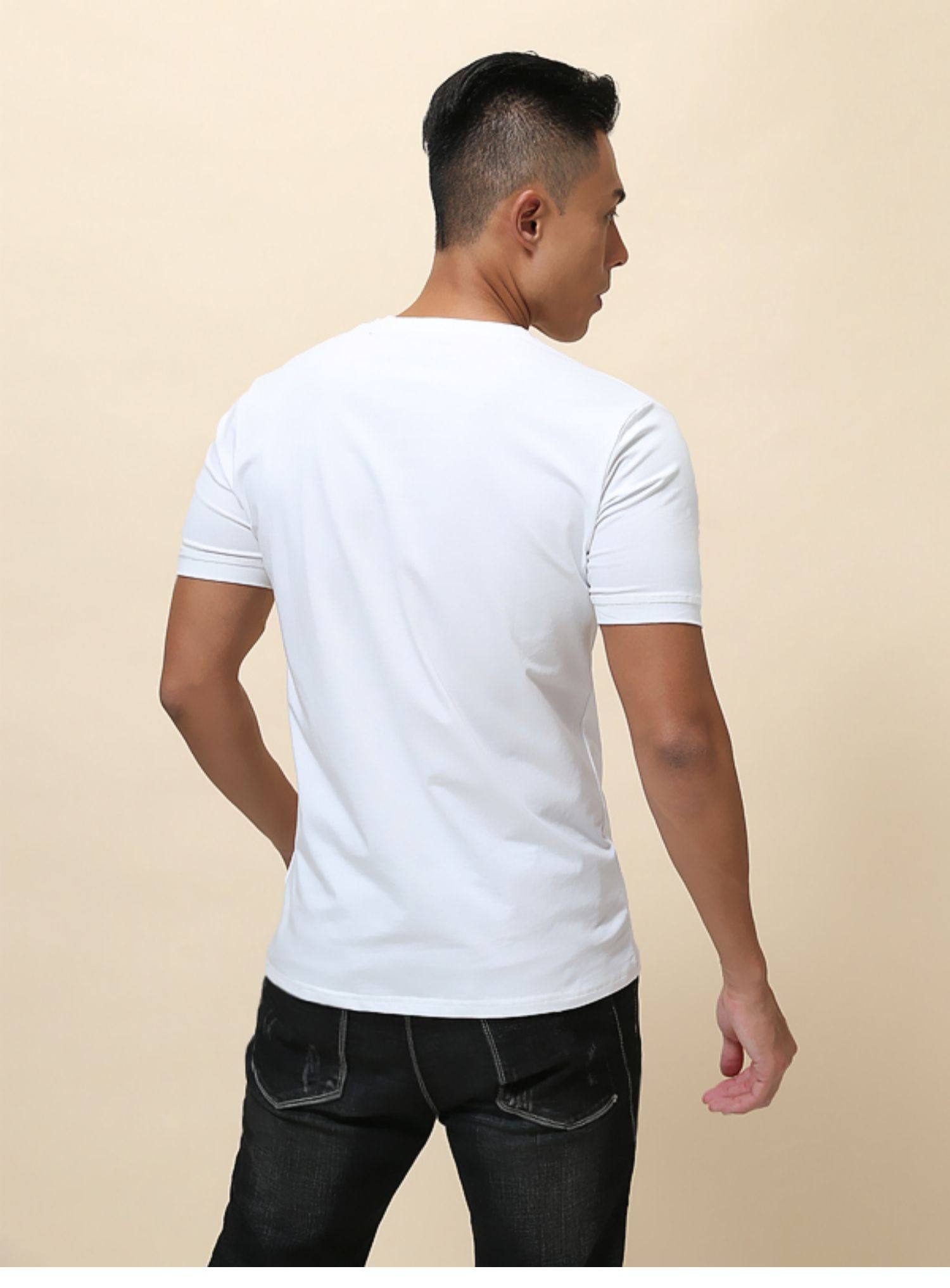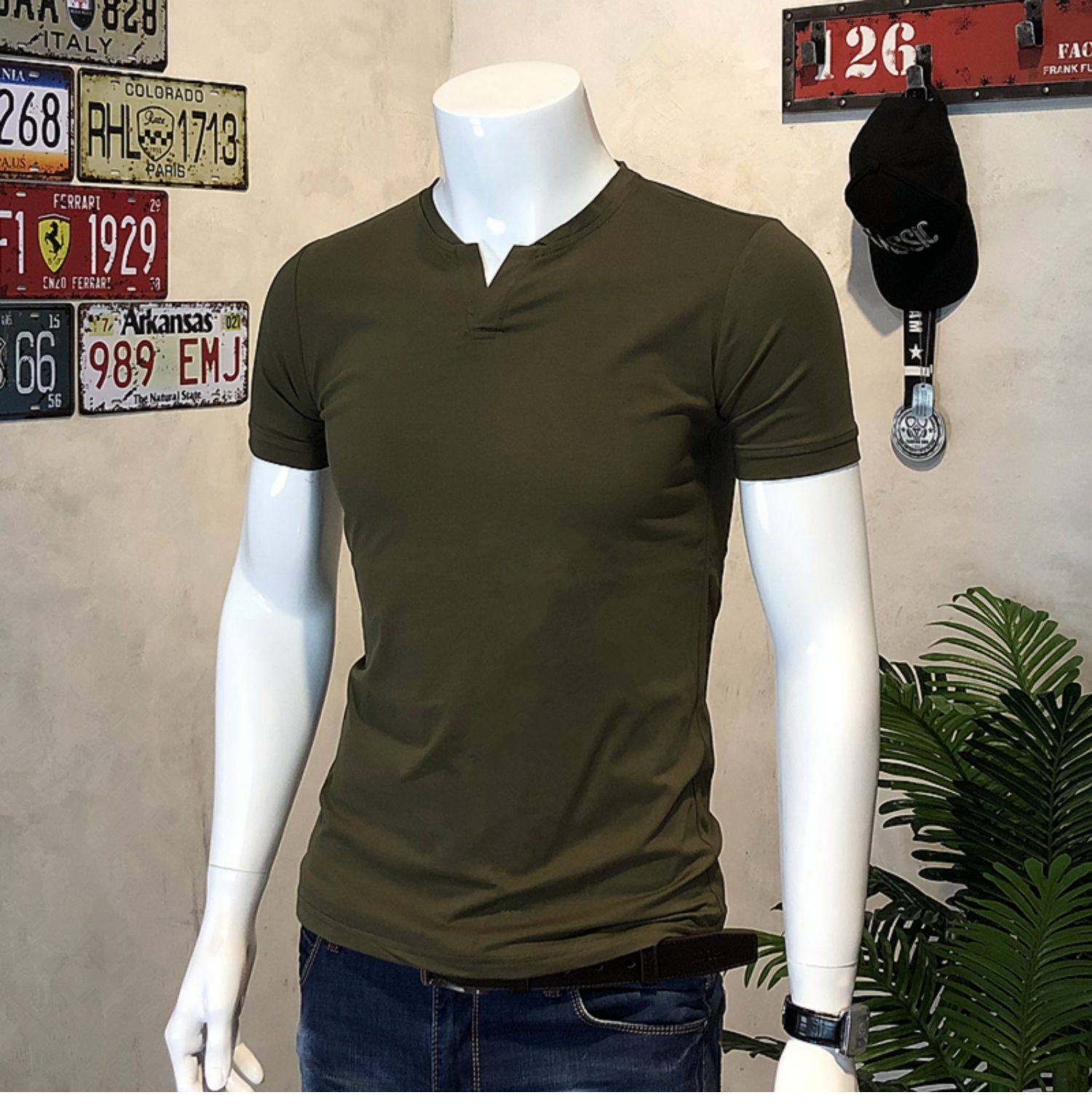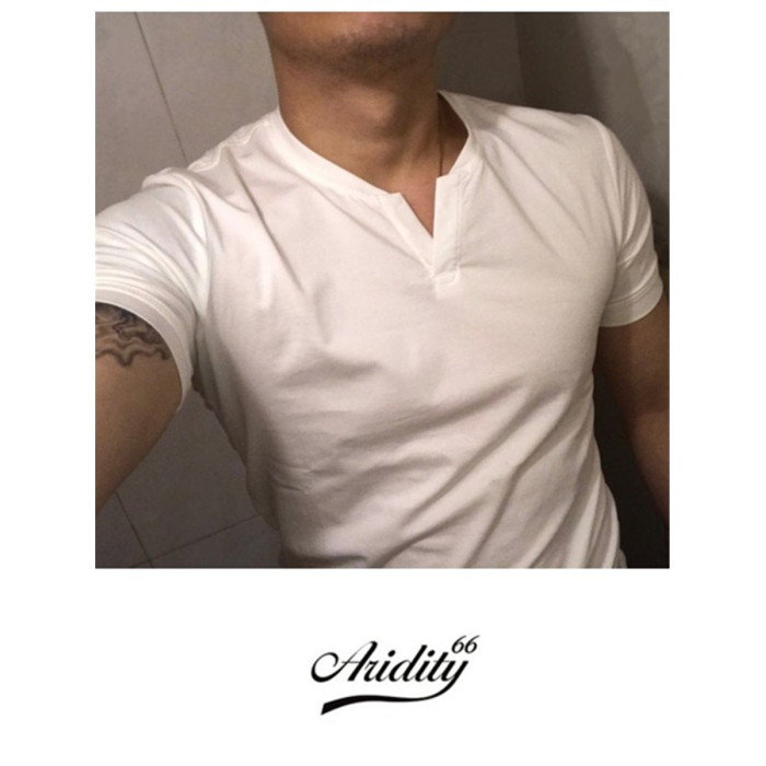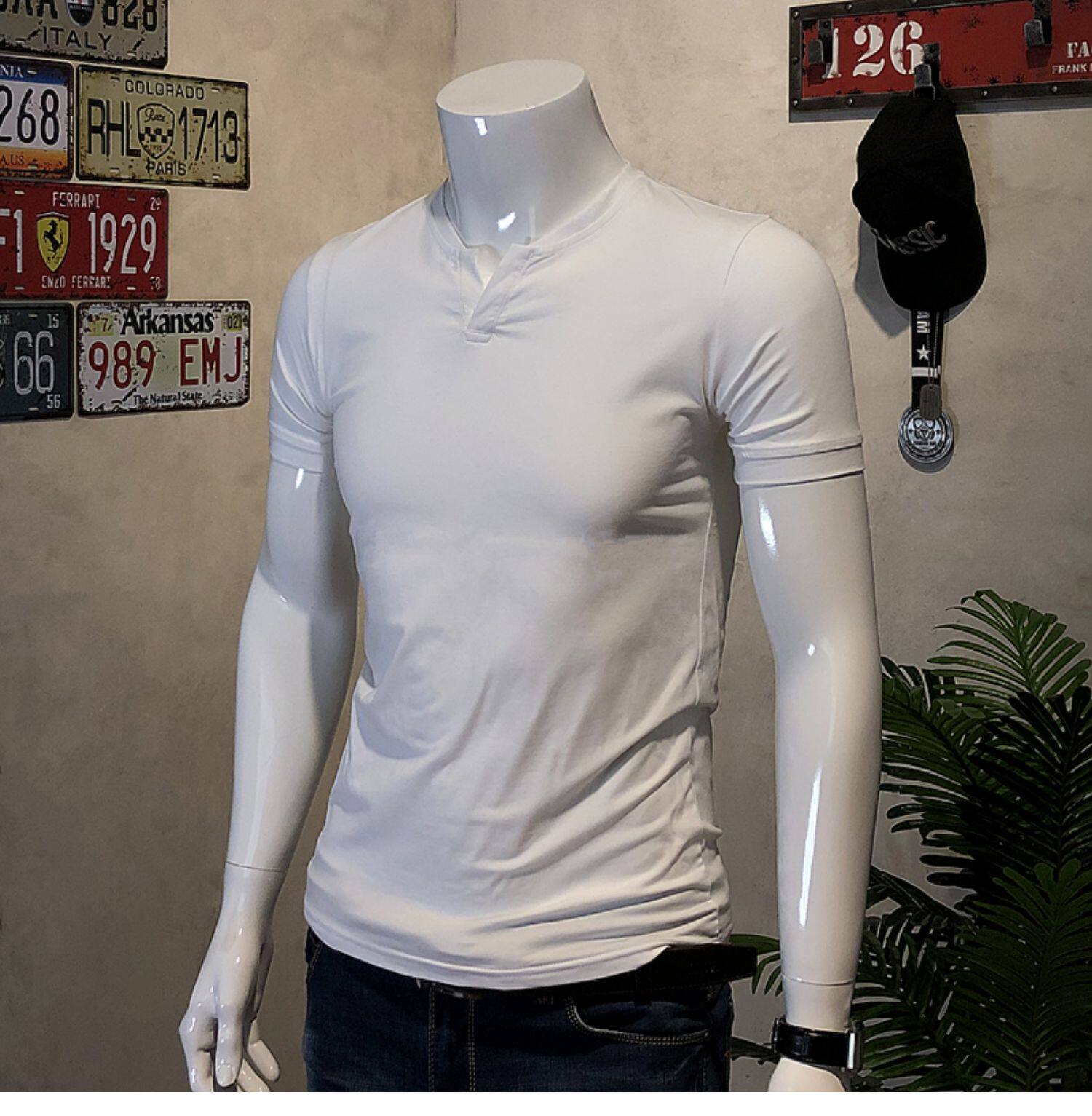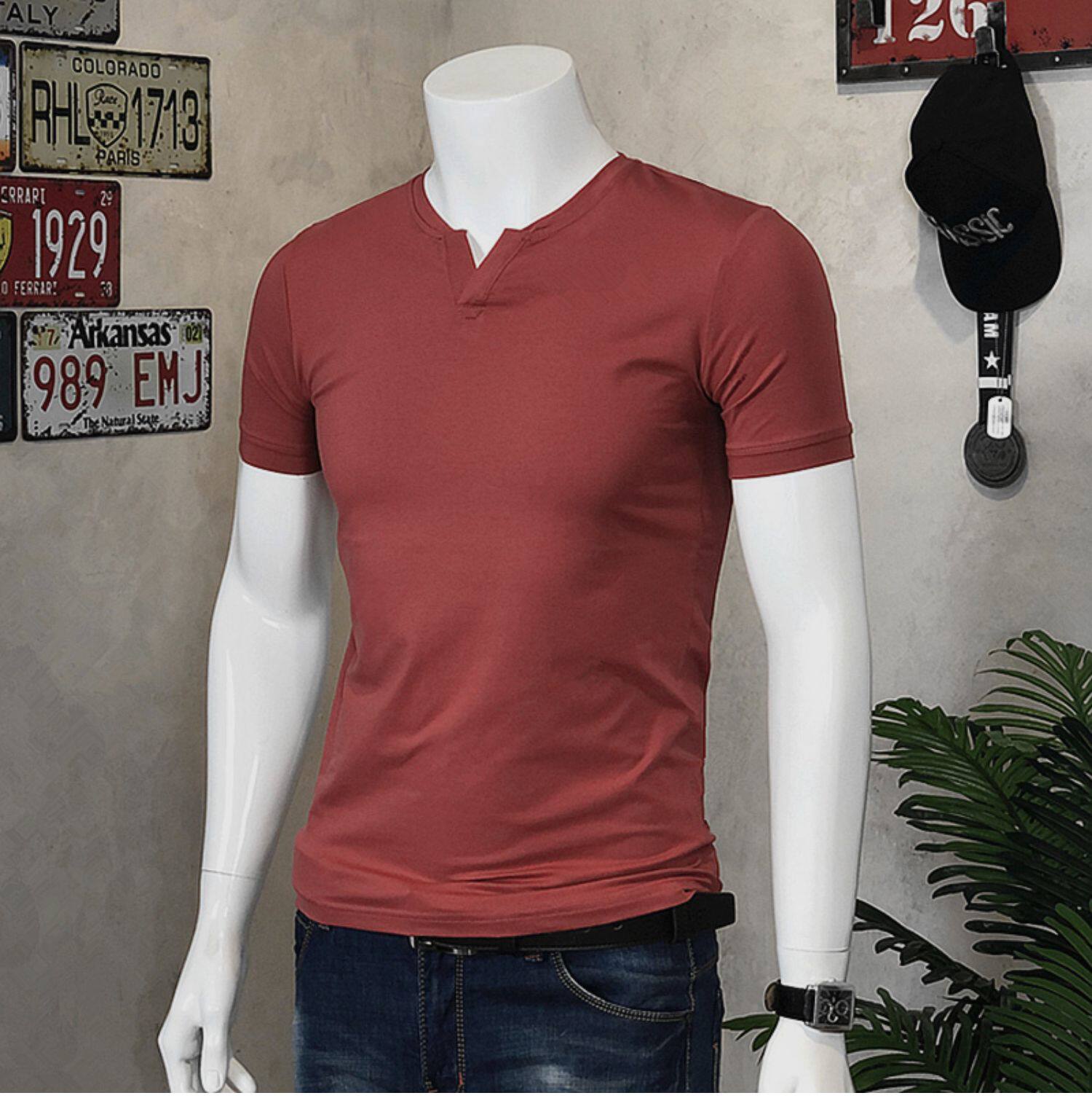 棉開V筒男士短袖亨利領美式復古硬漢純色T恤修身上衣簡約薄款高級