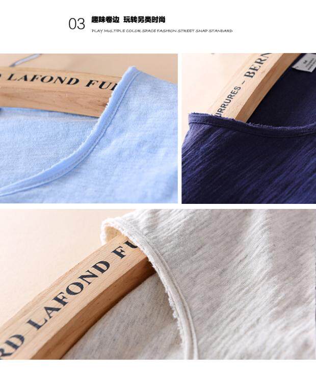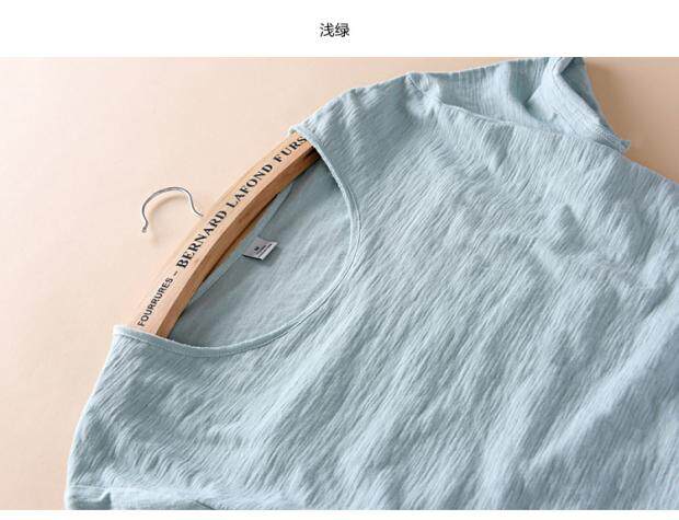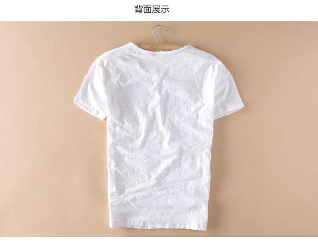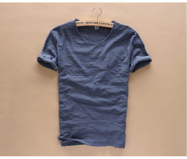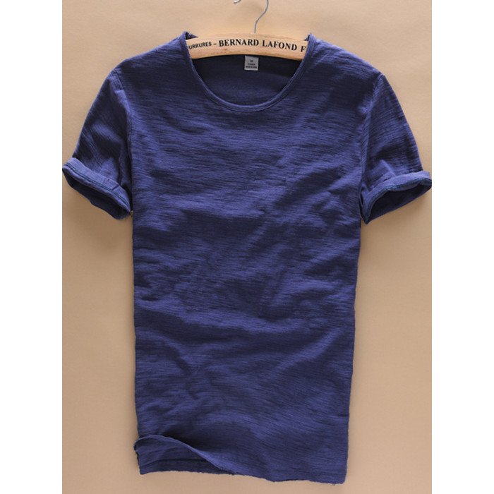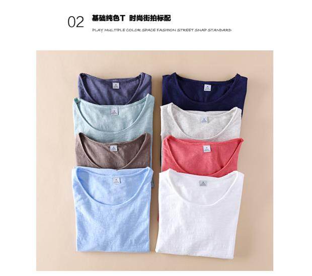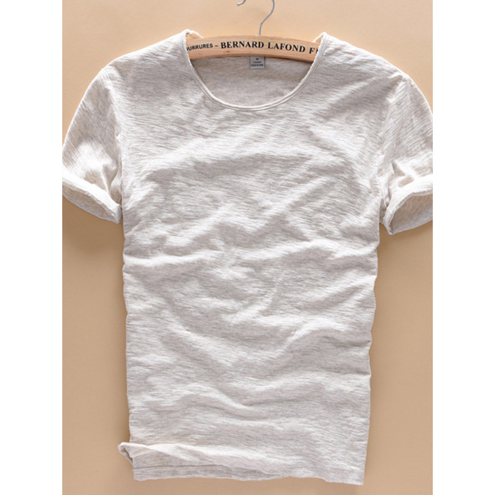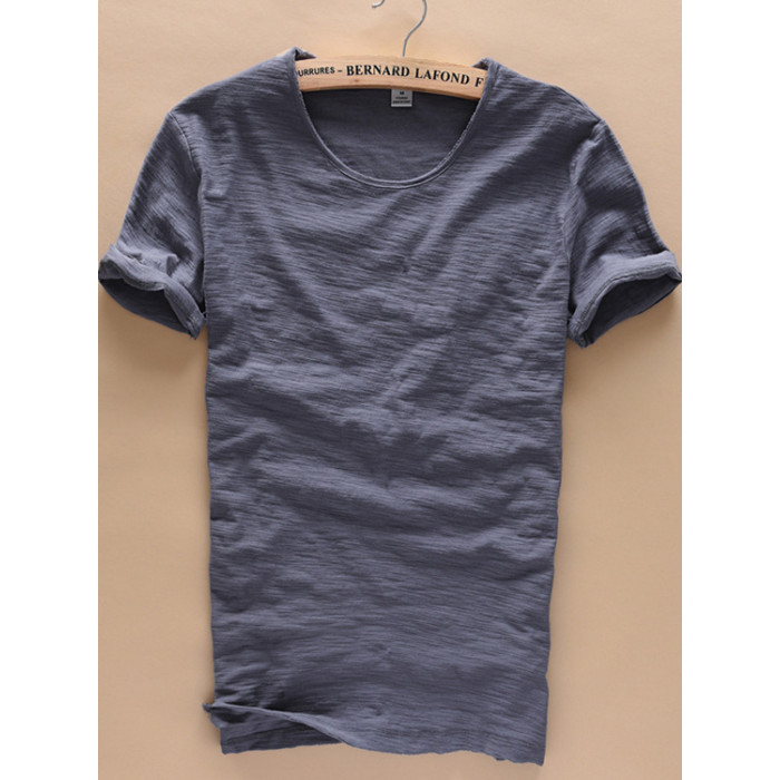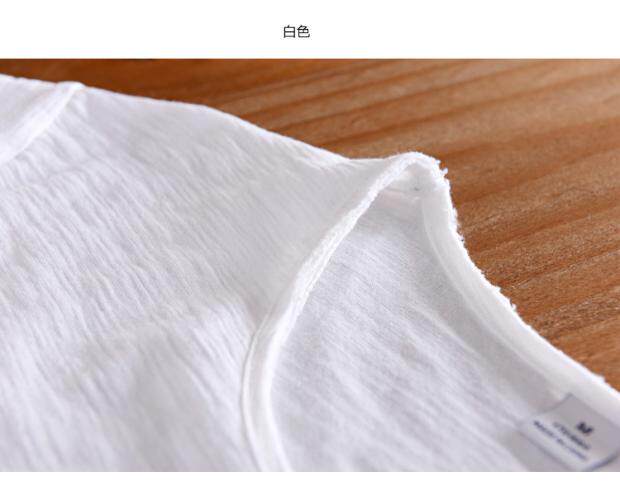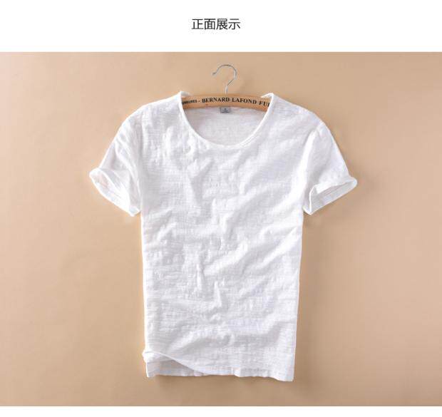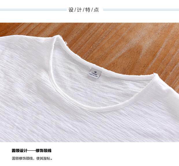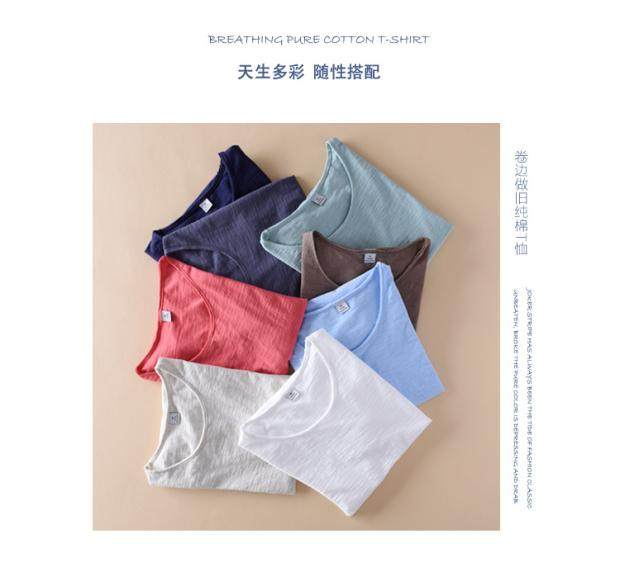 柔軟竹節棉短袖T恤男士休閒薄款日系做舊毛邊圓領修身純棉男t恤衫