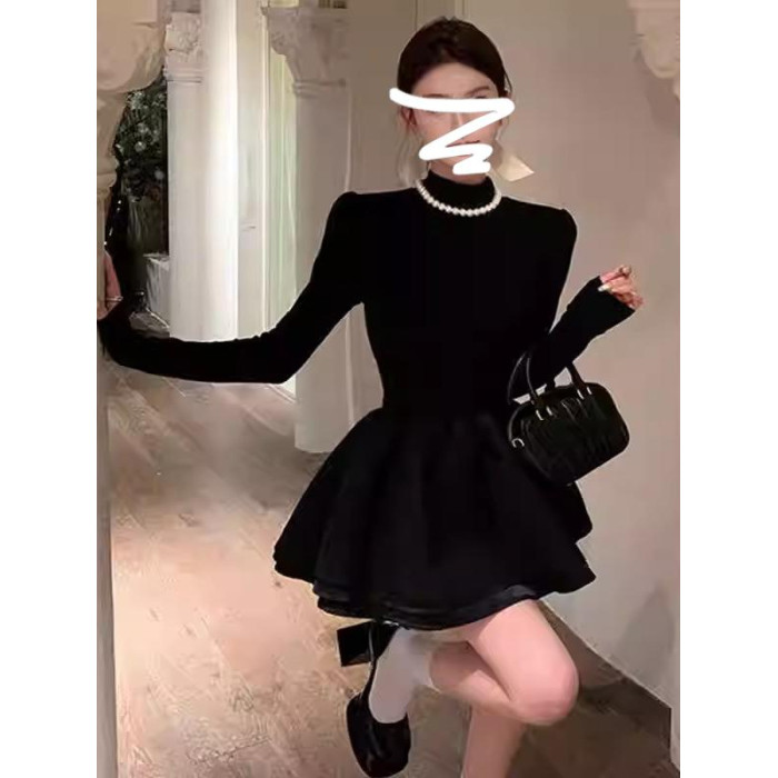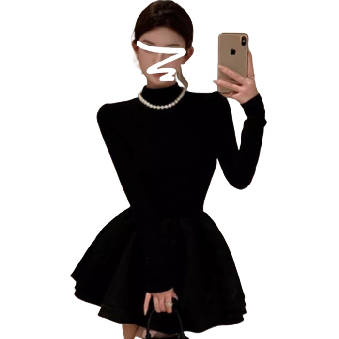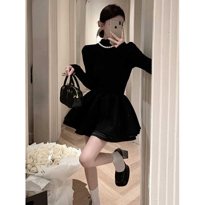 法式小香風長袖連衣裙女黑色赫本風千金小黑裙顯瘦a字短裙蓬蓬裙