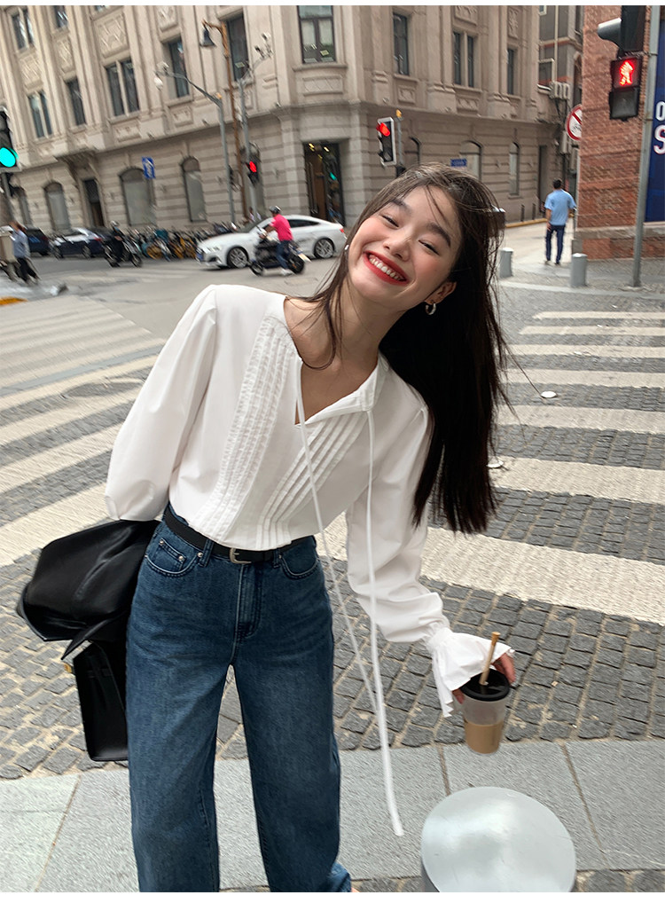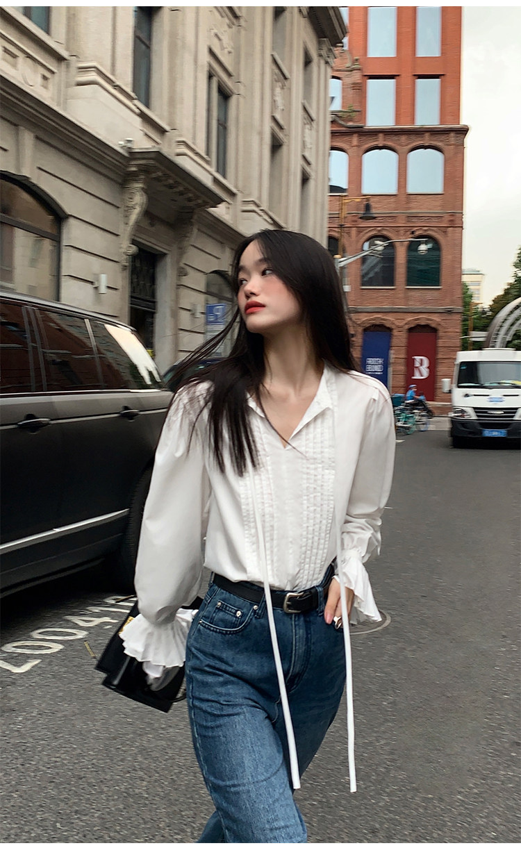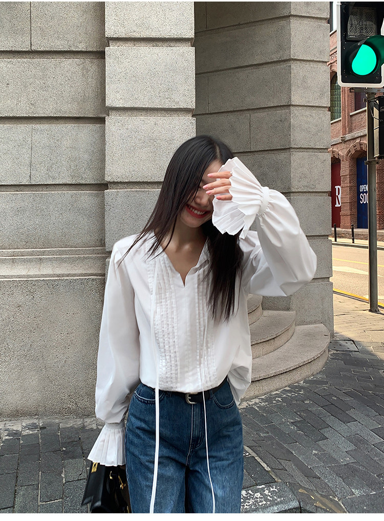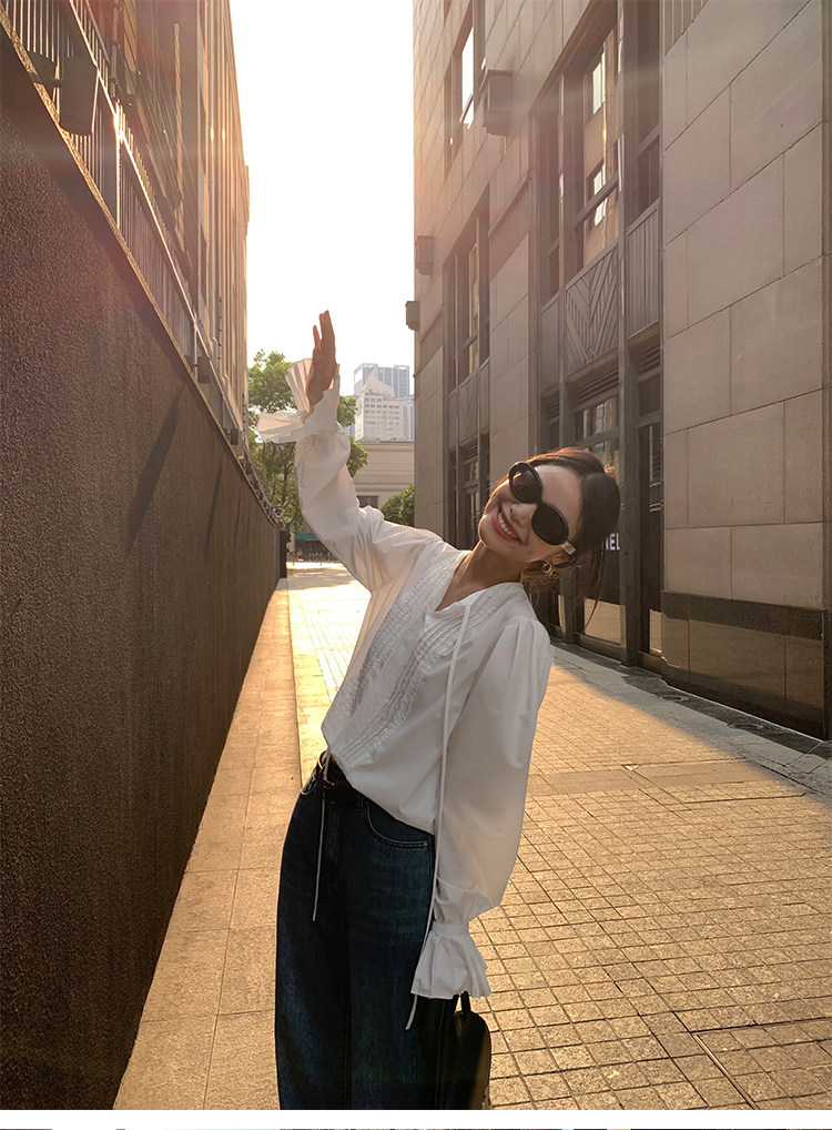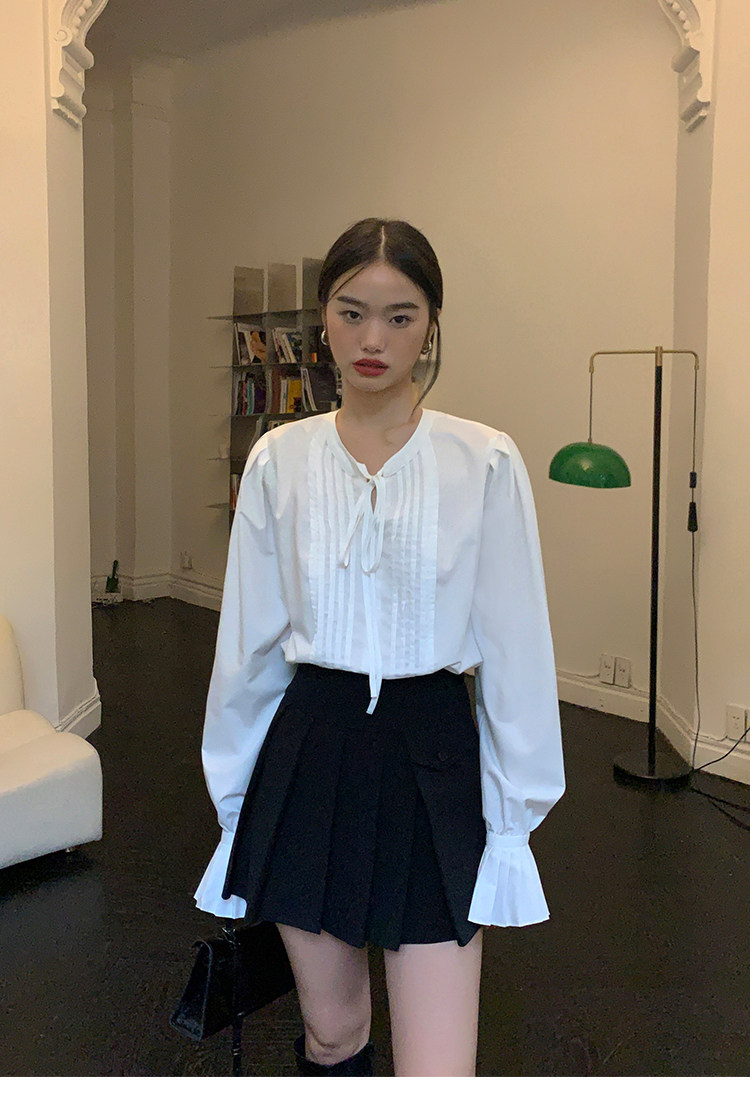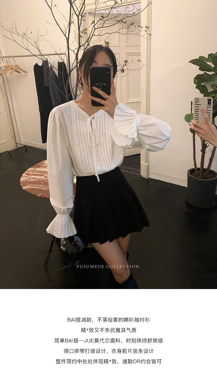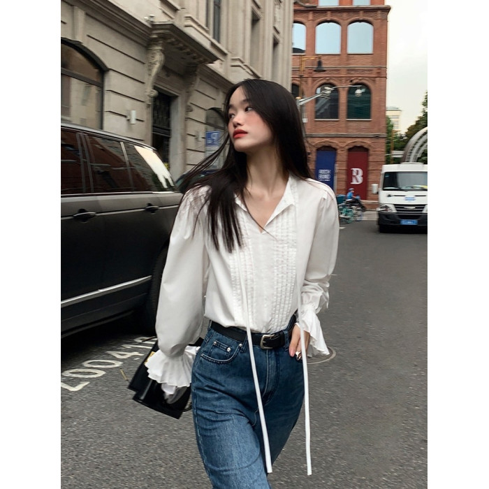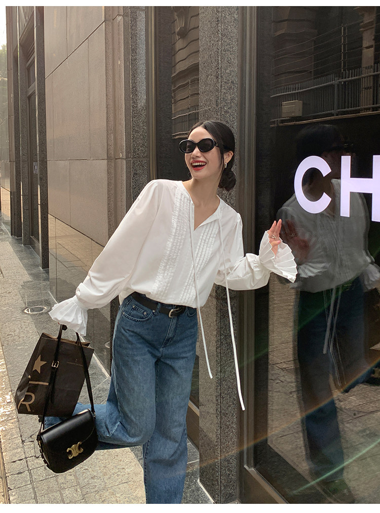 pusumede 法式v領白色襯衫女氣質高級感別致小衫喇叭袖系帶上衣