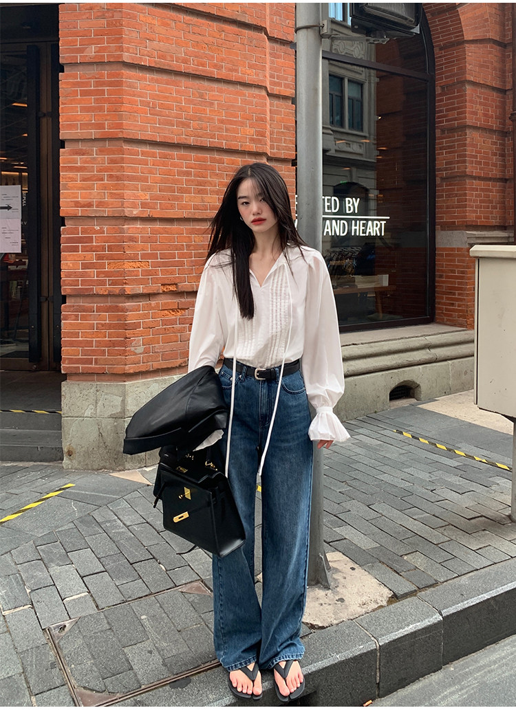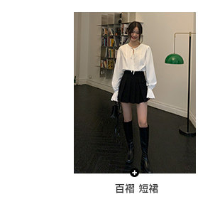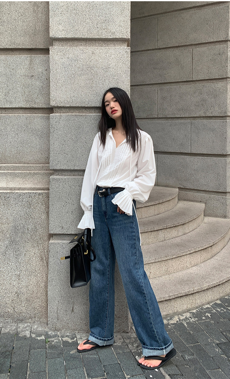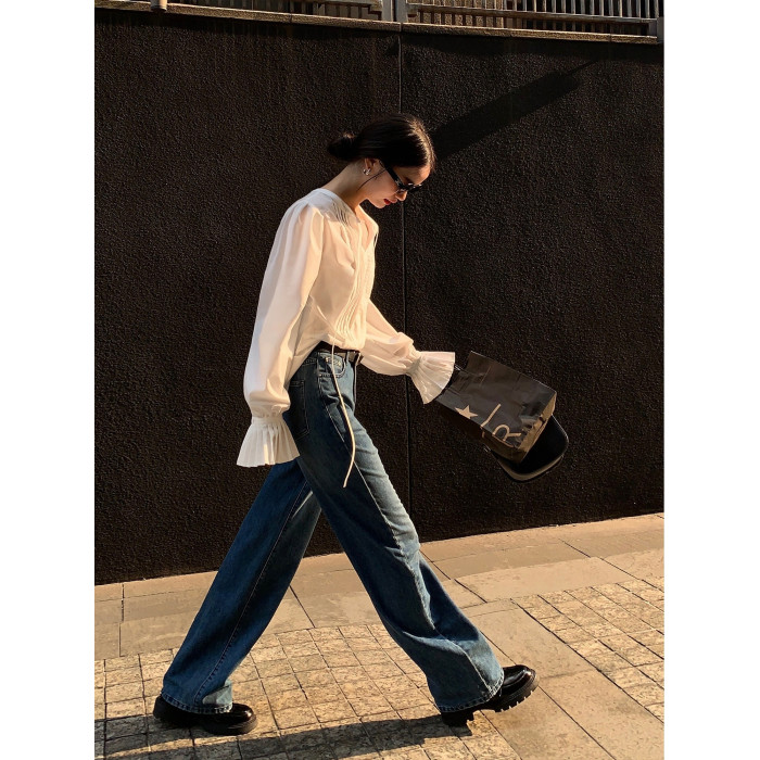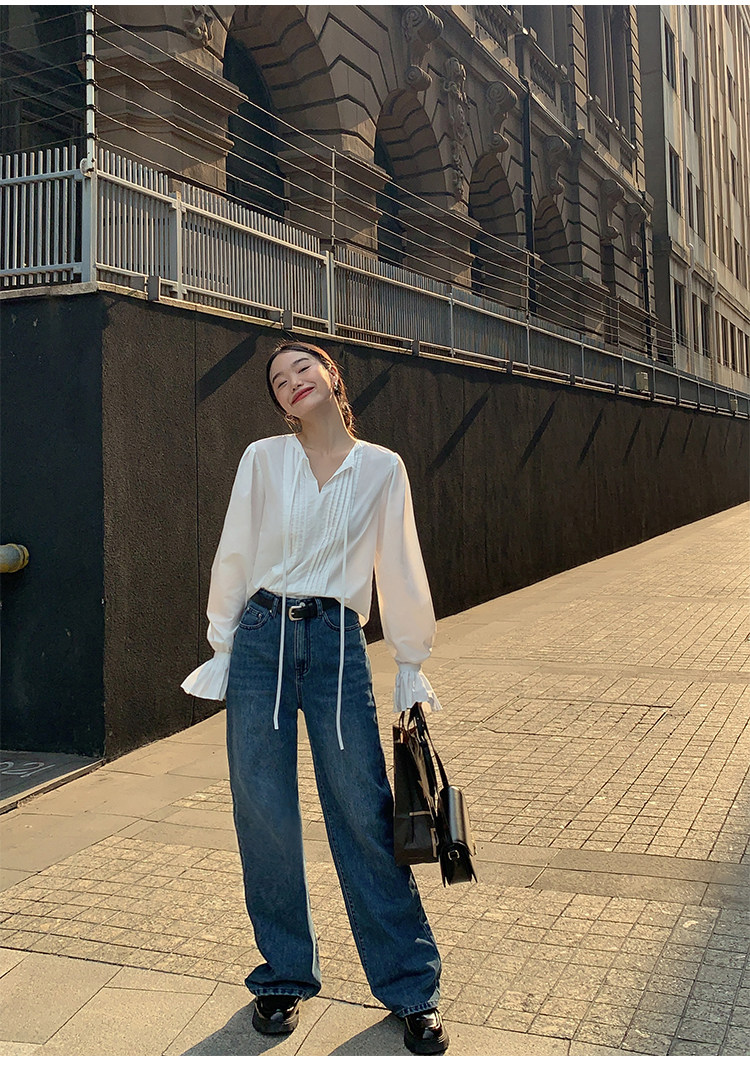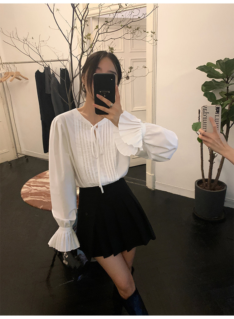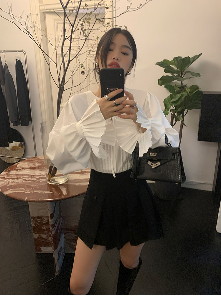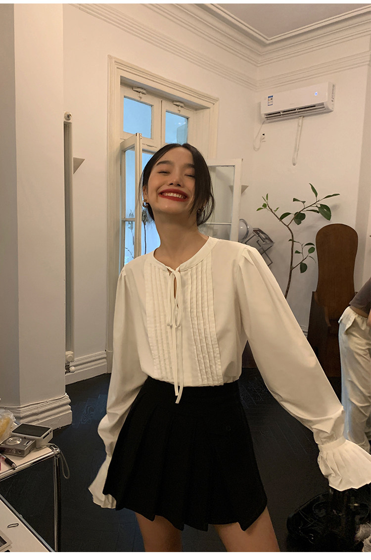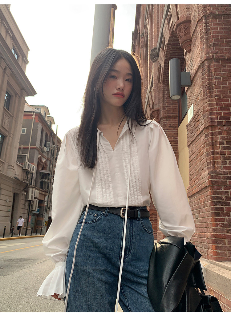 pusumede 法式v領白色襯衫女氣質高級感別致小衫喇叭袖系帶上衣