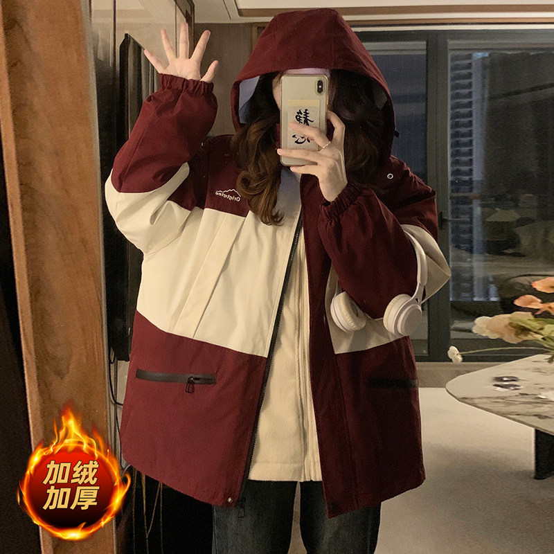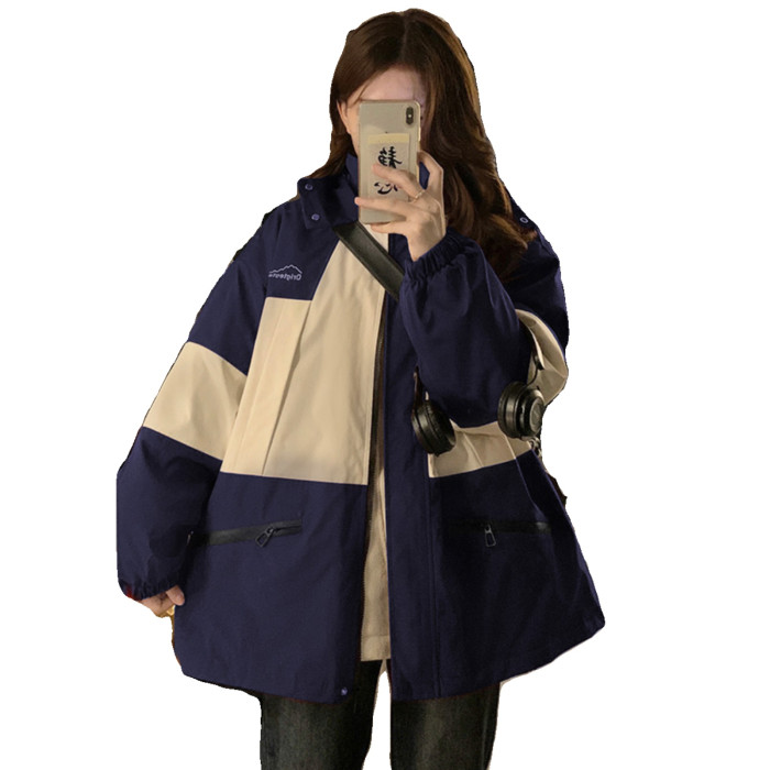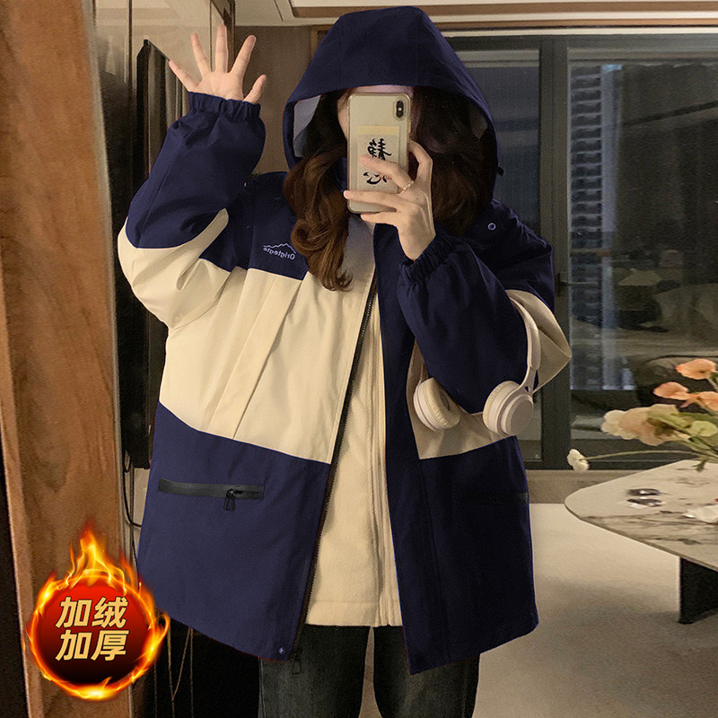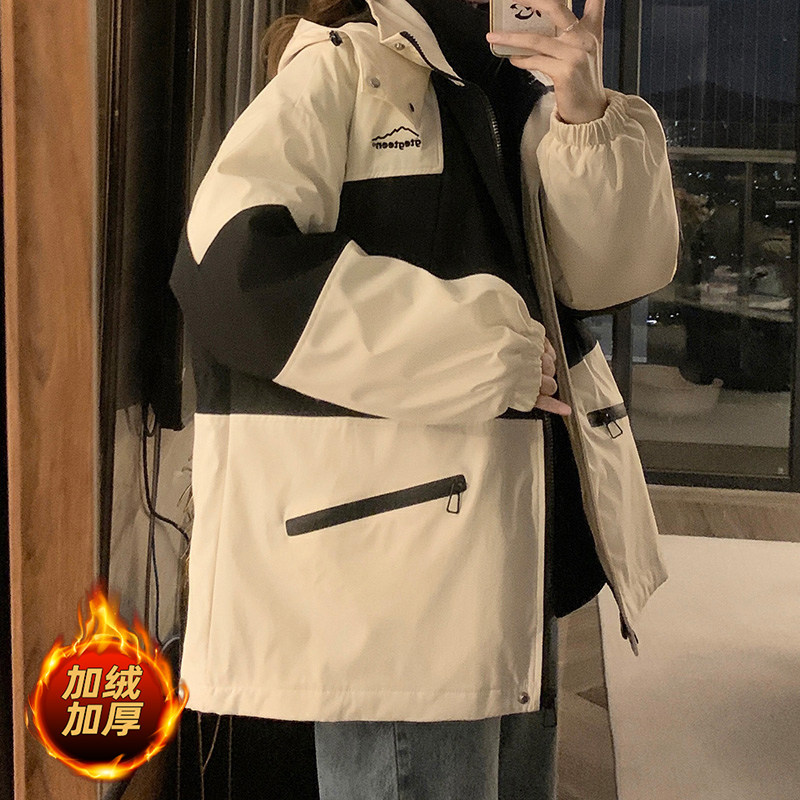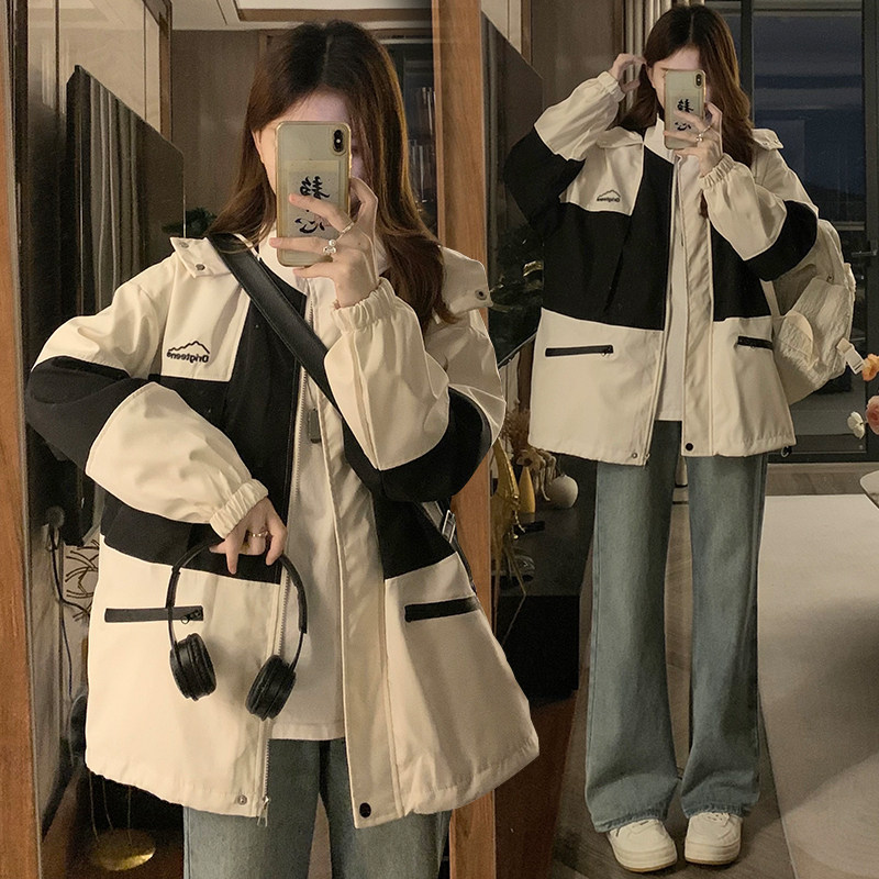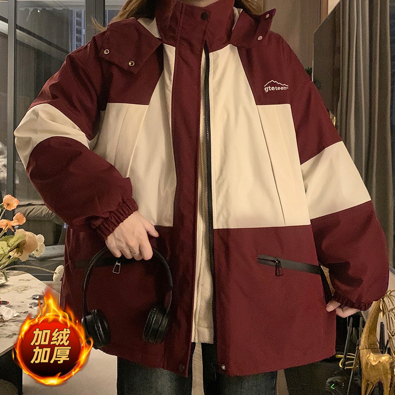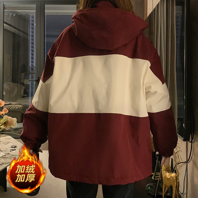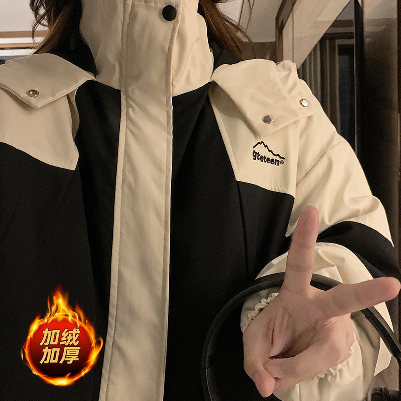 美式撞色沖鋒春秋外套男女秋季戶外登山棉服寬松連帽工裝拼色