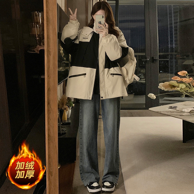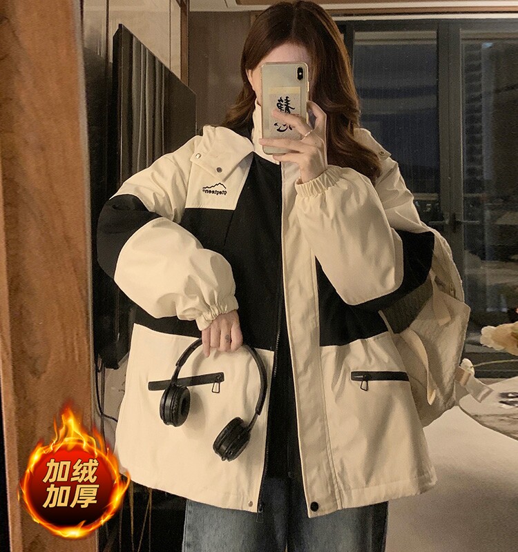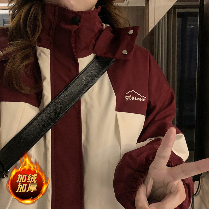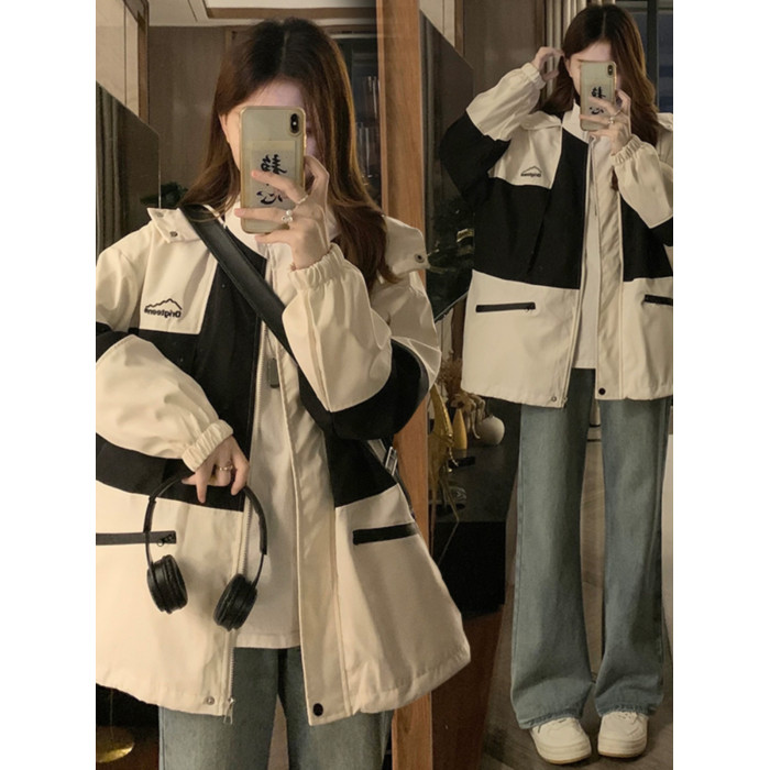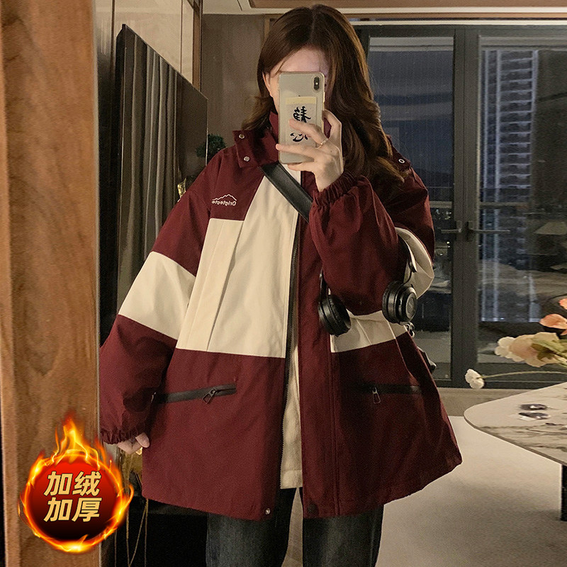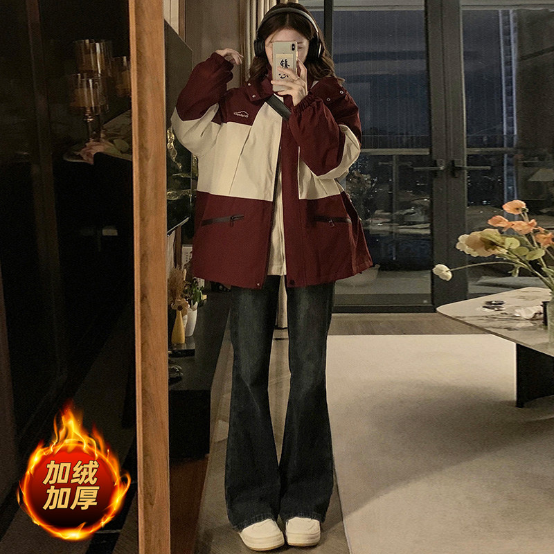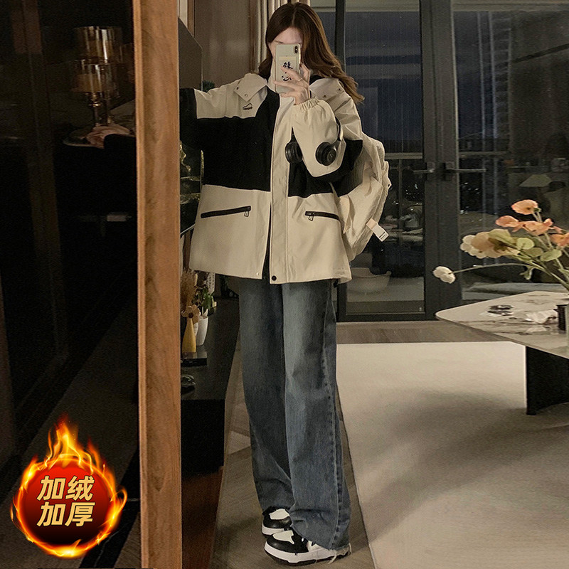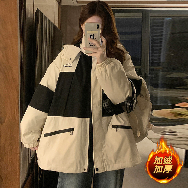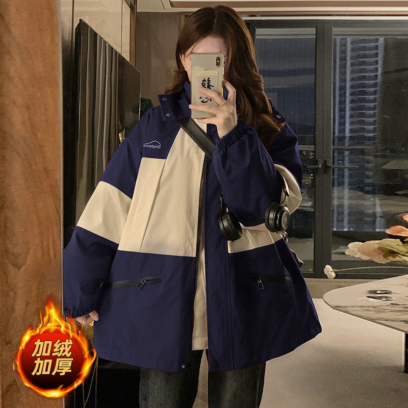 美式撞色沖鋒春秋外套男女秋季戶外登山棉服寬松連帽工裝拼色